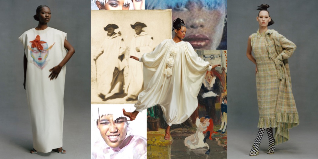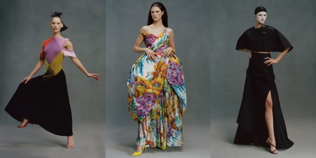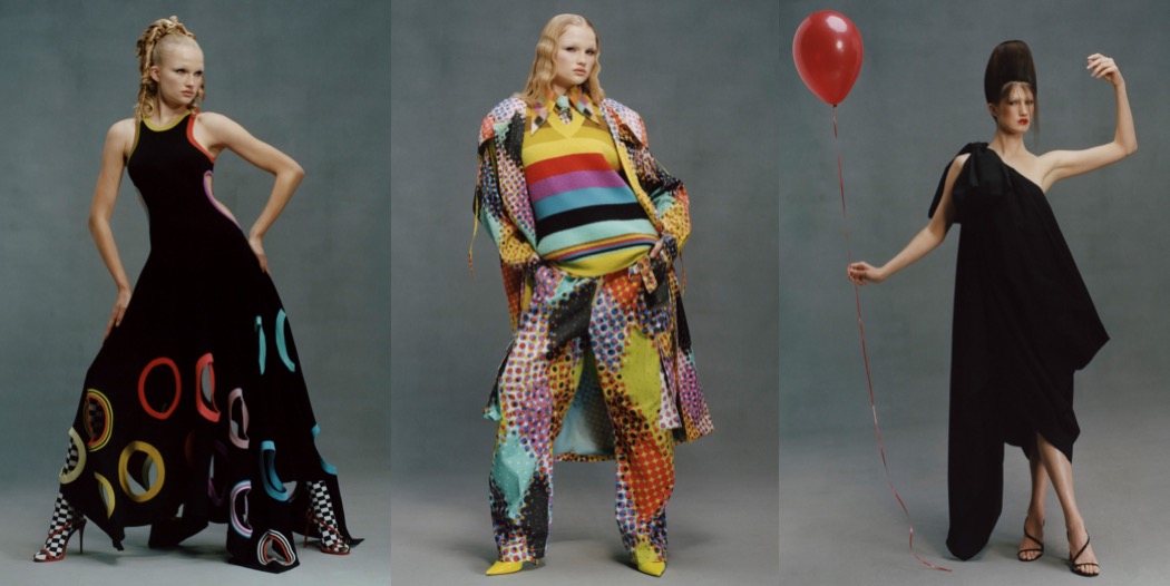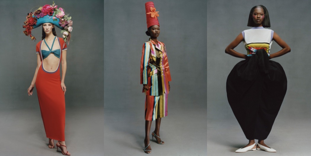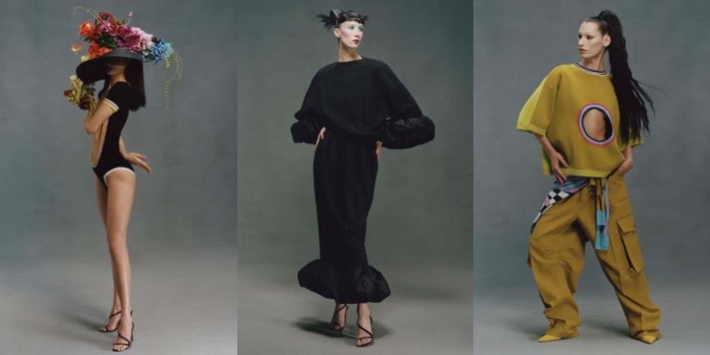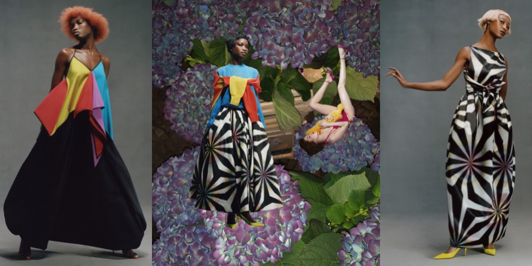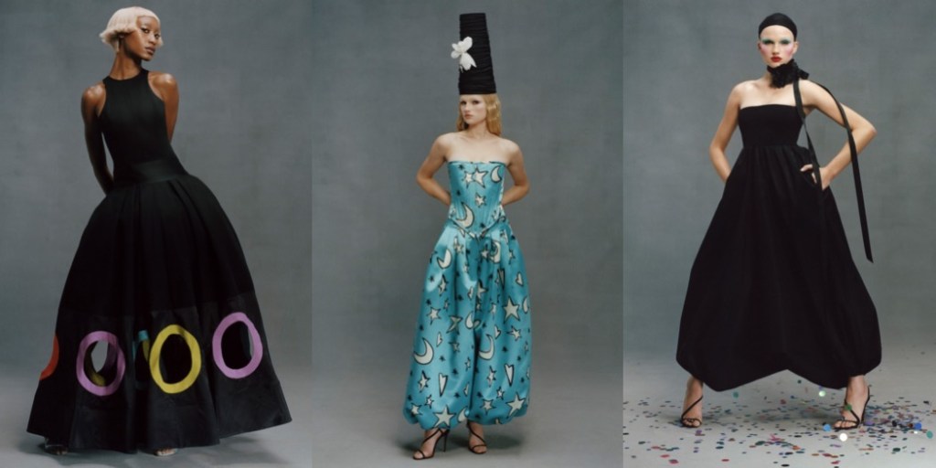 Christopher John Rogers, a designer for whom rainbow stripes are a defining signature, put together half a dozen looks for pre-fall 2023 devoid of color. The title he gave the collection, “It’s My Party and I’ll Cry if I Want to,” offers a hint about his new direction. Having captured the fashion world’s attention, Rogers seems to have set out to upend expectations. “What I’m after is autonomy, the ability to do what I want,” he said. “The idea of play is paramount.” Cue the plastic clown noses and the towering silk clown hats created in collaboration with the milliner Piers Atkinson. There’s even a Pierrot jumpsuit in the first grouping, with silk flowers in place of the characteristic pompons, though this isn’t so much a novelty as it is a callback. A pre-pandemic runway show closed with a different take on the look. In the end, this wasn’t the volta face that those first looks augured. It’s just as colorful as any other CJR lineup, just as extroverted, but there is a commitment to pushing at the limits of his well-known signatures. In the studio, Rogers pointed out the porthole cutout in a boxy knit top bordered with the rainbow stripes – “it takes a lot of work to get it to lay flat,” he explained. Also complex: the sweaters that hybridized two crewnecks into one, and a sweater dress with both long sleeves and arm slits. The playfulness has a purpose; those knits can be worn in multiple ways. And the experimentation is balanced by an easy-wearing sensibility. Rogers’s new suits are oversized and unstructured; cut from recycled polyester in zesty shades of grape and crawfish, they’re the fresh, modern flipside of the more formal tailoring on his June runway. Rogers doesn’t want to get boxed into any one category, but evening wear, inevitably, is his calling card. With award season ramping up, there’s bound to be some incoming calls for the tulip gown in floral printed faille and a harlequin embroidered black column with pouf sleeves, both of which nod with flair back to mid-century couture shapes.