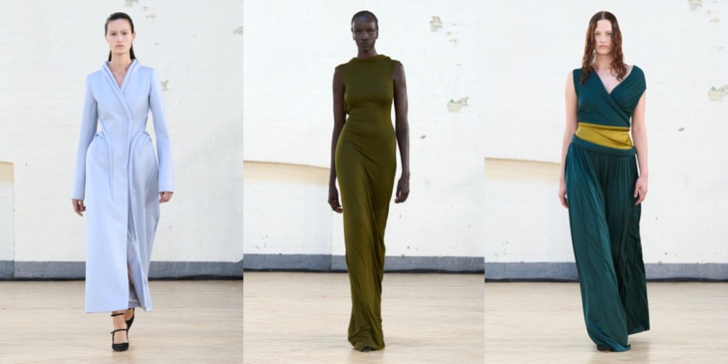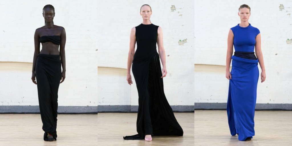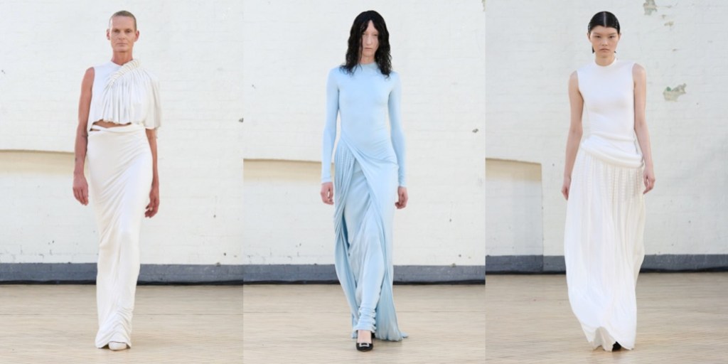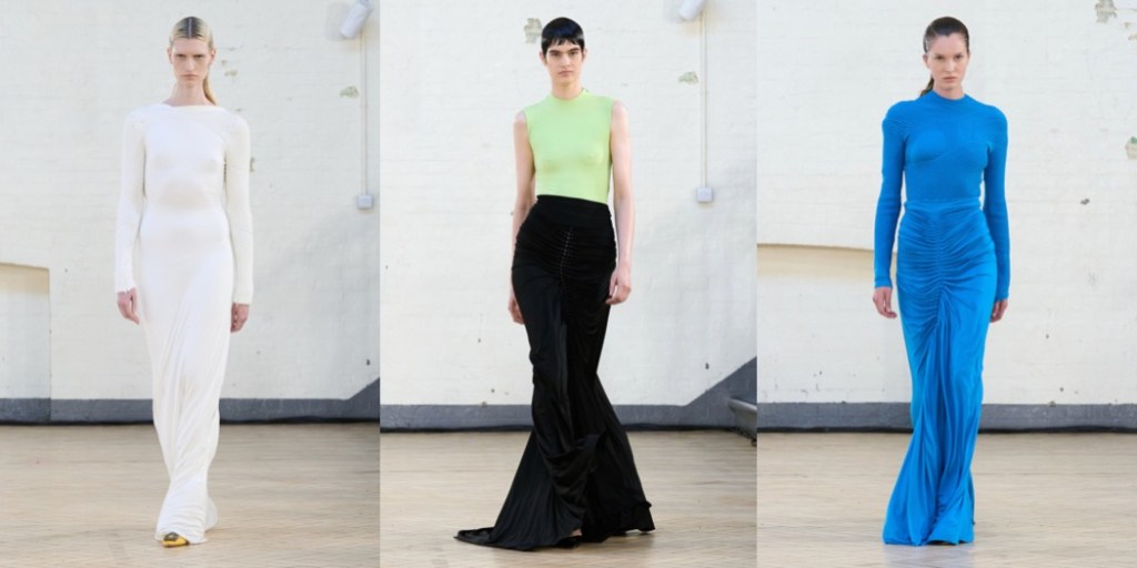 For his third showcase at Fashion East, the sensational Standing Ground designer Michael Stewart doubled down on his statuesque yet ethereal aesthetic in a collection – entitled Tethys, a reference to the prehistoric Tethys Sea which was an early ocean formed about 35 million years ago when most of the countries of the earth were still one large landmass- made from offcuts and leftover fabrics. This time, the palette was inspired by the pastoral landscapes of Ireland, featuring shades of powder blue and moss green. There were column dresses with ruched detailing adorned with intricate beading. “While I’ve developed something of a distinct aesthetic that’s a combination of technique and form, this season’s pieces have a certain purity and softness, while maintaining something of a sci-fi vibe,” he shared ahead of the show back in September. Ever since founding Standing Ground in 2022, Stewart has strictly dedicated himself to the canvas of the evening gown. He is a designer who knows the importance of a sharp fold and a glamorous wrinkle. Naturally, his spring-summer 2024 outing delivered that in abundance. The construction of these pieces was exquisite. It will be hard to forget the cobalt blue gown constructed from a single piece of fabric or the green crushed velvet number that genuinely made that notoriously tacky fabric look couture. Of course, the beaded accoutrements were the stars of the show. The show notes described them as “Xenomorphic coils, conjuring subliminal techno-erotics and a gothic posthumanism.” They encrusted the dresses like barnacles, or a H.R. Giger-style exoskeleton.