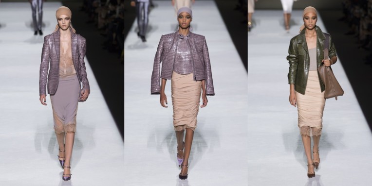 After his over-the-top, kitschy-chic fashion show back in spring, Tom Ford’s spring-summer 2019 collection felt like a colour detox mixed with self-reflection. Black, white, beiges and pale lilac were the leading shades, while the entire line-up took us down the memory lane of Ford’s career. For a moment, we all experienced again his 90s momentum at Gucci, that was all about refined sexiness and confidence – words that match the designer’s current work with the same precision. To a surprise of many, there were as well references to the few year tenure at Yves Saint Laurent, the period that shaped Tom’s aesthetic into a more sublime, after-dark vision of women.