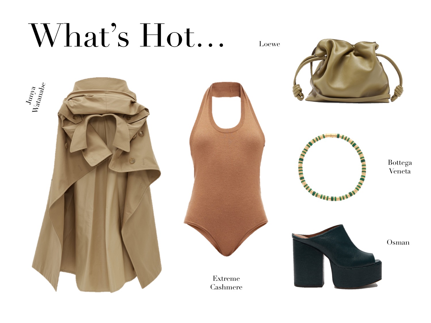 Colour Pop. Unpredictable colour combinations always lift the mood. Can’t go wrong with an Extreme Cashmere cardigan in bold orange or the already-cult Bottega Veneta intreciatto-weave cluth in refreshing lime.