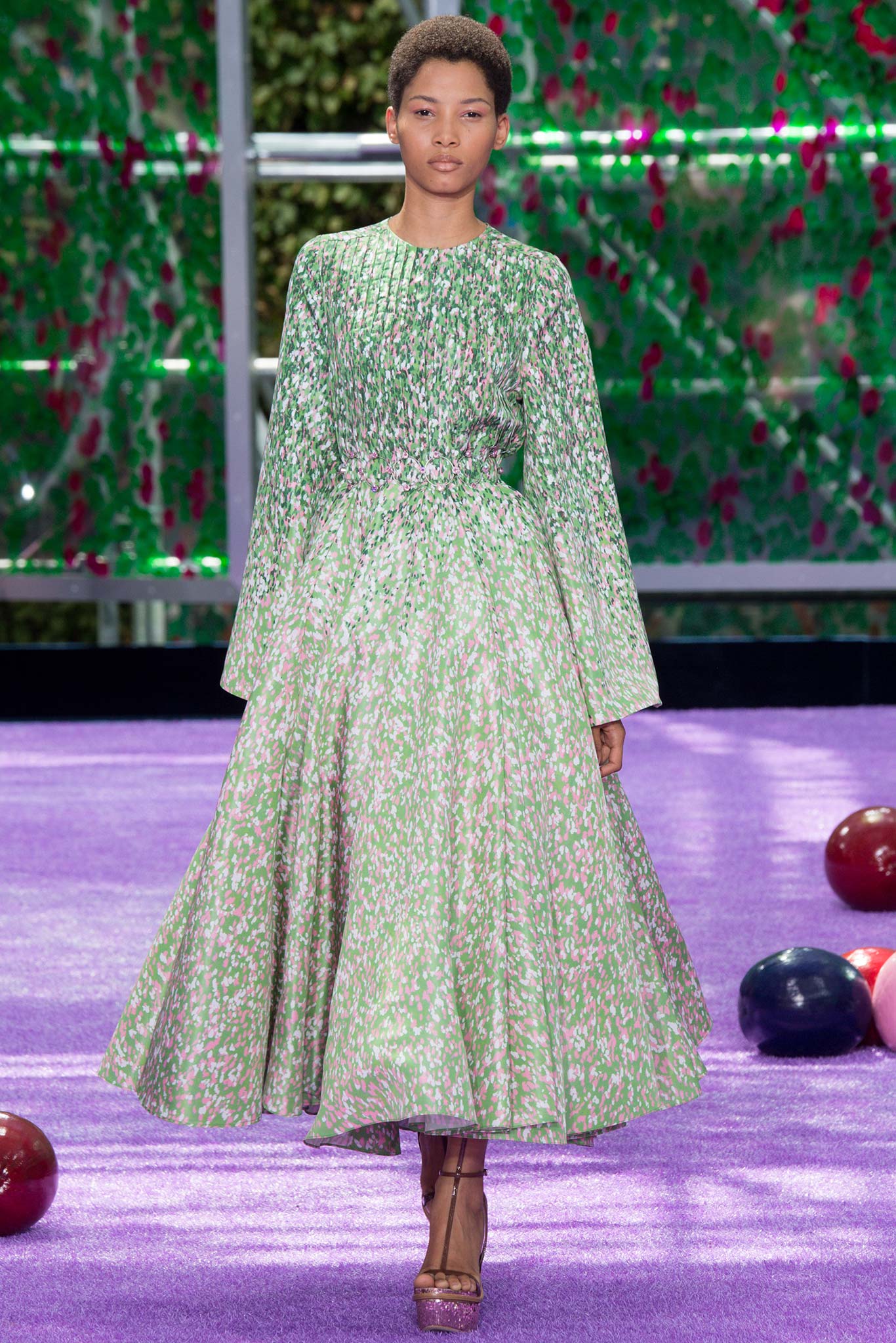 The venue. Raf Simons described the stunning set for Dior’s couture show as part church, part garden, part nightclub in Ibiza. The pointillist-painted panels could have been stained-glass windows or flowers. The purple carpet worked perfectly well as a psychodelic, quite fantastical element. In fact, a hallucinatory vibe penetrated the entire presentation. But the biggest fascination was caused by the pastel shaded melons, which were scattered around the place. Hieronymus Bosch’s Garden of Earthly Delights clearly appeared in everybody’s mind.