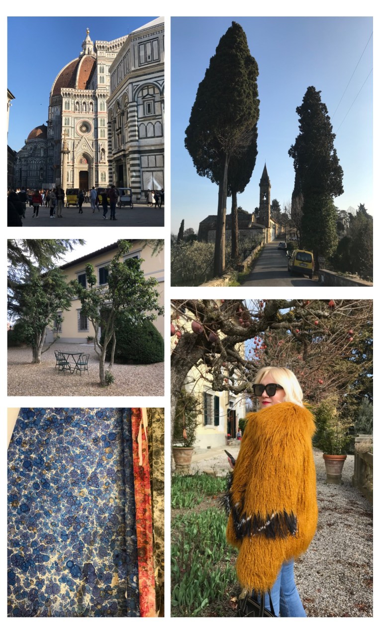 Baptistery on Piazza San Giovanni; the street that lead to our villa, hidden in the Tuscan hills just two kilometres from Florence’s city centre; patio of the villa; marble painting at Il Papiro; my mum, wearing a Dries Van Noten fur jacket.