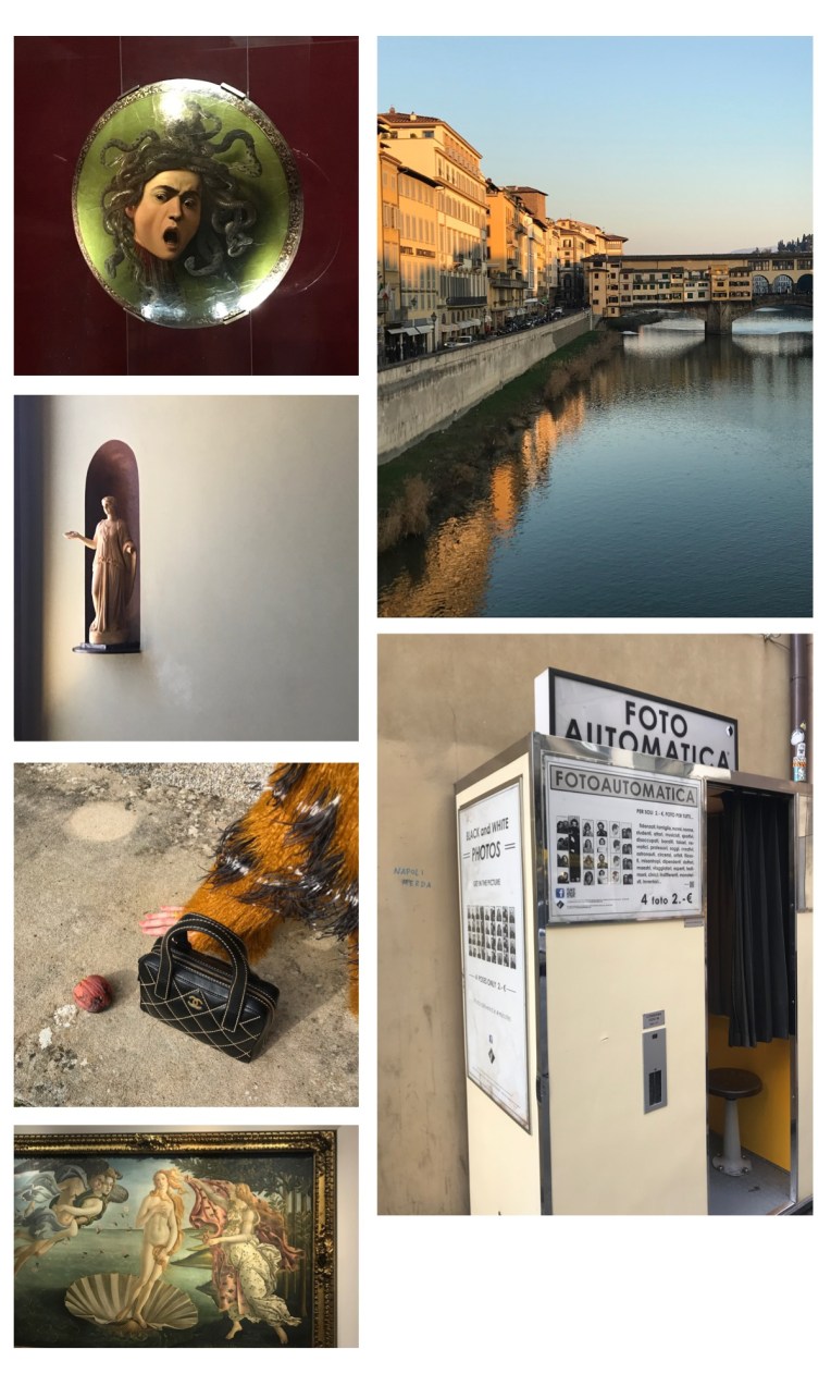 Caravaggio’s Medusa at Uffizi Gallery; Ponte Vecchio (tourist-free as well); a sculpture detail from I can’t really remember where…; another vintage from my mum, 90s Chanel; a street photo booth near the river; Botticelli’s Birth of Venus at Galleria Uffizi – it might cause a heart attack.
