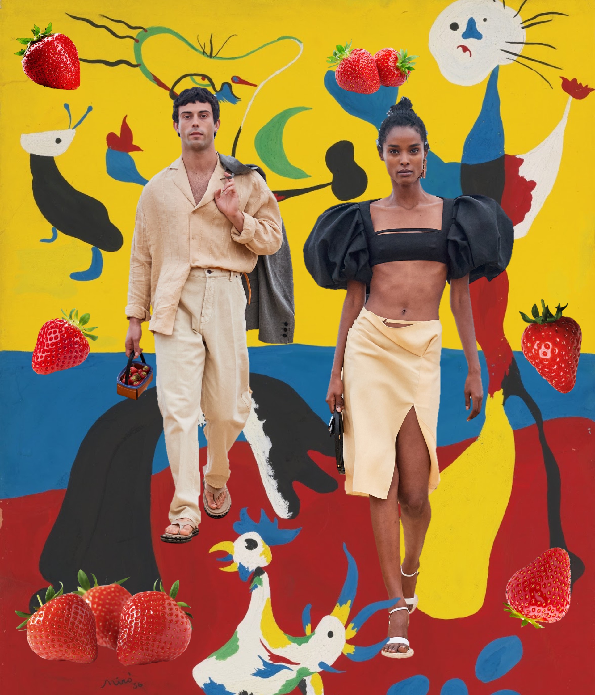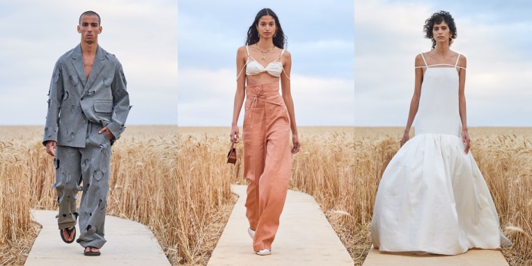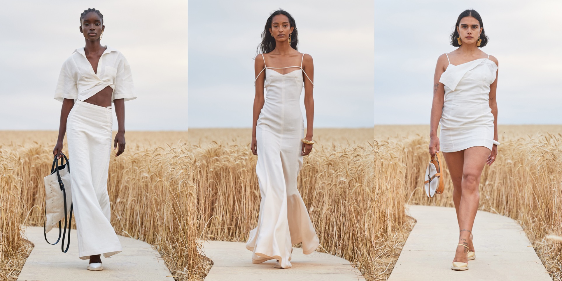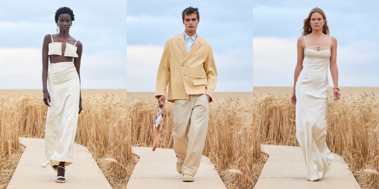 After weeks of digital presentations, Jacquemus‘ spring-summer 2021 IRL show was a truly heart-warming sight. An audience of 100 guests – mainly French press, house friends and family of Simon Porte Jacquemus – were ferried to a gently rolling wheat field near Us in the French Vexin Regional National Park, about an hour outside Paris. After hundreds of Instagram posts, you surely know what the venue looked like. It was a visual dream, a bit like a more sober sister of last year’s lavender field fantasy. Before the lockdown hit France, the designer had been in touch with the dancer Alexander Ekman. Needless to say, everything changed at that point, but the reference remained. During a pre-show interview, Jacquemus said he wanted his collection to talk of love and celebration, “like a simple country wedding or a harvest festival.” Ultimately, he named the collection “L’Amour,” a declaration of love for his team and updated it with Provençal references such as hand-made ceramics, grandmother’s tablecloth and berry picking (actual strawberries were inside Aaron Altaras’ basket-bag). The collection itself was quintessentially Jacquemus: a variety of dresses that channel the Southern French girl, made in all sizes; for boys, Picasso-meet-Miro motifs and cut-out hearts on over-sized tailoring. A toned, sun-washed palette of clay and ecru looked summer-perfect, although I must admit I love Jacquemus most when he’s induldging in bolder colours. As usual, accessories are the sure best-sellers: fun earrings (a bar of Marseille soap!), leather accessories like a harness for a single plate, or the new Chiquito Noeud, a variation on the house bestseller. Last year, Simon dialed down to two shows per year, and this decision was definitely a good one. It’s not only a sustainable step, but it also lets the designer execute his vision to the fullest. And a live show is a live show, after all. “For me, the runway can’t be a video. It’s at the heart of what we do; it’s not superficial. It’s important to all of us to continue, just like a restaurant that reopens. It’s like a movie of a summer day. It’s our life.” That’s an inspiring dose of optimism for the uncertain times.