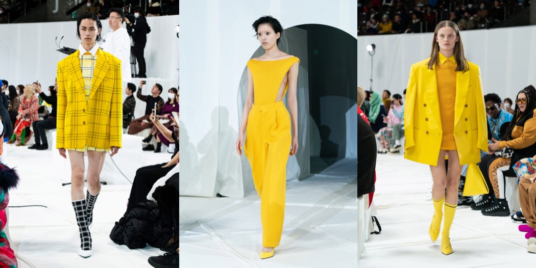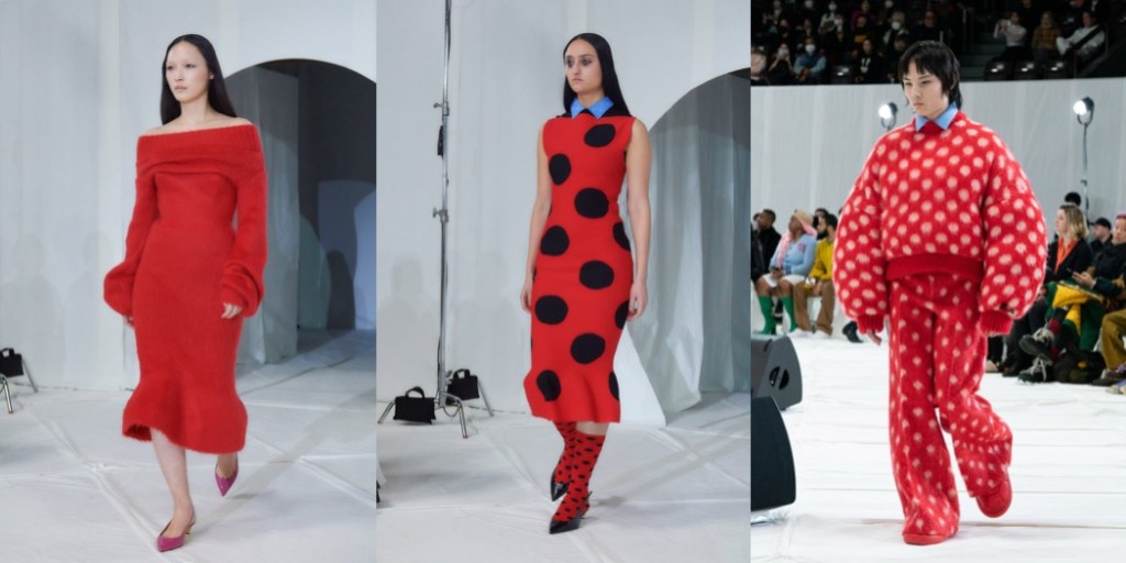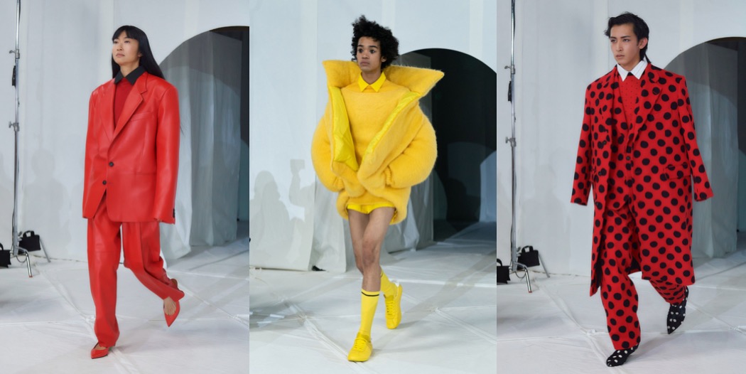 White is a non-color that speaks of absence, but also of clarity. It is a carte blanche on which new words are ready to be written. Wrapping the arena in white paper spoke of a desire for simplicity, for reducing noise and distractions. But Risso is no minimalist, and even if he preached rigor and linearity, the collection had presence, density, and punch. He traded his usual slightly bonkers decorations for starker, elemental graphics, and reduced the palette to a few saturated primary colors: yellow and red playing against white and black. Every look was an all-over proposition, and for both men and women in the mostly local cast (plus Marni favorites like Paloma Elsesser and Angel Prost), silhouettes alternated between slender and form-fitting and bulky and bulbous. Tailoring was offered in oversized versions, and knitwear, a Marni forte, had fuzzy mohair surfaces, as in the jumbo round-cut piuminos that were among the collection’s standouts. The swirling, magical motifs of sirens and unicorns of previous outings were nowhere to be seen, replaced instead by kinetic grids and optical checks, and by slightly Yayoi-Kusama-esque bouncing dots of various sizes. Rectangular tunics and angular apron dresses contrasted with form-fitting, heart-shaped bustier dresses that were kept neat rather than sensual. Cocoons in padded leather or wool conveyed enveloping, comforting warmth. “It’s a collection with one foot in tradition and the other in a not-impossible future,” he said backstage. “It’s a sort of rhythmic alternation of proud normality and proud creativity.”