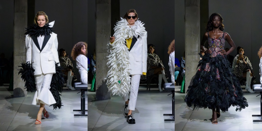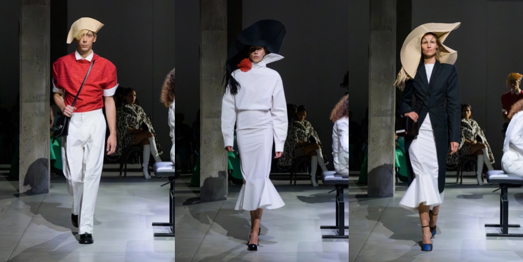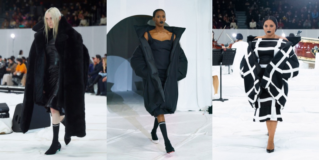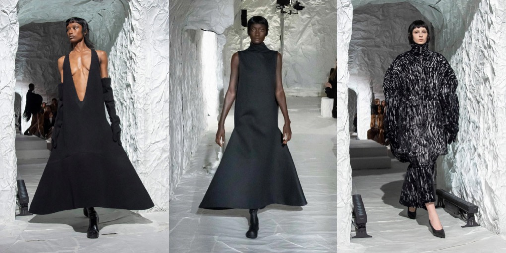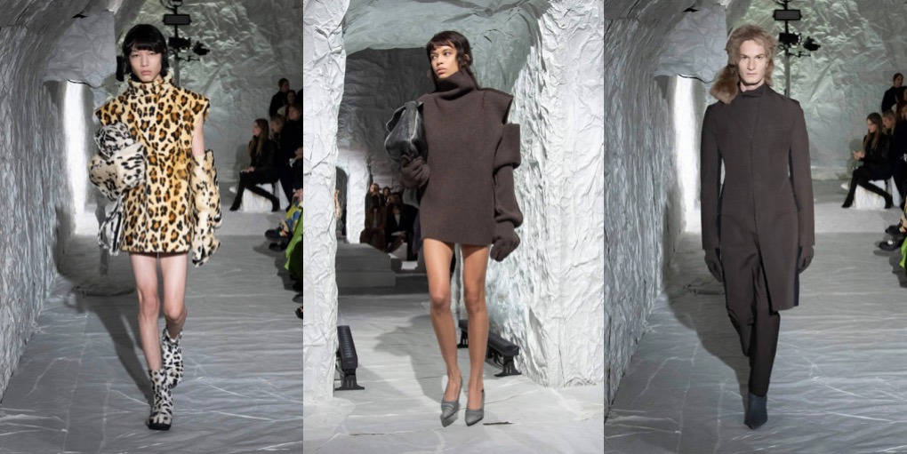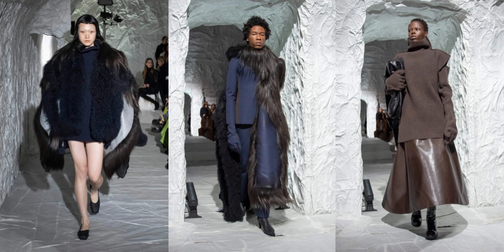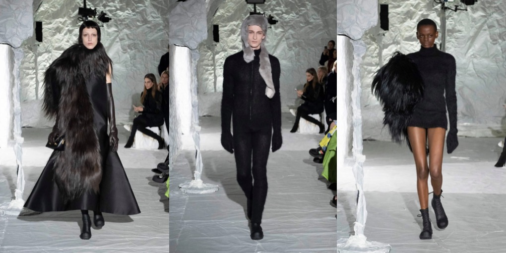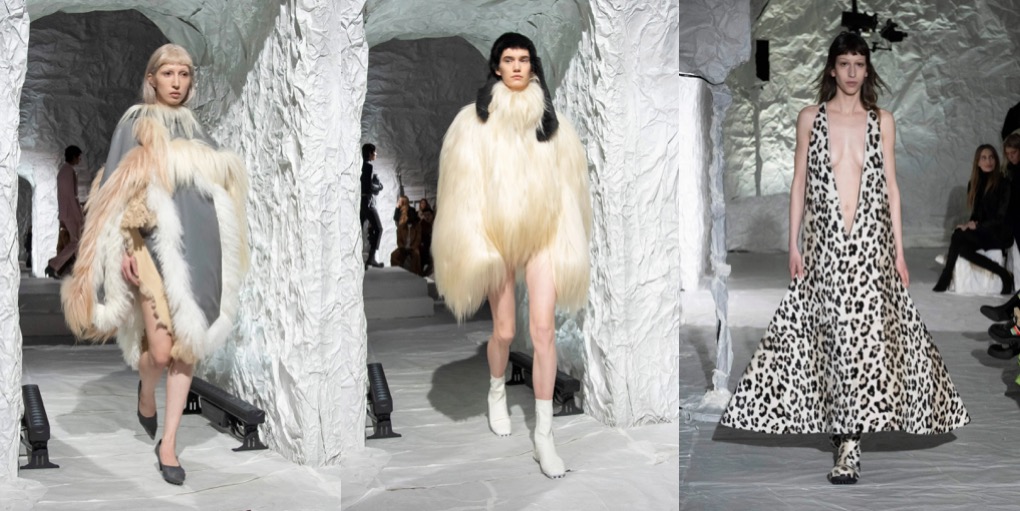 Primal. Animalistic. Rough. Those are just couple of words that seem to describe Francesco Risso‘s latest Marni collection, but not entirely. Crude. Instinctual. Dada. Presented in a cavernous space located in one of the tunnels sneaking under Milan’s Stazione Centrale, entirely plastered in white paper, the collection itself started with the idea of tabula rasa. To prep for this collection, Risso and his team gave the same white-paper treatment to their studio at Marni headquarters, lining every surface as to make them disappear, in a radical attempt to keep out visual distractions, banning images, moodboards, or any excess of conceptual stimuli. Working without visual references brought to the surface an equally radical design practice. Shapes and volumes were stripped of everything superfluous, and returned to a state of purity, taking away all unneeded information, noise. Pockets, buttons, darts, and any detail that wasn’t necessary to glorify “the soul of the shape” were hidden or “reduced to shadows.” In an extreme attempt to dematerialize the shape itself, surfaces of capes, bell-shaped dresses and ball-coats were almost concealed under thick glazed layers of curly gestural paint. The textures of furry blousons were gelled and then hand painted to achieve a spiky, feathery finish; the surface of an egg-shaped parka in black flocked velvet was covered in printed scribbles as if to erase it with frantic urge, “Erased De Kooning Drawing” by Robert Rauschenberg kind of way. This collection was one of the most intense moments of Milan Fashion Week. But one question prevails: why was Ye (formerly known as Kanye West) in the audience? An unnecessary stimulus that made you question the provocative undertone of this Marni show.