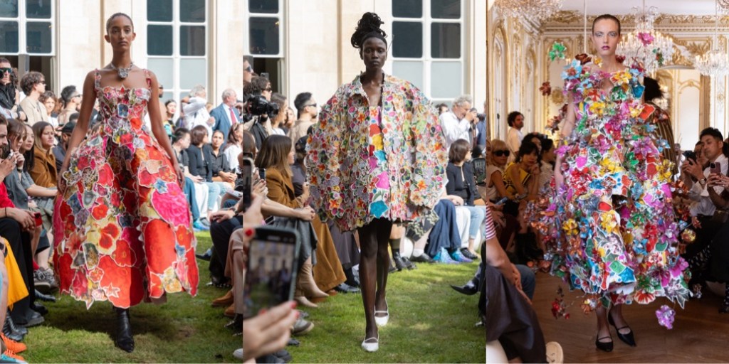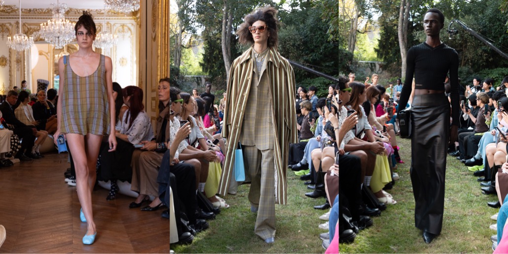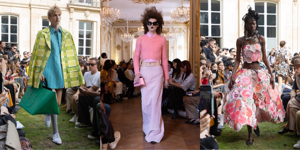 Marni is on a world tour. After New York and Tokyo, Francesco Risso brought his spring-summer 2024 collection to Paris “to continue amplifying connections among our global community. I’m in a flâneur state of mind.” The first time the Italian designer visited the city of lights was when he was 14, and at a party he met by chance “a beautiful creature, who suddenly disappeared, leaving behind only a faint whiff of perfume,” he explained. That subtle French flutter haunted him for years, making him travel to Paris only in the hope of smelling it somewhere again. He never found it, but the magic of Paris was forever imprinted in his memory and olfactory functions. Then, as a teenager, Risso used to visit his friend Serena in Paris at her parents’ house in the chic 7th arrondissement; their neighbor was the late Karl Lagerfeld, whom they spied on obsessively, waiting for him to appear all-black clad in Rue de l’Université “as if he were Michael Jackson.” Recently, scouting for this show’s location, Risso was presented with the possibility of using Lagerfeld’s little Versailles. Et voilà – dots were connected. The private apartments and the formal gardens of the fabulous hôtel particulier where Lagerfeld spent many years were colonized by Marni and its audience. A series of small orchestras, dressed in surgical white vinyl lab coats, performed music by Dev Hynes, a frequent Risso collaborator. The co-ed collection’s flow had a sort of interrupted progression. It started with lean, light, tight-fitting ribbed tube tops in various lengths, to underline the body celebration that’s inherent to Risso’s discourse. Then the show segued into a series of sartorial specimens variously combined: oversize trapeze or boxy-cut tops worn under sharp-tailored trench coats and dusters, paired with straight-cut pants or undulating miniskirts. Most of the pieces were made in soft-bonded techno knitwear to keep their angular shape, rendered into the rainbow-colored combinations of textural checks and stripes that’s a Marni trademark. A few undone crinolines in saturated pastels with apron tops left open at the back and voluminous bell-shaped ankle skirts brushed past the front row, hinting at the obvious reference to the frivolous queen of “let them eat brioches” fame. The crinolines then sort of exploded into the show’s pièces de résistance: a series of exceptional concoctions of fleurs en découpage – visually enchanting, painstakingly handmade creations that Risso called “the ecstasy of the hand.” Hundreds of bright-colored images of flowers, sourced from antique botanical almanacs, were printed on cotton, individually cut out, and then patiently stitched onto bustier dresses with round-shaped crinolines, poufy miniskirts, and a skirt suit with round, jutting shoulders. Adding further wonderment, discarded tin cans were molded into flowers that stemmed, protruded, or sprouted from body-skimming minidresses. “This is the virtuosity of the hand that goes against pervasive virtuality,” said Risso. “We’ve got to undress our mind, and dress up our senses.”