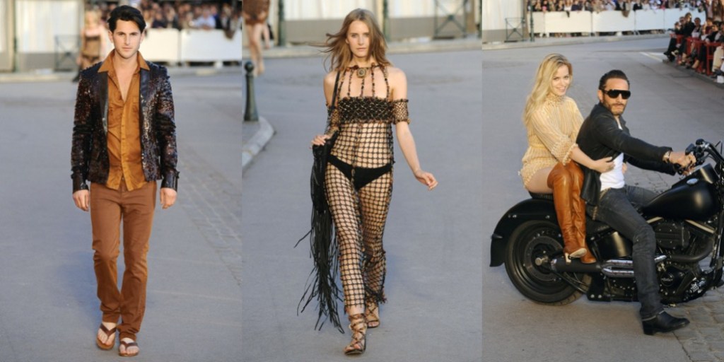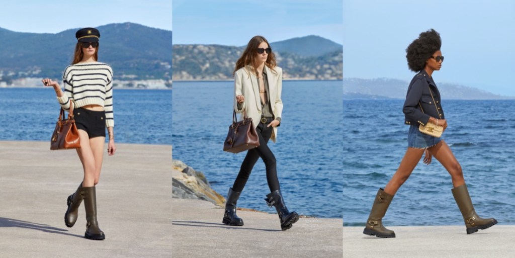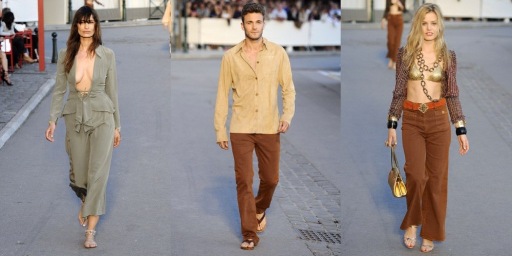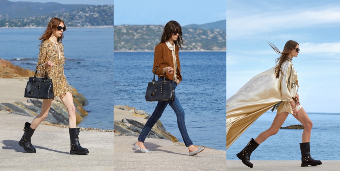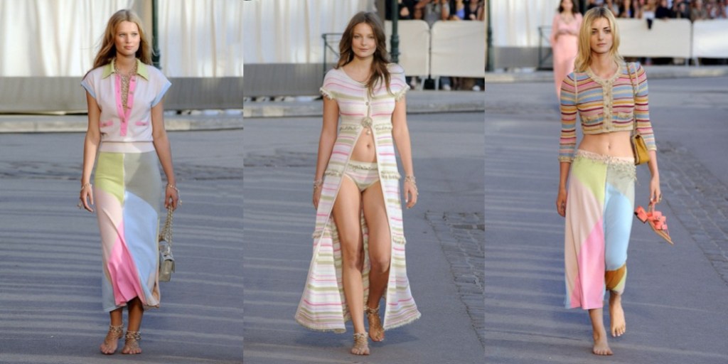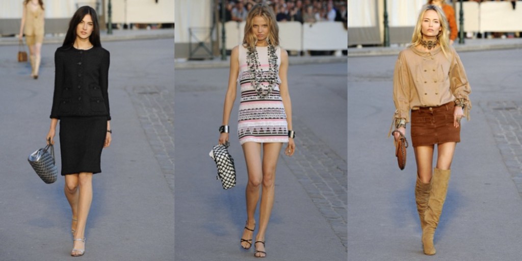 The resort 2011 scene was like something out of a quintessential Riviera movie. With the sun setting over the sea, hundreds of Chanel’s invited guests sitting in the red wooden chairs of Saint-Tropez’s famous Sénéquier, and many more onlookers piling onto balconies and pressing against barricades, Natasha Poly, Anja Rubik, Abbey Lee, and the rest of Karl Lagerfeld’s cast arrived at Quai Jean Jaurès via speedboat. And like the carefree starlets and jet-setters they were channeling, the models traipsed down the street-cum-runway often barefoot, wearing 70s-inspired diaphanous caftans, long crocheted dresses, ruffle-lapelled silk jersey trouser suits, and patchwork denim skirts. Tanned and toned midriffs peeked out beneath a cropped sweater here or a button-down there, its hems tied in a saucy bow. Freja Beha Erichsen’s white silk Mick Jagger tuxedo delivered some sun-drenched rock & roll to the French idyllic. The Rolling Stones front man, of course, married Bianca in just such an outfit in Saint-Tropez’s town hall back in 1971. Magdalena Frąckowiak, doing the brilliant Brigitte Bardot cosplay, danced her way toward the photo pit in a black and white checked maillot. And for the finale, there was Georgia May Jagger, with her dad’s tune “Let’s Spend the Night Together” for an accompaniment. The model got to take a spin in a beaded minidress and thigh-high boots on the back of a tricked-out Harley with Sebastien Jondeau. To be sure, there was a nostalgic mood to the affair. What prompted these witty nods to the past from a designer who famously had no patience for such fusty concepts as the “good old days“? The location surely had something to do with it. Though Lagerfeld pointed out that “Chanel was spotted here once in ’34 by Colette,” Saint-Tropez feels much more like his kind of town. “I spent many years of my life here,” he said. “I know Saint-Tropez like I know Paris. The collection is very casual, very down-to-earth.” Key, of course, is that lightness of touch, the sense of enjoyment and ease.