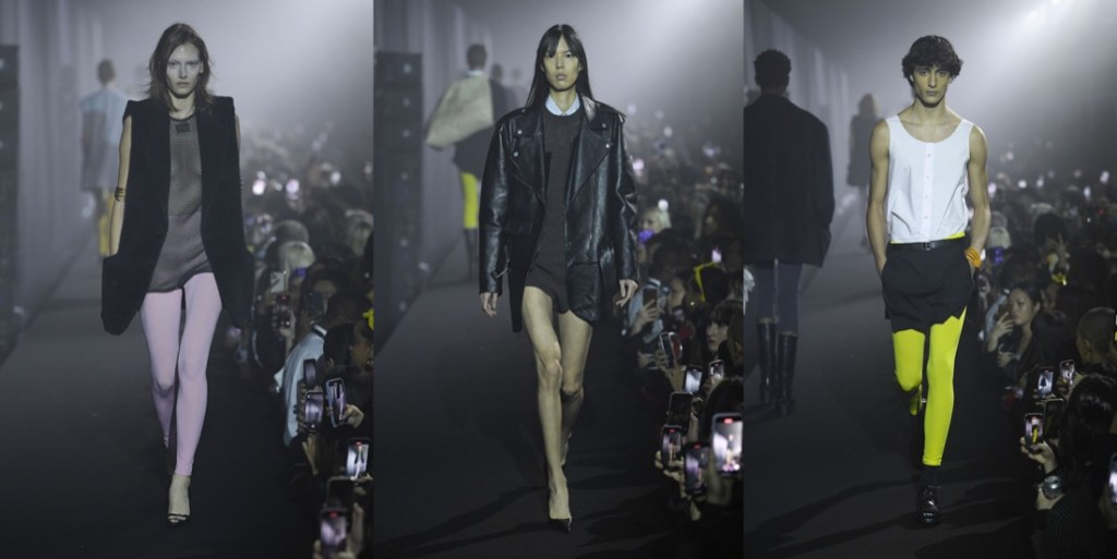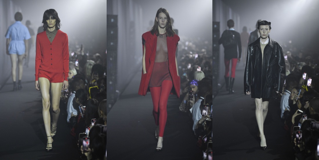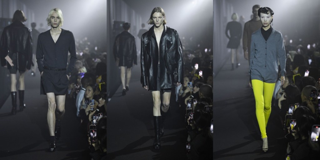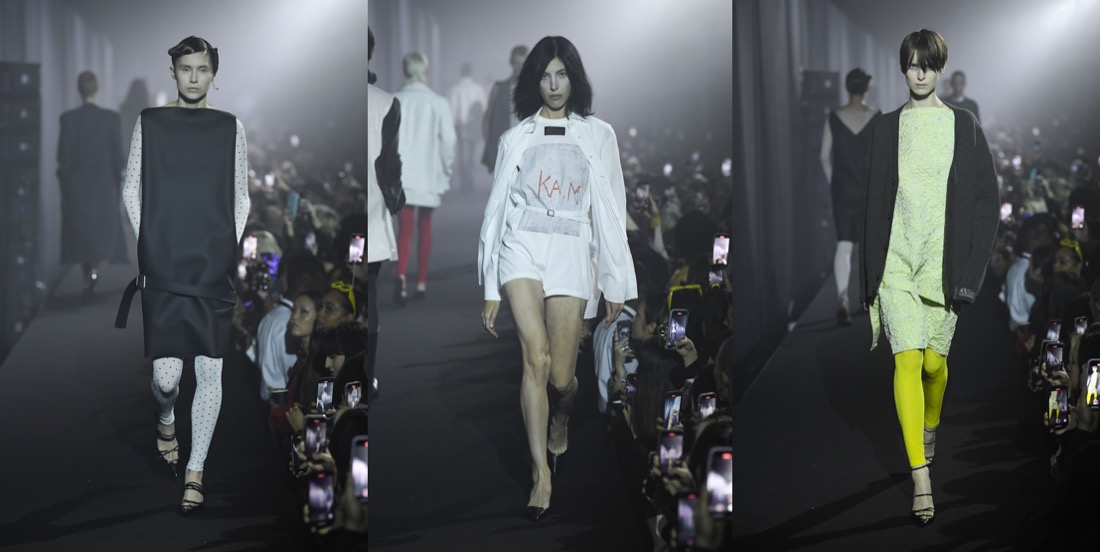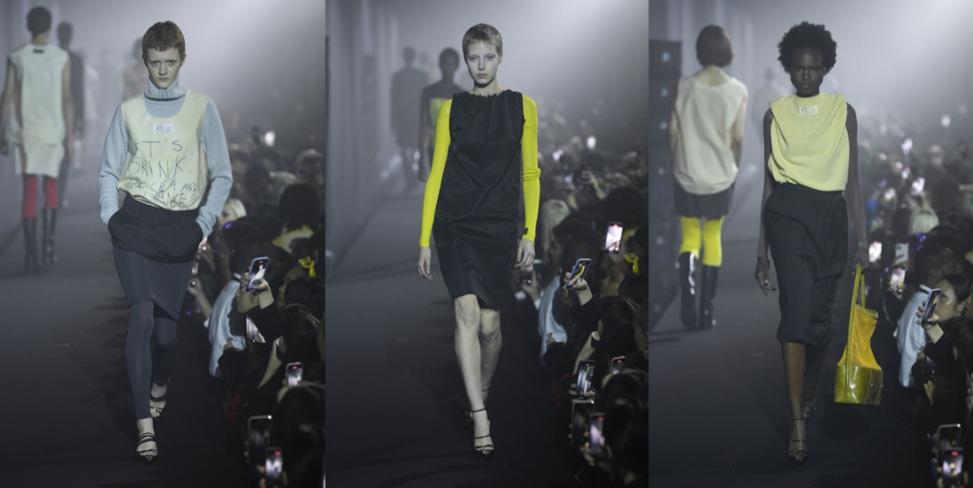 Acting at the edge, in the margins has always been the grounding of his brand. These gritty, dystopian times feel a lot like Raf Simons’s underground beginnings in the 1990s – it took him back to his memories as a kid of jostling with friends, faking tickets to get into fashion shows. “So I thought, let’s not do that. Let’s just invite everybody instead. I didn’t want a show for 300 people sitting in rows. This is a show that’s pure democracy. No hierarchy. A London explosion of youth, life, dancing, and being together. So,” he added, “I was thinking a lot about the body, in relation to dressing up and going out and performing.” As a brutal note-to-self, he embedded prints of scrawled works by the late Ghent artist Philippe Vandenberg on t-shirts and dresses. “They’re cruel words, like ‘Kill them all and dance.’ But he didn’t mean killing people – he meant killing things that you’re doing creatively in order to move on and explore further.” On charged the bar-top show, a propulsion towards coolly minimized tailoring and dancer’s leggings, inspired by classical ballet, partly an upshot of his recent collaboration with the New York Ballet choreographer Justin Peck. The onesies Simons had co-designed with Miuccia Prada reappeared, but this time shrunken into ‘bodies’ – knitted, or as string vests or shirts. In general, there were many Prada-isms weaved into the collection, but kept in a more raw manner. There was an impression of legs, of sexiness, energy – and with it, a new kind of chic coherence. Looks that have turned a corner from away logos, labels and clunky oversized shapes. A lot of that was down to the cut and evident quality of the gray and black tailoring – hip-length jackets with sawn-off sleeves, trousers reduced to slit-sided miniskirts, pleated shorts, narrow coats, even some simple knee-length skirt suits. “I didn’t want to do deconstruction in a complicated, conceptual way,” he concluded. “I wanted something very stripped-back, very reduced. Not overly styled and overdone.” Still, it was simplicity with substance; a collection strong on plain, almost traditional knitwear, multi-strapped kitten heels, and a Raf Simons wardrobe that is as obviously attractive to women as men. His night in London might have devolved into a long after-rave that Simons and hundreds of students and fans won’t forget, but as far as fashion’s concerned, the main event was his clear-headed consolidation of the directness and modernity that’s refreshing the direction of fashion now.