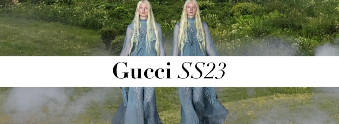 In the minutes before Gucci’s spring-summer 2023 show, an email came in. “Welcome to Twinsburg,” read the subject line. Alessandro Michele’s concept this season was a reflection on identity and otherness. Michele, it turns out, is the child of an identical twin. “I am the son of two mothers,” the show notes began. Mum Eralda and Mum Giuliana “shared a genetic solidarity but, above all, they shared an intimacy which was inaccessible to others.” There’s something captivating, even uncanny, about twins – we’ve all seen the photo of Michele and his friend Jared Leto, tuxedoed doppelgängers at the 2022 Met Gala. The Gucci creative director played up the intrigue here, dividing the audience in two via a partition lined floor to ceiling with portraits of twins and look-alikes by Mark Peckmezian and staging two simultaneous shows without either half understanding until the last models made their way down the runway. Then the wall of photos lifted, revealing another set of bleachers and another set of models wearing identical looks. For the finale, the twins emerged from opposite sides of the set, stretched their arms across the runway, and joined hands.