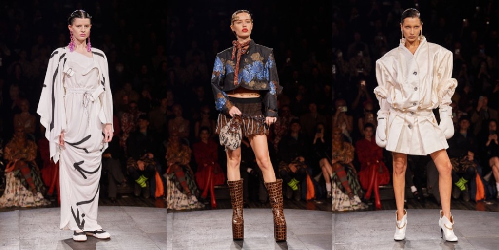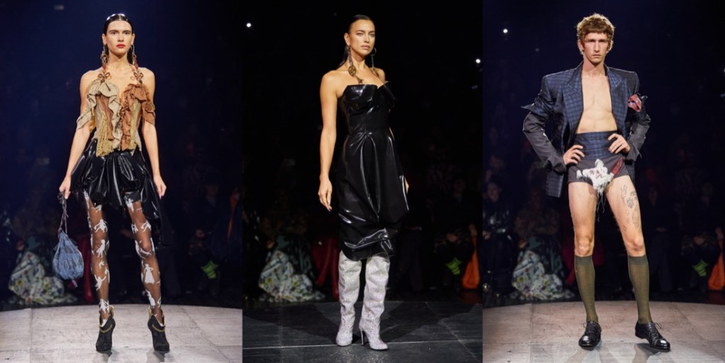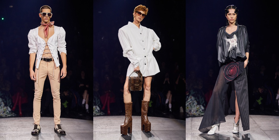 For spring-summer 2023, Andreas Kronthaler was in philosophical form. He reported that until his arrival in Paris a few days ago, he’d not been out of London in more than a year. Instead he had stayed at home and read and designed. The book that hit him hardest was Super-Infinite: The Transformations of John Donne by Katherine Rundell. That text on the great metaphysical poet, who saw lovers’ eyes as hemispheres and clothes as states of mind, helped fire this collection. The ragged tricolored cardigan of look 16 and the soulful accordion on the soundtrack signaled Kronthaler’s enchantment at this Paris return. More broadly we were on an imaginative trip through various characters shaped through clothing. Sibyl Buck was particularly magnificent in her two broad-shoulder, Renaissance-man looks. There were slatterns and angels, monks and harlots, nobles and commoners. The models all wore super-high, Vivienne Westwood-signature platforms that even Donne would have struggled to describe. The only missing element was Westwood herself, whom her husband said was back in London taking part in a wave of protests against the government.