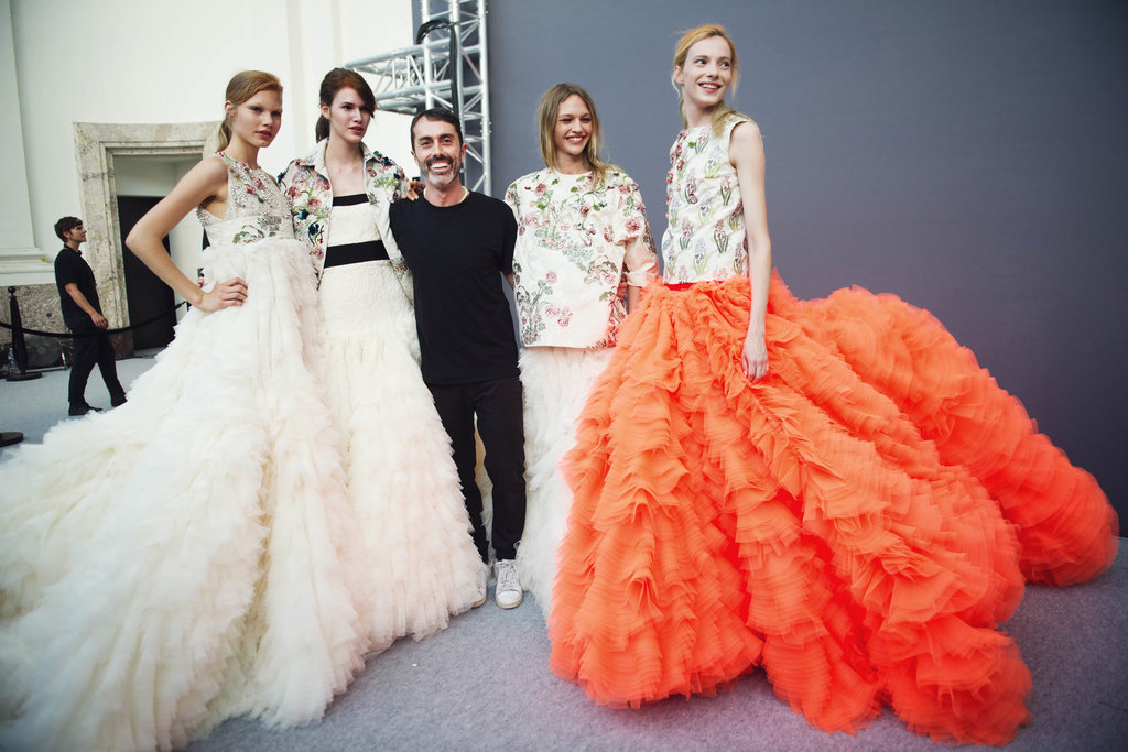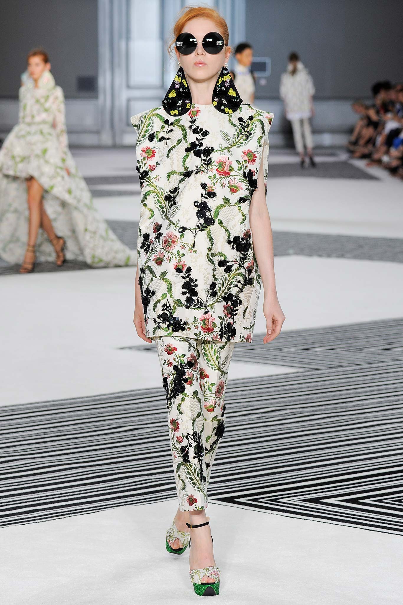 Before designing the collection, Giambattista Valli created an impossible conversation between two women. Talitha Pol and Peggy Guggenheim. “Genuine eccentricity, in the DNA,” he explained. Indeed, his clothes exploded with peculiarity, from the very first look, with a tutu of tulle on a crepe sheath over slim pants. Also, an impressive dose of floral embroidery was seen on maxi gowns and fancy mini dresses. The show-stopping piece? Pants in a silvery metallic raffia that were paired with a big ball of ostrich feathers. But what really made everybody feel stunned nearly to death? The enormous, voluminous orange ruffles which were applied on simple white dresses.