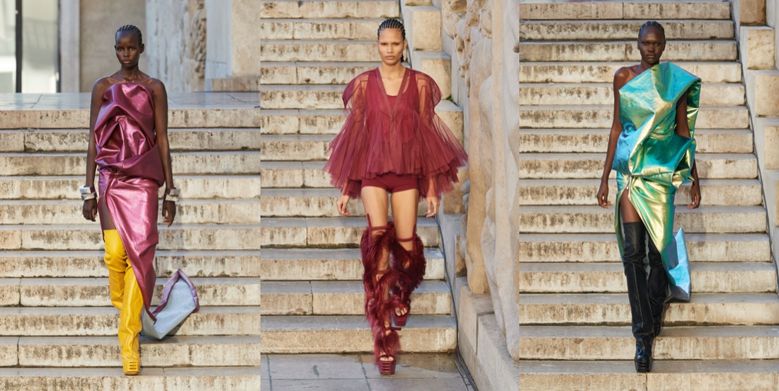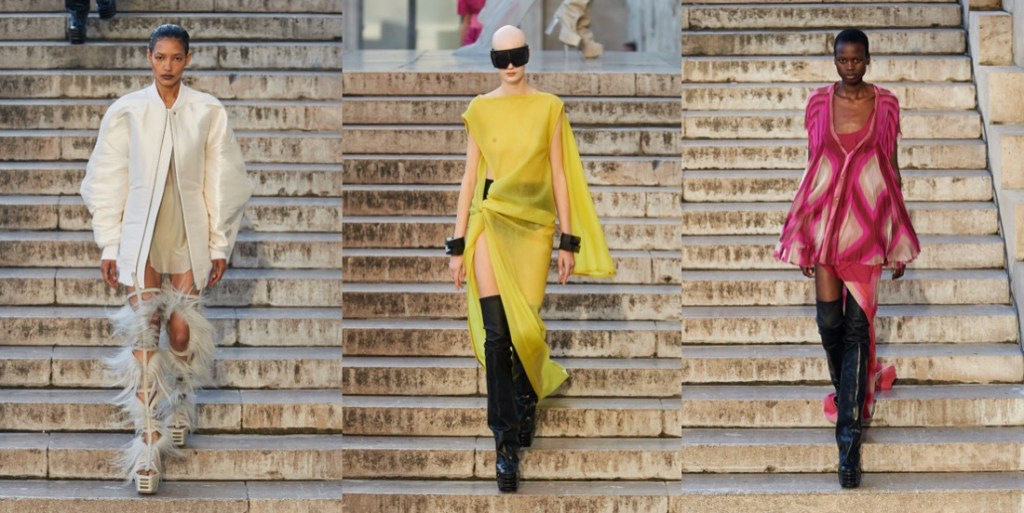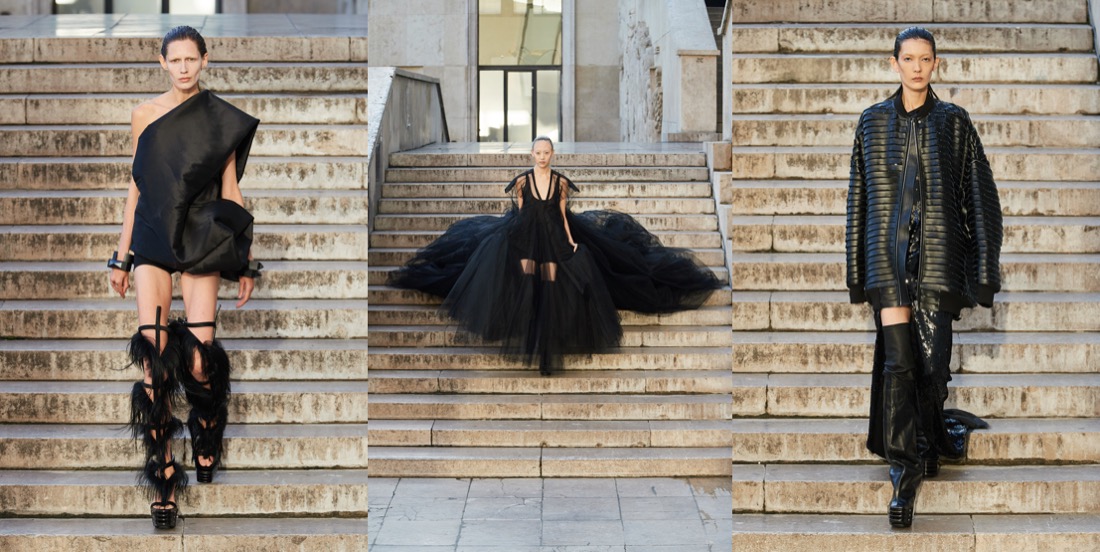 Seeing three XXL tulle dresses cascading down the Palais De Tokyo’s courtyard staircase during a Rick Owens show felt surreal. The king of dark fashion gone princess-y? But then, this was a quite natural step for a designer who like no else revisited the Old Hollywood glamour in his recent offerings. And to be truly honest, these tulle dresses had nothing to do with the ones we see on Giambattista Valli or Molly Goddard’s runways. Owens leaves no room for sweetness. “When you’re proposing more options aesthetically people open their minds in other ways too,” he said. “They become more empathetic.” Who can look askance at a proposal like that? In general, the designer’s use of materials this season was remarkable. The translucent rubbery latex look of the opening pieces? Cowhides collected from the food industry that are treated with natural glycerin to give them their suppleness and sheer quality, “like wearing gelatinous fruit roll-ups,” the show notes elucidated. The spliced stripes of the voluminous numbers at the end were actually lacquered denim. From a distance, they might have been eel. Equally as singular is what Owens did with those materials: draping sinuous dresses with vestigial sleeves like furled wings and long trailing hems, exaggerating the arches of the shoulders of jackets up to and past the chin, creating odd, yet compelling volumes. The show’s many zip-front bombers were paneled like scarab carapaces. The ancient Egyptians considered the scarab a sign of renewal and rebirth, which is relevant. Egypt is a country Owens loves lately. He named this show “Edfu“, after a temple on the west bank of the Nile. The bell-shaped frilled jackets that he repeated in solid brights and vaguely art deco-ish diamond patterns were another novel development.