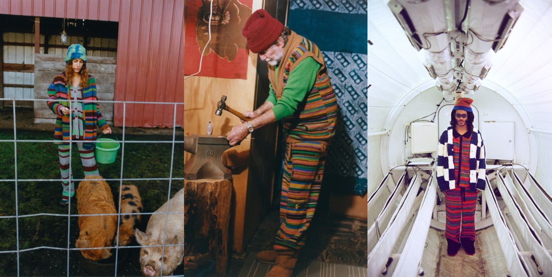 A collaboration with Uggs is The Elder Statesman’s first foray into footwear. The clogs, mules, and boots made from patchworked sheepskin and decorated with “darning”-style embroidery are sure to become must-haves when they’re released later this year. A sporty tank and mini skirt made from hand-knit alpaca and cotton in various shades of blue, a wave patterned knitted cashmere shirt and pants, and a pair of knitted striped cargo pants in mixed bouclé yarns were more proof that the knitwear experimentation here is unparallelled. The bouclé cargos were worn with a black sweater featuring an intarsia illustration of eyes and the phrase “eye to eye it lasts,” a design that came from Greg Chait’s, the brand’s founder, grandmother Thelma. Chait said, “I feel like [the phrase] is about the collection.” Hunter finished the thought: “It’s about how it’s a lot better to see things in person, and see how everything feels.”