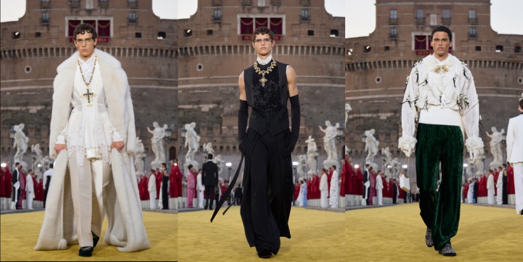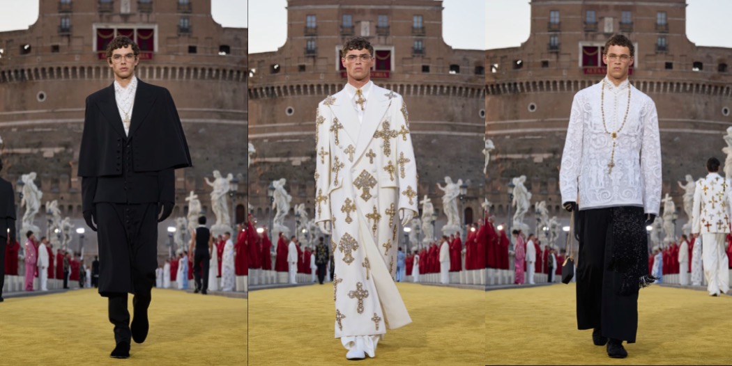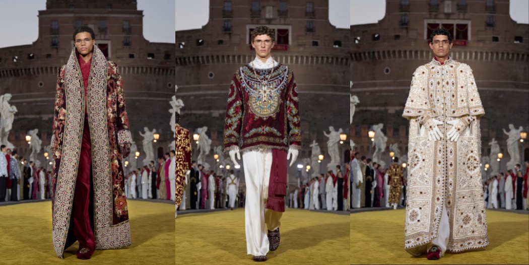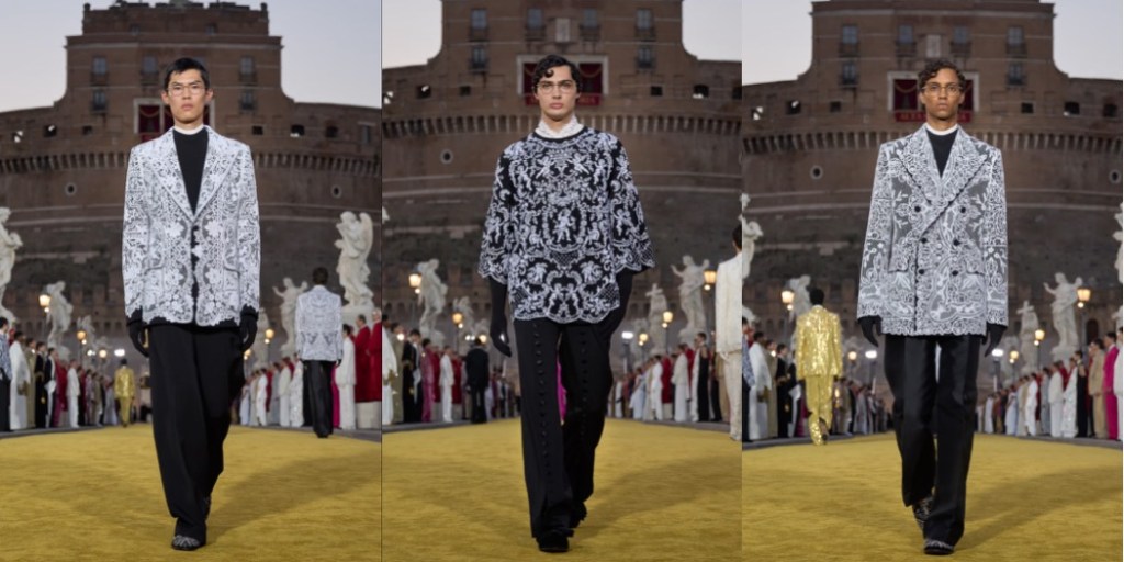Most of the time I hate what contemporary Dolce & Gabbana does (from the Lauren Sanchez wedding dress to the designers’ problematic statements, the list for cons over pros goes on and on). Yet I have a sentiment for old Dolce & Gabbana, especially from the 1980s, 1990s, when the designers dissected the codes of Italianity and created an entire visual lexicon that was very rawn and undiluted. And I must admit that the brand’s latest Alta Sartoria collection – which goes for menswear couture – presented not just anywhere in Rome, but at the steps of Castel San’Angelo – and with IRL bishops in attendance – is really something worth analyzing. READ MY FULL REVIEW HERE.