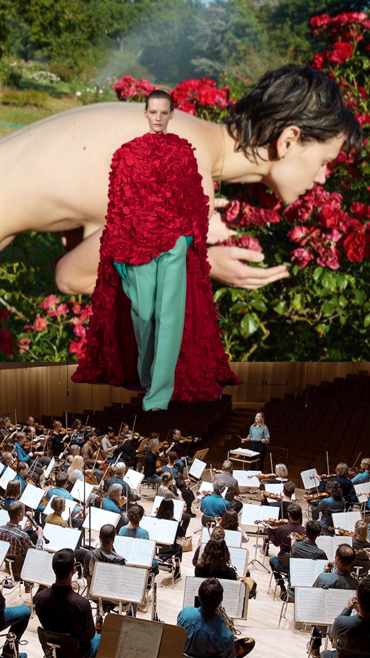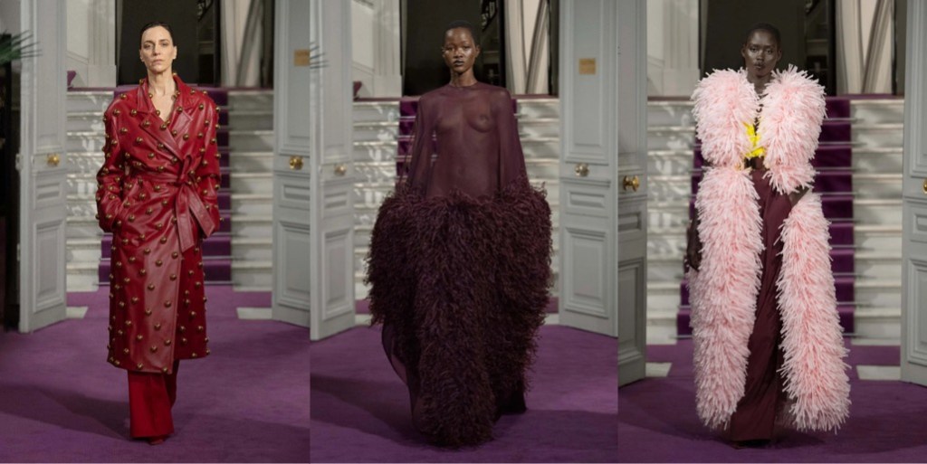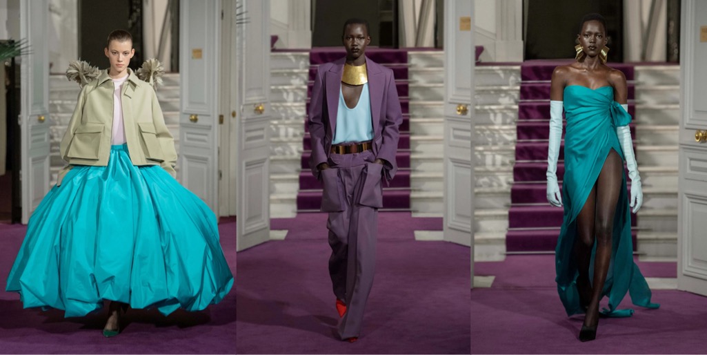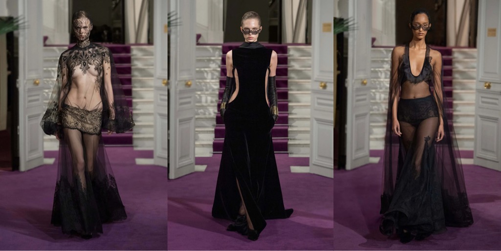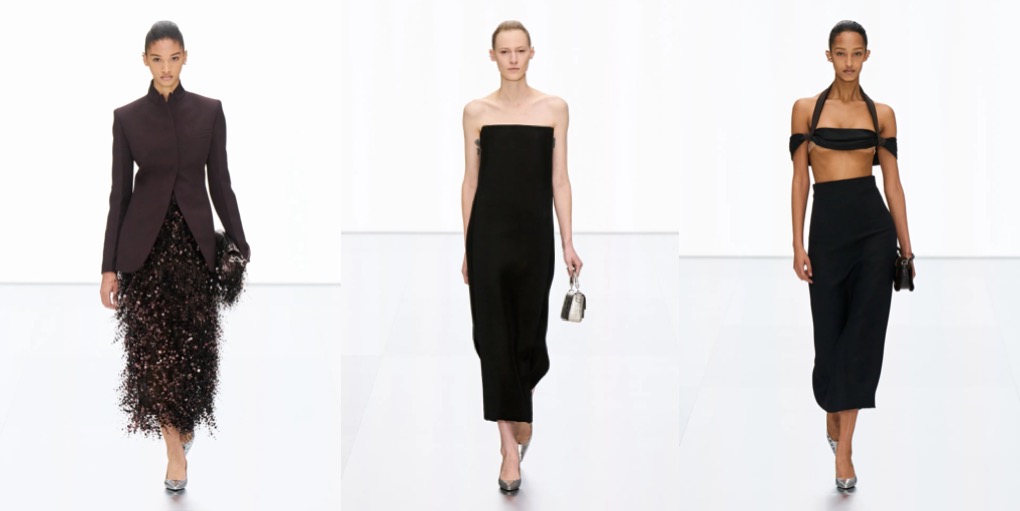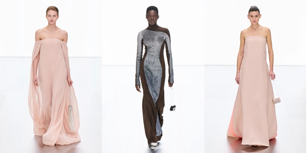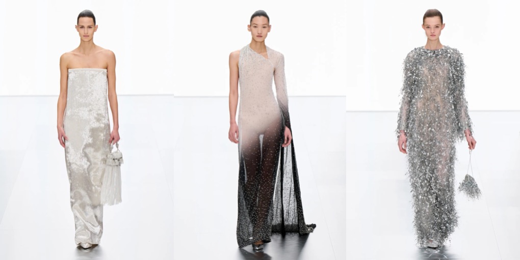 This haute couture week started with a regal twist as Daniel Roseberry took us back in time. “I had this dream of finding a forgotten couture collection in the basement of Elsa’s country house,” he said backstage at his Schiaparelli fashion show. This is a couture label that flourished in the 1920s and ’30s. Its contemporary creative director has never seemed hemmed in by that era, but this season he made his gaze more explicit. “I wanted people to feel the collection was referencing a different time… and there was something about the ’50s that felt so fresh and simple. You’ll find homages to those silhouettes.” The show was staged in a basement – the basement of the Hôtel Salomon de Rothschild, whose upper salons have long been used for couture shows. In the dark, chandelier-lit space Roseberry conjured something of the haute couture shows of old, with models emerging at a stately, almost reverential pace, and making eye contact with the audience. Maybe it felt stuffy and history-heavy at some moments, even archaic, but there’s an irresistible charm of that old world, vampy glamour. Who wouldn’t want to indulge in wearing the show-opening cape, with the broad shoulders of an eagle with silver lozenge embroidery arranged to look like gleaming feathered wings? Or a black party dress, with its tulle skirt in a permanent can-can kick flip exposing an underside lavishly embellished with pink rhinestones? Or spiral in some mirrored hall, covered in millefeuille circles that trimmed the arabesque hems of an hourglass dress? Couture is a dreamworld, and Roseberry has no shame about it.