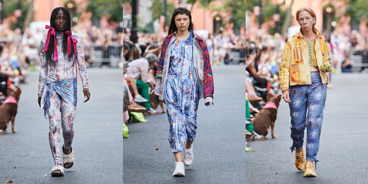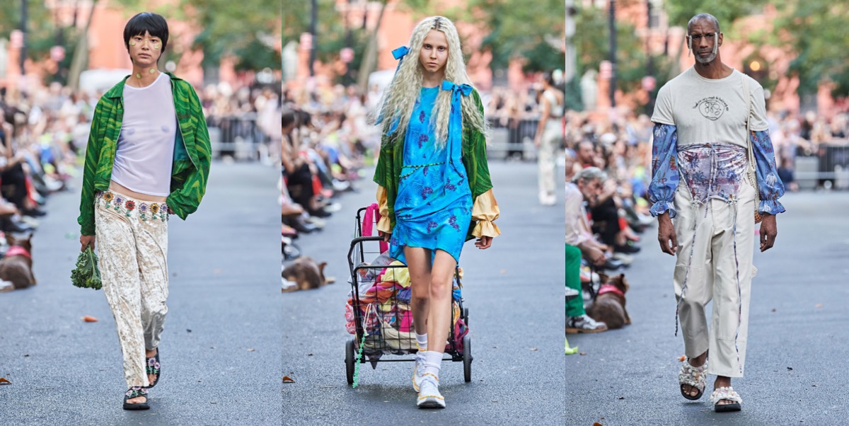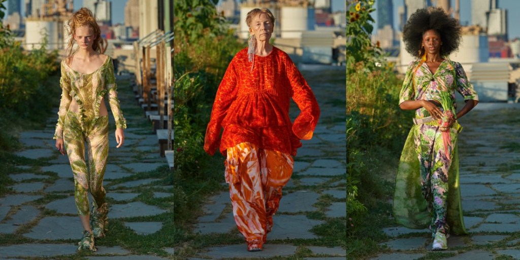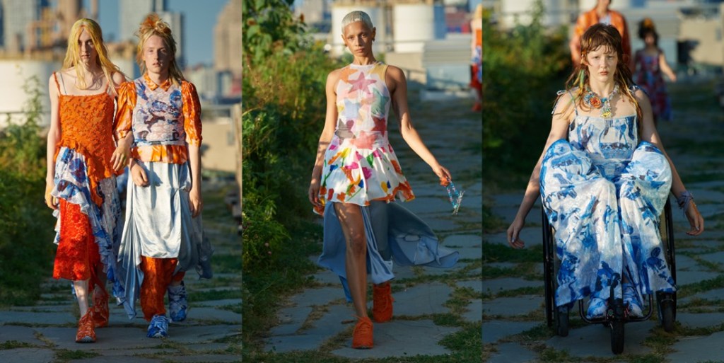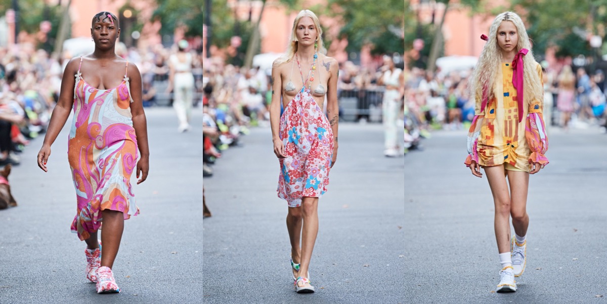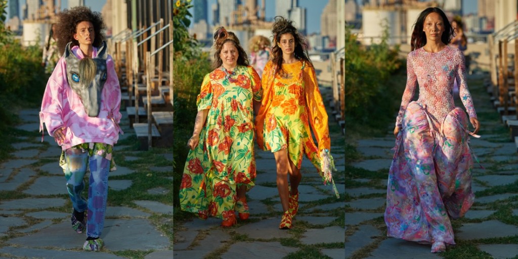 At Collina Strada, Hillary Taymour was in a celebratory mood (like many designers in New York seem to be). Hari Nef opened the show, wearing a dainty, lace-trimmed slip over wide-leg plaid trousers, her arms fluttering up and down like so many butterfly wings. Bedazzled on the front was the phrase “Got milkweed?,” an environmentally friendly take on the classic Got Milk? ad campaign of the ’90s, which also happened to be the name of the collection. Milkweed is the only plant monarch caterpillars will eat. Fittingly, the show took place at Brooklyn Greenway, a former cemetery turned monarch butterfly preserve that’s not open to the public. Taymour’s signature playfulness and Y2K influence were certainly present, but there was also a tender touch (some of the models wore extra-long braids that dragged on the floor behind them as they walked, like a Rapunzel that never had to cut her hair off to find freedom) and a mix of romanticism that resulted in some truly elegant eveningwear options. A floral lace–crocheted long-sleeve gown was worn underneath a structured bustier minidress with an exaggerated balloon skirt—a fantastic continuation of the exploration of panniers and bustles that Taymour has embarked on for the past few seasons. “I just feel like now that we’re a ‘trend,’ I really wanted to push it and be like, ‘We’re not just [sportswear],’” said Taymour after the show. “I can make these dresses for you and elevate it.” A carnation pink dress made from deadstock chiffon that hung from bent-wire flowers that attached to matching airbrushed pink breasts and nipples proved she could do both. She added, “I just wanted to push myself to do that.” Big cargos came in hand-drawn floral prints, crushed velvet, and even organza. Decorated jeans were part of a collaboration with Unspun, a company that 3D-scans the body in order to create made-to-order denim. She also debuted a collaboration with Virón featuring shoes made of upcycled materials, including ruffled velvet oxfords and chunky silver metallic boots, and a collaboration with Melissa on supercool and weird puffy sandals, which she paired with tiny satin ballerina-style socks that perfectly encapsulated the spirit of the collection. In the show notes, Taymour describes being inspired by “the butterfly’s symbolic cycle of life, death, and rebirth,” but with clothes like these, Collina Strada will thrive forever.