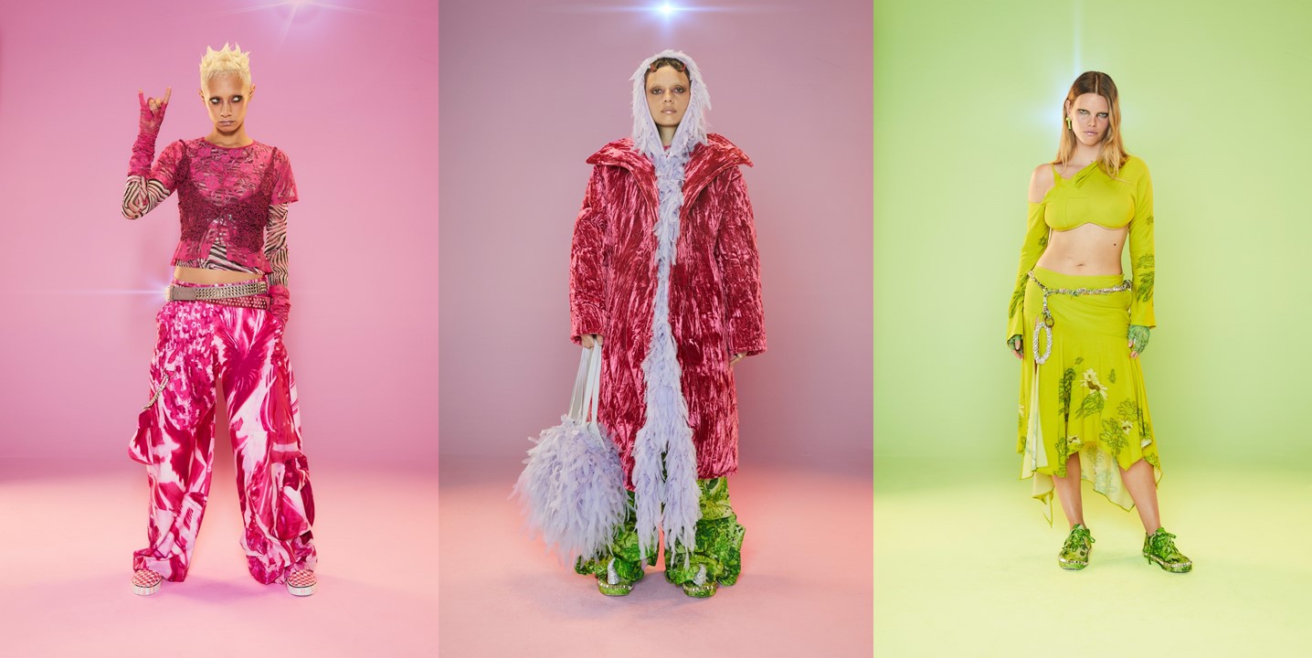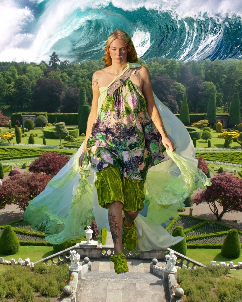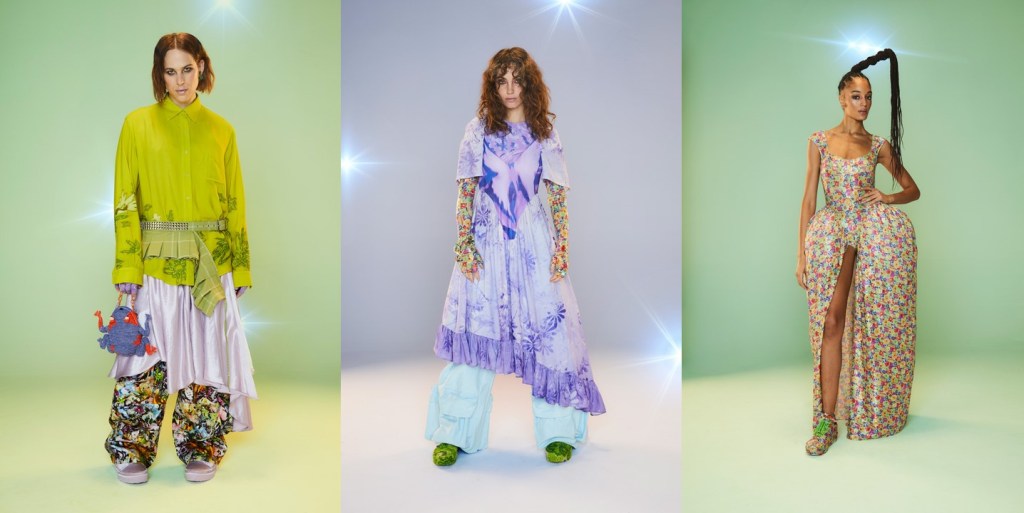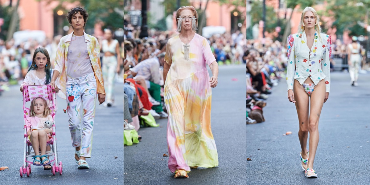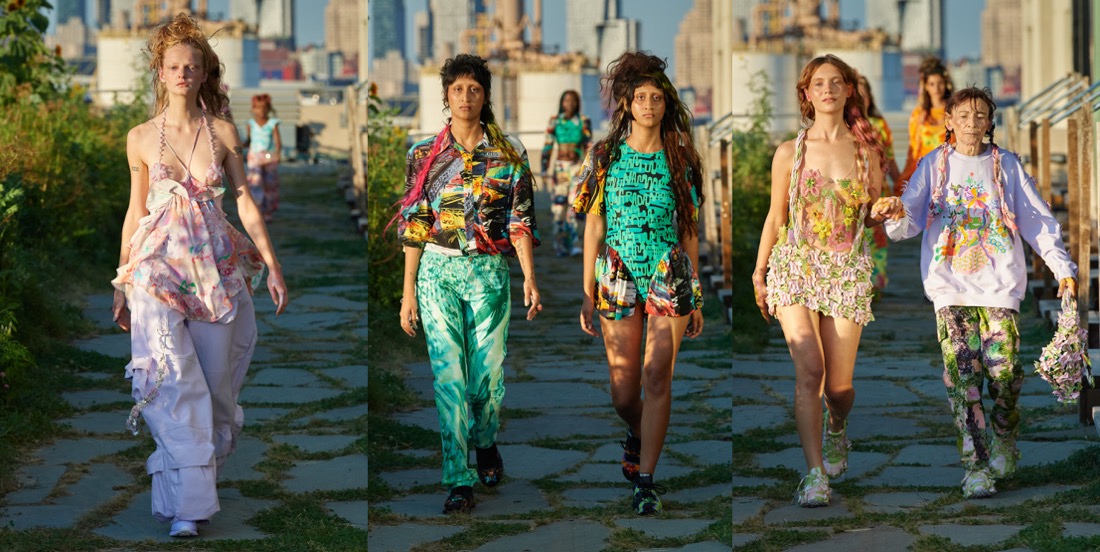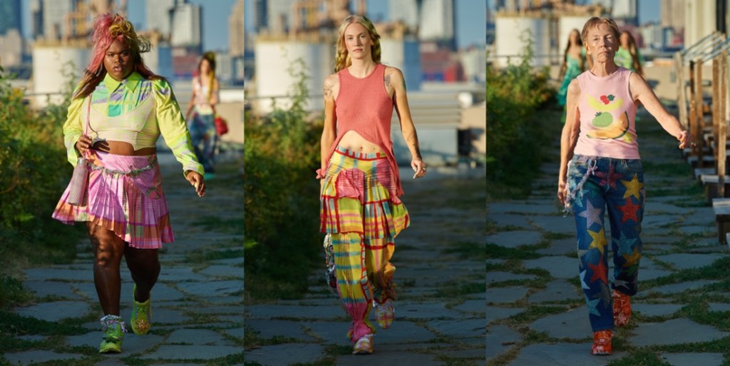 At Collina Strada, Hillary Taymour was in a celebratory mood (like many designers in New York seem to be). Hari Nef opened the show, wearing a dainty, lace-trimmed slip over wide-leg plaid trousers, her arms fluttering up and down like so many butterfly wings. Bedazzled on the front was the phrase “Got milkweed?,” an environmentally friendly take on the classic Got Milk? ad campaign of the ’90s, which also happened to be the name of the collection. Milkweed is the only plant monarch caterpillars will eat. Fittingly, the show took place at Brooklyn Greenway, a former cemetery turned monarch butterfly preserve that’s not open to the public. Taymour’s signature playfulness and Y2K influence were certainly present, but there was also a tender touch (some of the models wore extra-long braids that dragged on the floor behind them as they walked, like a Rapunzel that never had to cut her hair off to find freedom) and a mix of romanticism that resulted in some truly elegant eveningwear options. A floral lace–crocheted long-sleeve gown was worn underneath a structured bustier minidress with an exaggerated balloon skirt—a fantastic continuation of the exploration of panniers and bustles that Taymour has embarked on for the past few seasons. “I just feel like now that we’re a ‘trend,’ I really wanted to push it and be like, ‘We’re not just [sportswear],’” said Taymour after the show. “I can make these dresses for you and elevate it.” A carnation pink dress made from deadstock chiffon that hung from bent-wire flowers that attached to matching airbrushed pink breasts and nipples proved she could do both. She added, “I just wanted to push myself to do that.” Big cargos came in hand-drawn floral prints, crushed velvet, and even organza. Decorated jeans were part of a collaboration with Unspun, a company that 3D-scans the body in order to create made-to-order denim. She also debuted a collaboration with Virón featuring shoes made of upcycled materials, including ruffled velvet oxfords and chunky silver metallic boots, and a collaboration with Melissa on supercool and weird puffy sandals, which she paired with tiny satin ballerina-style socks that perfectly encapsulated the spirit of the collection. In the show notes, Taymour describes being inspired by “the butterfly’s symbolic cycle of life, death, and rebirth,” but with clothes like these, Collina Strada will thrive forever.