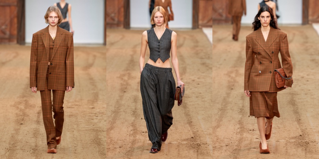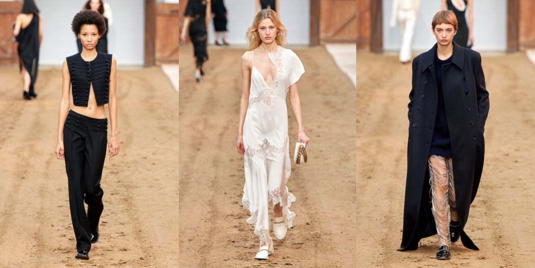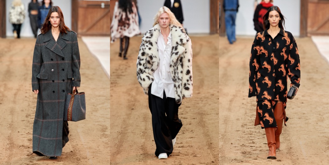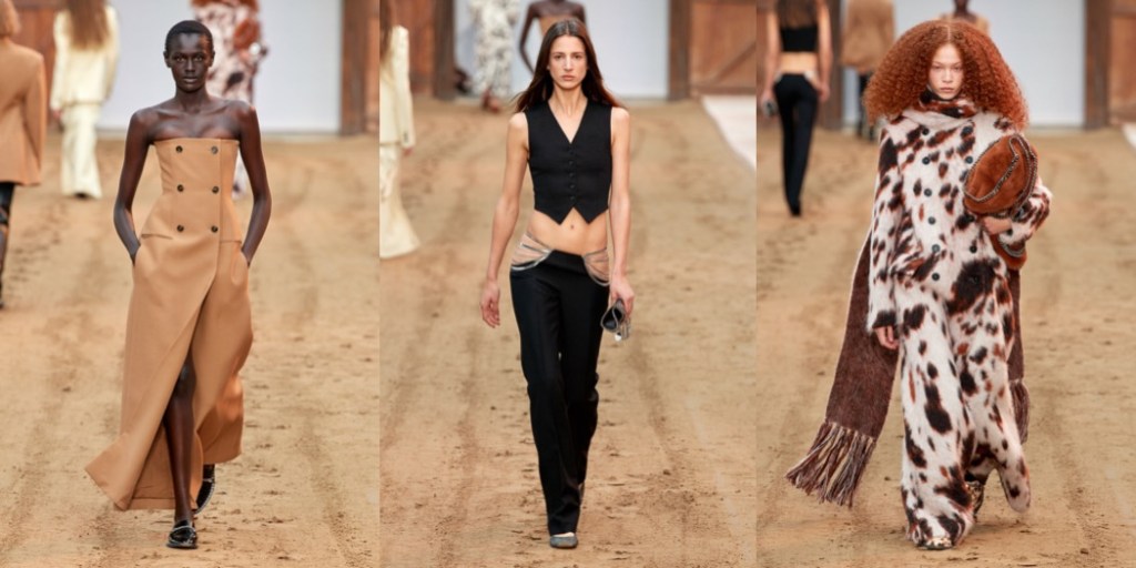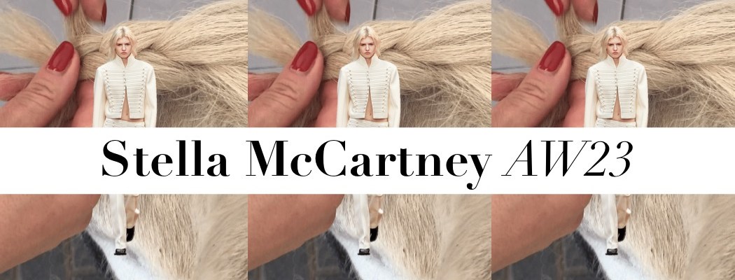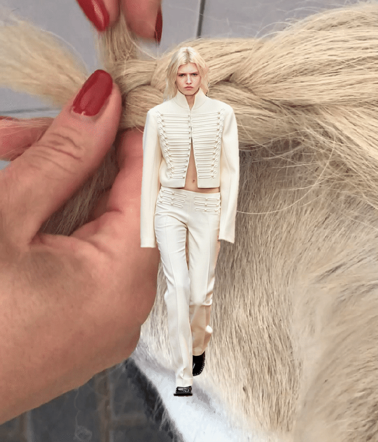 Stella McCartney‘s autumn-winter 2023 collection was all about her long-time obsession and passion for horses. Judging from the models’ calmness in the runway pictures, it’s hard to believe that seven un-haltered white Camargue horses were running around the sand-strewn arena immediately to the left of the runway. They were joined by the horse whisperer Jean-François Pignon, who gently encouraged them to rear, run in circles and roll around in the sand. “There’s so much leather and feather and fur on the runway, especially in winter, and I just wanted to show that you can do it in a different way. You don’t have to kill anything,” Stella McCartney said after the show. She nailed it. McCartney is vegan, but also someone who believes in harmonious relationships between humans and animals. Her mother Linda bred Appaloosa horses, and to this day, the designer still rides. She has a horse named Summer and keeps dogs, too. Her collection was an exercise in claiming and re-appropriating the codes of the British equestrian wardrobes associated with hunting and the warhorses of the Great War, and all the things McCartney doesn’t believe in. “It’s beautiful: the tailoring, the bespoke work. As someone who studied that for many years, you can’t get away from it,” she said, reflecting on those uniforms. “The relationship between the man and the woman and the horse and nature, it’s this kind of pull-and-push, and I think there’s a poetry at the center of it all.” McCartney applied her equestrian grammar to the Y2K language of her own fashion history – the Chloé era! – which she first re-introduced last season. The fusion materialized in skimpy hussar jackets, little cropped vests, deconstructed denim suits from another equestrian culture, and low-riding trousers that infused draped hip chains with fresh tack associations. Those memories continued in dresses and knitwear that revived the horse print from her spring/summer 2001 collection for Chloé, albeit in a blurry evocation. McCartney’s ongoing rekindling with her own archives from her tenure at the house is timely – it’s what the kids want (her daughter is the best example) but it’s clearly also invigorating the designer in new ways. Everything suddenly feels a little bit more impassioned in the house of Stella.
