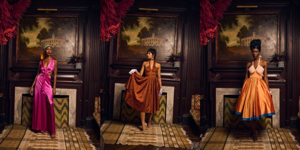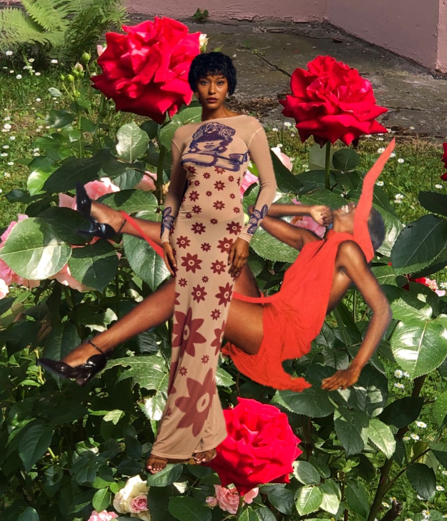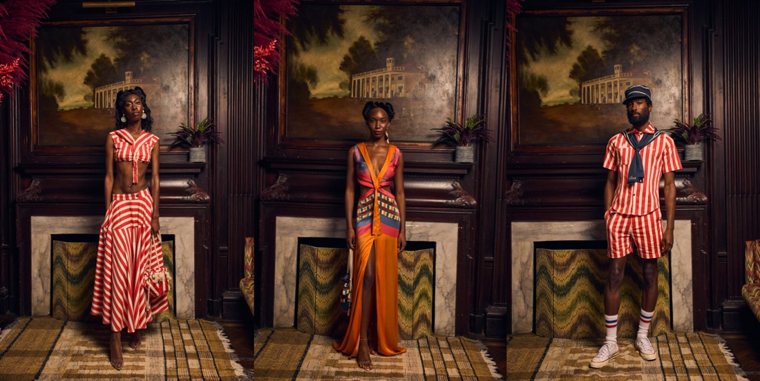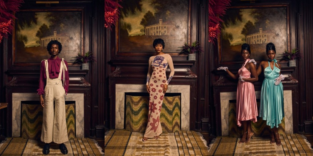 House of Aama’s mother-daughter duo Rebecca Henry and Akua Shabaka describe their vision as “folkways, Black experience, timeless garments.” Their collections merge spirituality, craft, and pragmatism with signatures ranging from corduroy suits to soft pussy-bow blouses and Victorian dresses. But Henry and Shabaka aren’t just in it for the clothes; they’re as passionate about storytelling and sharing knowledge, particularly about the lesser-known histories of Black people in America. In 2017, they designed a collection in homage to Creole spirituality, largely influenced by Henry’s upbringing in Louisiana, and for their first official New York Fashion Week show, they recalled the beach towns that African Americans established in the early 1900s. Built along Midwest lakes and California coasts, the resorts were a joyful respite at a time when most beaches were not yet desegregated. In the fittingly tropical, low-key atmosphere of the Freehand Hotel, Henry and Shabaka’s spring-summer 2022 show nodded to that era with circle skirts, crochet tanks, scarf prints, and beachy stripes, with a retro playlist to match. The duo recut their halter dress in luminous charmeuse and their unisex jumpsuits got a nautical twist with sailor buttons and rope belts. Faded sweatshirts, silk shirts, and a “tattoo” mesh were printed with hand-illustrated ships and anchors as well as African deities and scenes from “Camp Aama,” the fictional resort Henry and Shabaka dreamed up as they designed. Henry proudly pointed out that the tattoo motif, along with every other print, fabric, and illustration, was custom-developed by their team in Los Angeles. It’s a significant point of difference for their brand; in 2021, it’s much more common for a young designer to purchase pre-made textiles. By creating everything from scratch, Henry and Shabaka guarantee a more personal, idiosyncratic touch in a market where so many collections look signature.