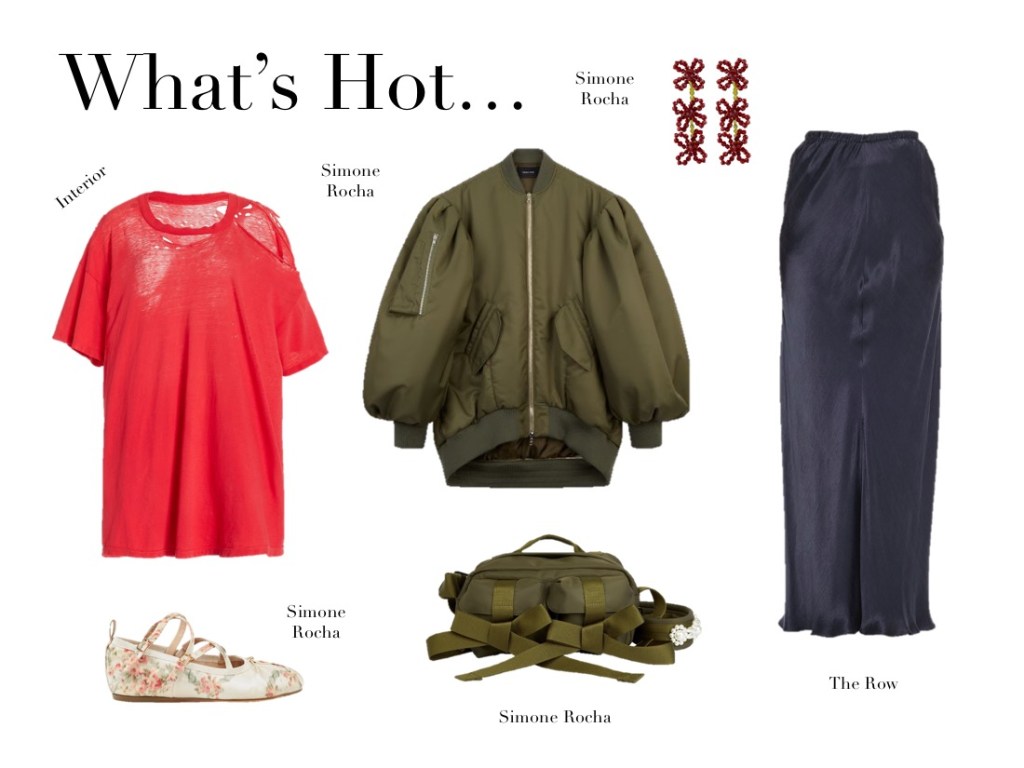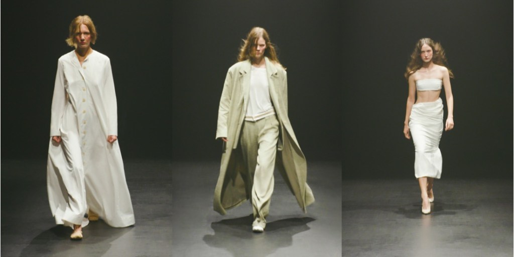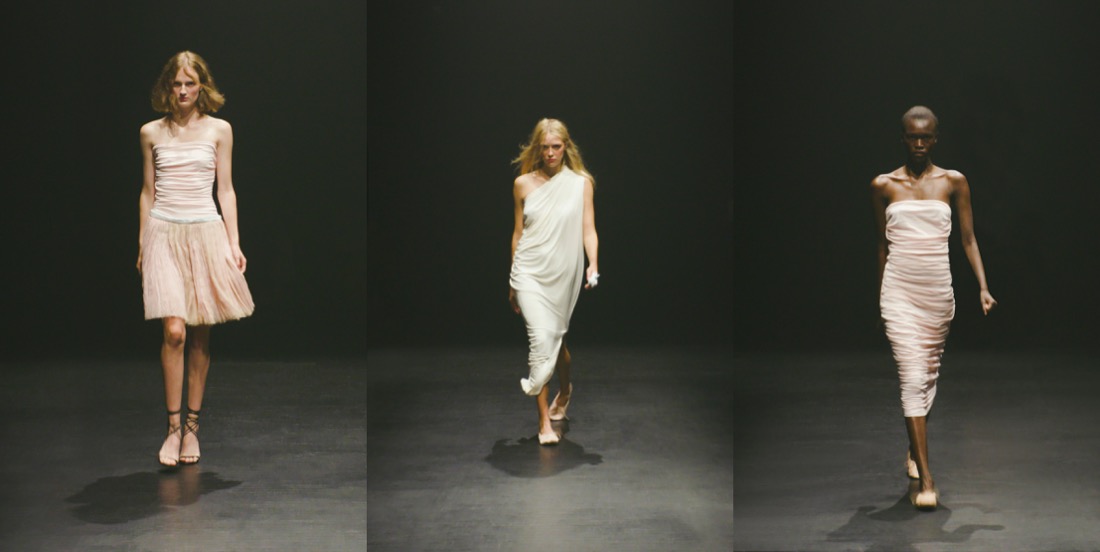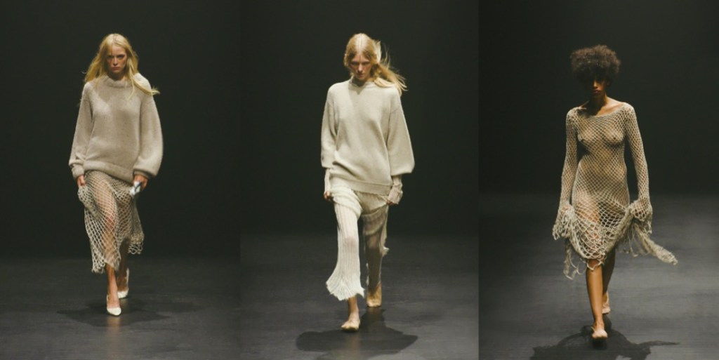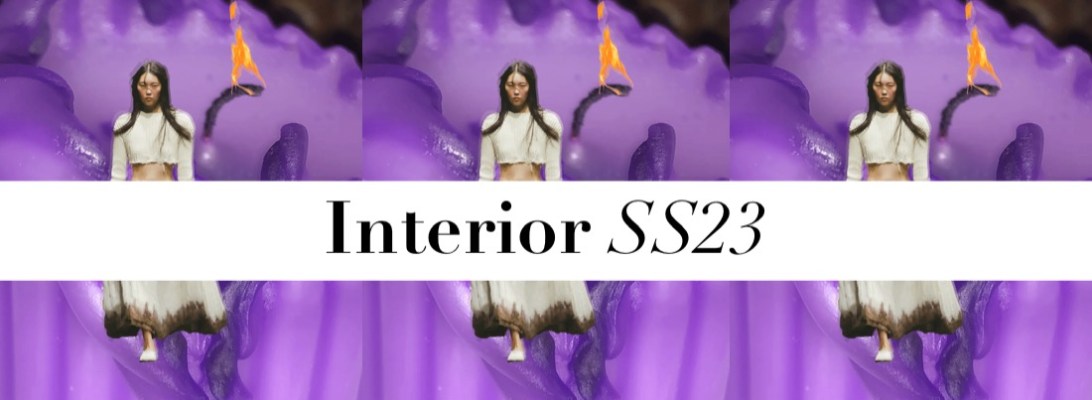For spring-summer 2023, Lily Miesmer and Jack Miner presented a lesson in perfect imperfections at Interior, balancing delicate femininity with their signature perverse edge. Barring the occasional pop of red in for of a ripped indie-sleazy t-shirt, the neutral palette puts the focus on the duo’s masterful drapery and eye for sensual fits. Alongside raw-edged slinky netting and covetable suiting, fall in love with amply ruffled going-out tops and a stunning ivory skirt whose full, twirl-worthy volume is cleverly offset by a mud-dipped hem (obsessed). “She probably just has anxiety, and they’re like ‘You’re hysterical, go live in the attic.’” Miesmer said backstage. Distress – both mental and physical – was a driving force in the show, down to the Pixies hit “Where Is My Mind” playing during the finale. True to their ironic take on elegance, Miesmer and Miner found plenty of ways to riff on the staples of Park Avenue princesses: shirt dresses (but with voluminous trains), cozy cashmere knits (but with an unraveling crop), double breasted suits (with raw edges) and ballet flats (but actual ones used by ballerinas, sourced from Miesmer’s favorite dance store). Classic, almost preppy affluence is at the core of Miesmer and Miner’s designs, but this season there was something rotting underneath – and they’d take that as a compliment. “There’s an audacity in destroying the most beautiful cotton fiber, yarn, cashmere, and layers of chiffon and lace,” Miesmer added, referring to how she and Miner took power tools and horse brushes to the textiles to give them the exact right effect. The fun of Interior is how they distort the prissy, the stuffy, and the basic. Their first collection was filled with clothes that would look at home at a dinner party, but since then, Miner and Miesmer have incrementally added a sinister undercurrent. A pink strapless ruched cotton jersey top with a swishy cotton gauze skirt is a prime example. It could have been worn by one of Degas’s models, but the hem is more muted than the top, suggesting frequent wear, and the waistband is folded down. She’s not a prima ballerina; she’s the last one standing in a horror movie.