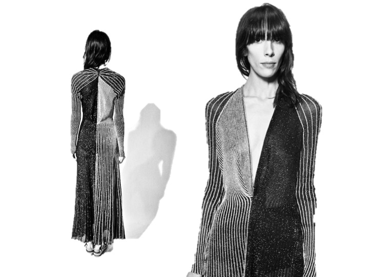 This lurex striped maxi dress. Looks so amazingly sexy and beautiful on Jamie. Lurex, a very artificial fabric, that is not really considered us a luxury material, makes the dress suprisingly soft and delicate! And notice one thing- this a bit disco-like gown is not styled with heels, but… metallic geek sandals. Love it insanely.