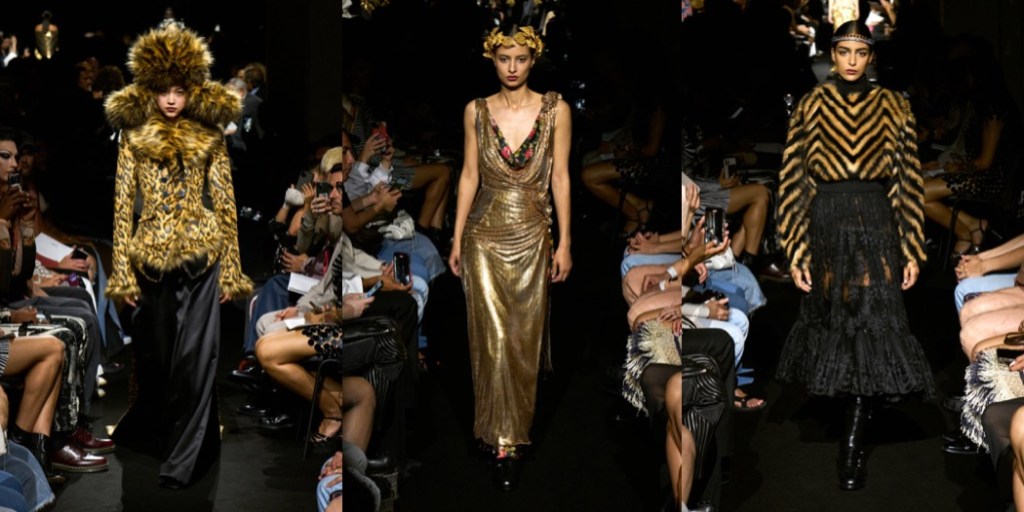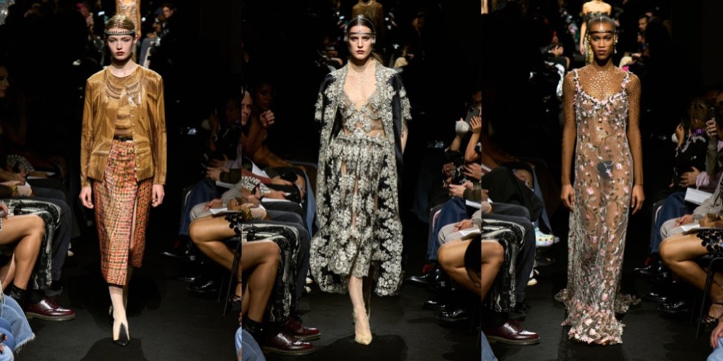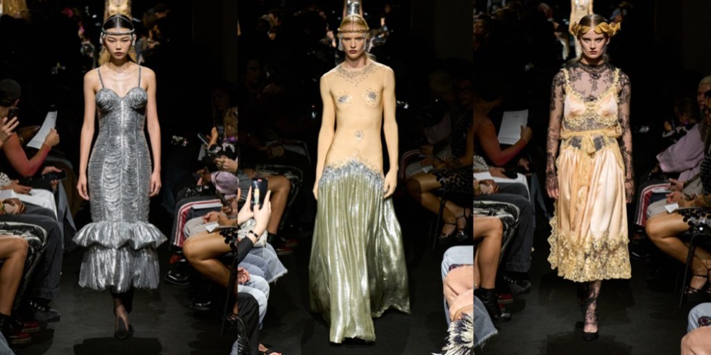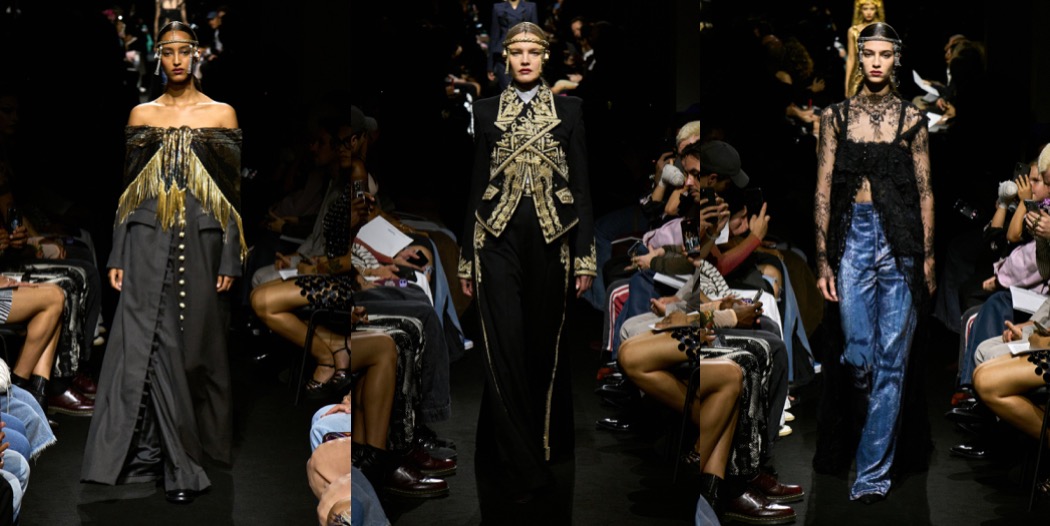 At Rabanne, Dossena’s ability to modernize chainmail and turn it into new techniques in zillions of ways has been one of the hallmarks of his talent – that, and the slant on bohemian glamour that frequently comes through his collections. His unmistakable double-salute to Gaultier and Rabanne was to whip up a replica of the famous pointy-bra dress from Gaultier’s first collection in 1984 in silver chainmail. But the dimension of Gaultier’s work which sparked Dossena’s imagination the most was his street-observation and inclusiveness – decades before it became fashionable. “Jean Paul was really the first to treat fashion as almost sociology, watching what people wear in the street, expressing communities in his shows. Joyously mixing people together.” Dossena’s presentation of chic-ified looks included a pinstriped trouser suit and a lace dress over a pair of trompe l’oeil beaded jeans with sweeping trains. Mid-way, in a stunning moment that spoke dramatically to the beauty of human togetherness, he draped shining gold and silver swathes of chainmail to connect pairs of models – a man apparently carrying a woman’s train, and two individualistic goddess warriors, each symbolizing a different culture. There were references to Gaultier’s giant trapper hat, to the sweeping floor length coats in his “Rabbi Chic” collection, and to off-the shoulder lace he used in his “La Concierge est Dans l’Escalier” show. Dossena said he’d deeply related to Gaultier’s habit of trawling flea-markets for vintage finds – a route into developing rich techniques. Part-way, there was a dress made of Irish-crochet lace, embroidered with gold paillettes meticulously made to look vintage. There was a peach satin lingerie dress layered over black lace, a floral lace apron worn over tailoring. And just as you thought Dossena might have missed a little something of the subversive wit that got Gaultier permanently labeled the Enfant Terrible of French fashion, sure enough, there it was. Clearly glimpsed through a couple of sheer dresses, a pair of trompe l’oeil embroideries of pubic hair. Sitting in the front row, Jean Paul Gaultier raised his eyebrows and chuckled as they passed by.