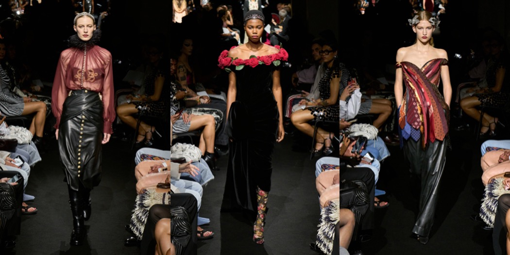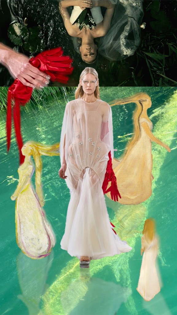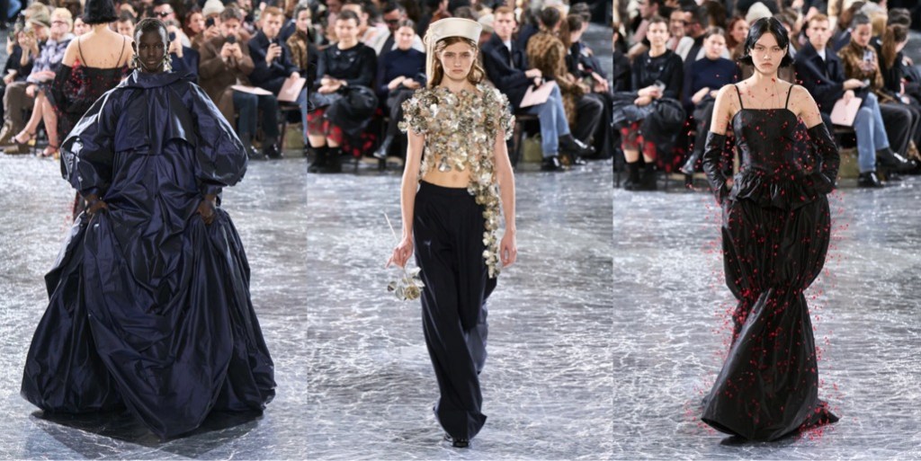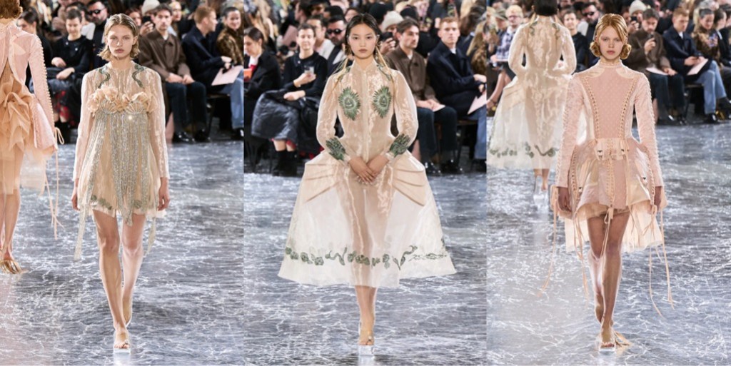 When Jean Paul Gaultier announced Simone Rocha as the guest designer for the spring-summer 2024 haute couture collection, it was clear that this unexpected match would result in an intriguing dialogue between Parisian artisanship and the Irish designer’s idiosyncratic take on femininity. The way Rocha interpreted the iconic JPG cone-bra into thorn-shaped protrusions signaled that she, unlike the previous guest creatives, will take a closer look at the couturier’s interest in the female body. This took her to the idea of playing with contrasts of couture: the tension between restraint and fragility. “His love of the breast and the hip and the female form – exploring that and harnessing it,” the designer said, explaining all the skirts and gowns buffeted with crinoline panniers and bustles. Corseting, another Gaultier landmark signature, seemed to be Rocha’s favorite element to play with. The designer treated the corset “as a security and this kind of second skin on the body.” The tattoo prints earned certain pagan mysticism in her hands, something I always love about her London shows. Meanwhile Breton stripes were represented by navy ribbons tied into bows and tacked loosely to illusion tulle, which also appeared on offbeat padded underpants. This was definitely a noteworthy fashion experiment to unpack.