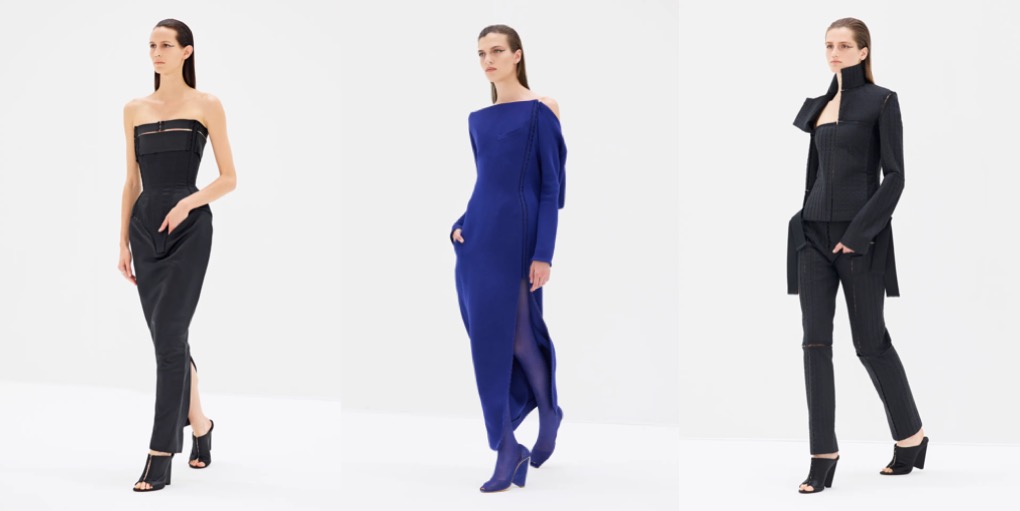 The rather mild haute couture week in Paris suddenly heated up near its end, all thanks to Nicolas Di Felice‘s guest collection for Jean Paul Gaultier. It was absolutely refreshing to see the designer outside the context of Courrèges, and with the tools of couture in his hands. The French enfant terrible of fashion made a strong impression on the Belgian designer when he was a teen: “for me and for so many queer, different people from the countryside – from everywhere in the world – he represented Paris, a city where everything is possible. He was really the first one to celebrate different people. Everybody remembers this about him and it’s a good thing, because he actually did it.” The collection told a story about a Paris arriviste, who wears covered up clothes: jackets and dresses with long sleeves, long skirts, and necklines that climb up the face. Slowly, as the show progressed, the head emerged, then the shoulders, and by the end, dresses were peeling off the hips and hands were tucked into the gaps in the fabric in an erotic gesture. The motif of adaptability-to-the-body returned throughout the collection, and it was masterfully applied in a gorgeous slip dress that was worn undone to the waist, exposing a sleeveless shell underneath on which hooks-and-eyes were applied like studs. Di Felice chose to reference Gaultier’s subtler moments, especially his precise technique of cut and sharp, yet feminine tailoring. Everything synced so well. Now imagine Di Felice do haute couture at Courrèges!