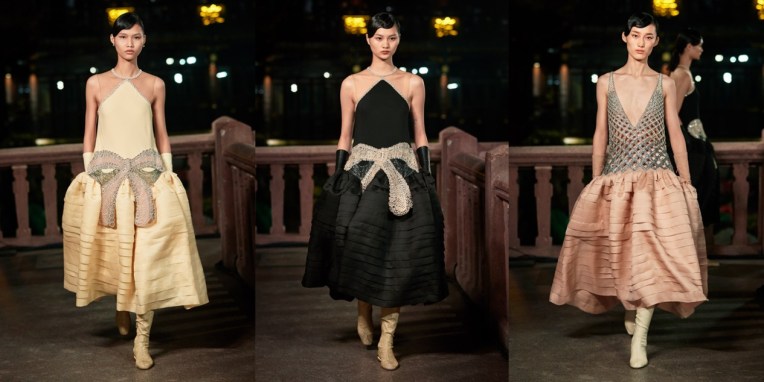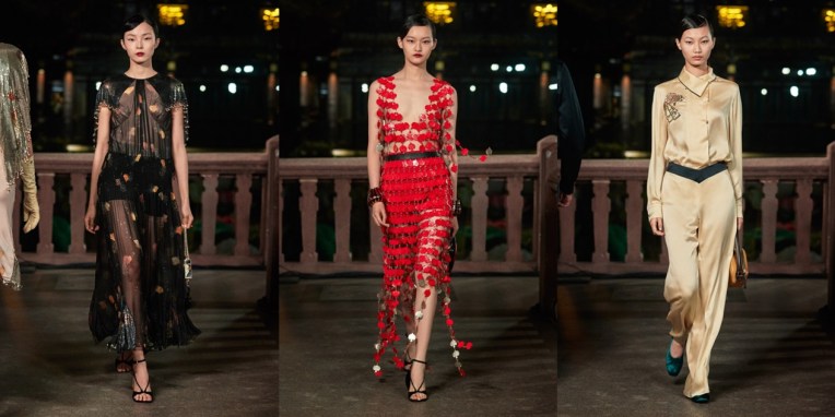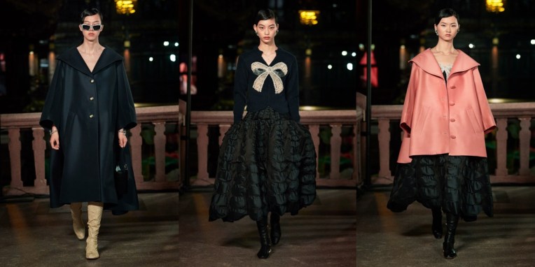 Alongside creative meditations on Mariano Fortuny’s pleats and Murano glass beads, Copping also introduced striking double-flared silhouettes, ornamented capelets, and tweed tailoring featuring a skirt pinched with a brooch. One velvet column gown in ink black is dramatically gathered by a modernist, brooch-like embellishment. This one felt absolutely Parisian, “chic ultime“.