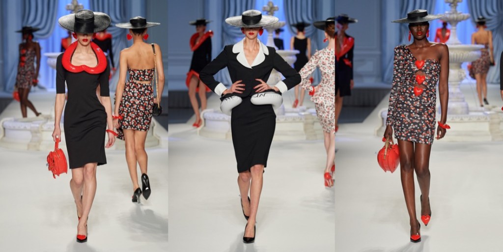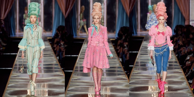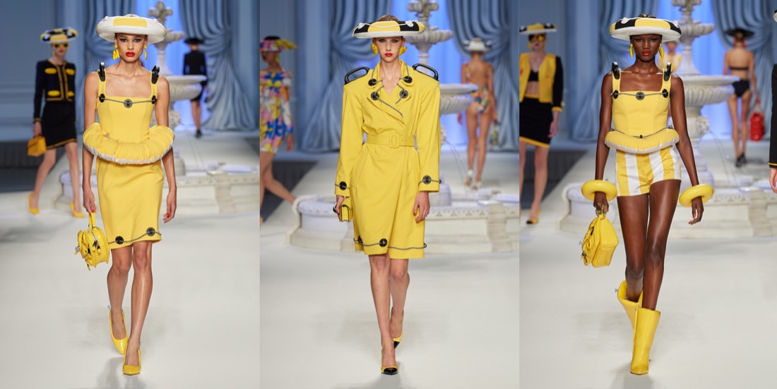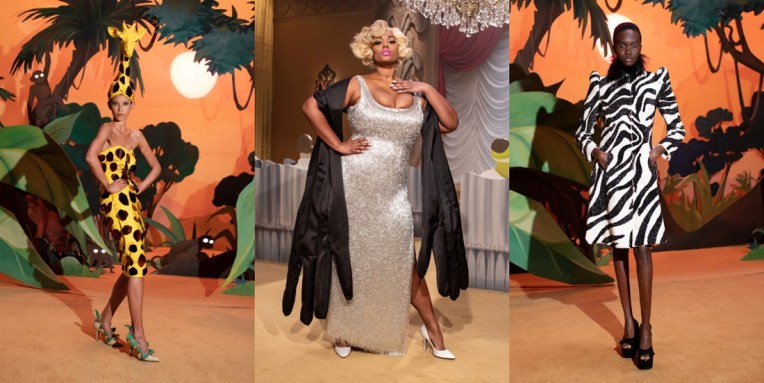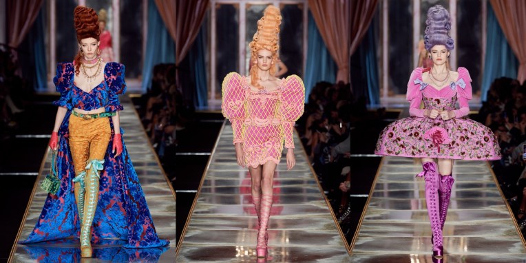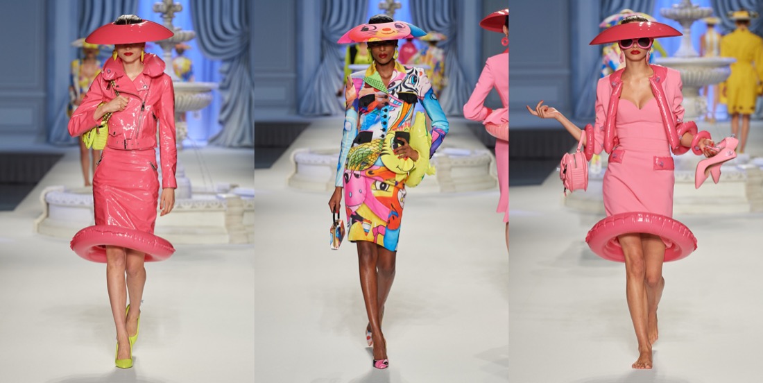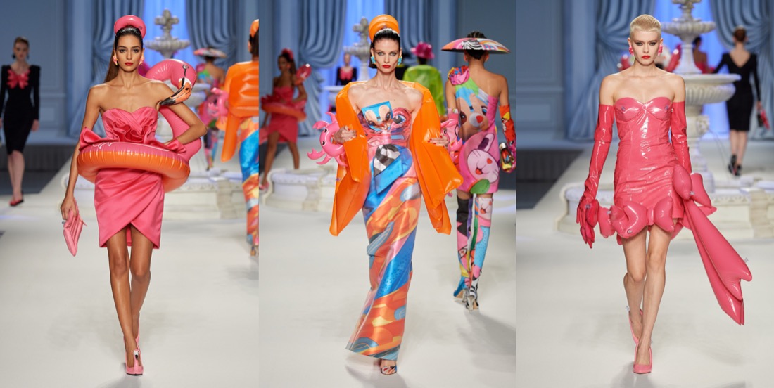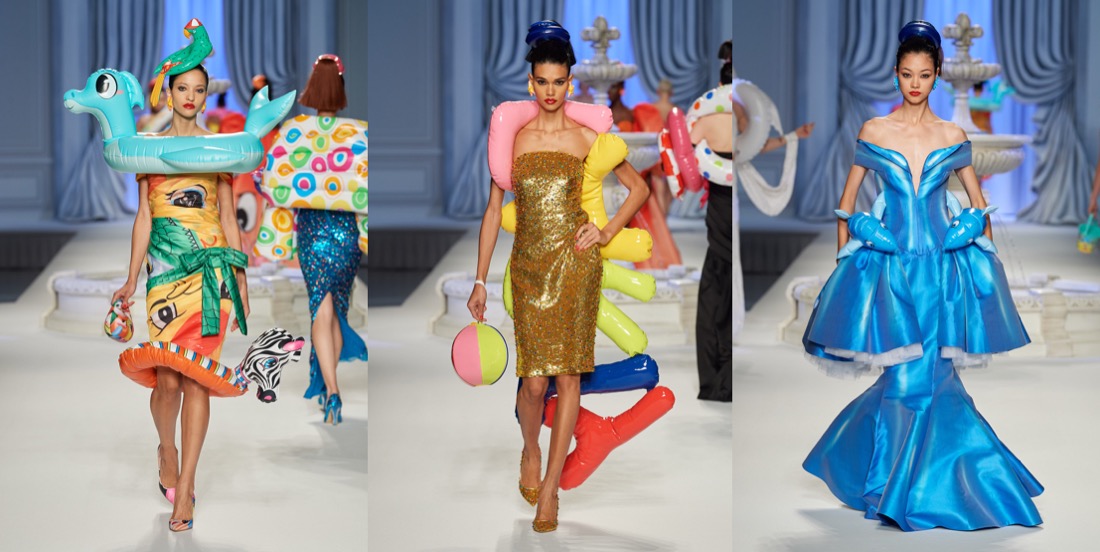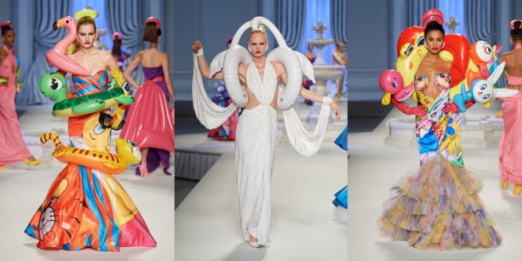 At Moschino, there’s no such thing as too much camp. Jeremy Scott started his spring-summer 2023 collection with a bunch of looks that nodded to Yves Saint Laurent’s signature silhouettes, and ended with over-the-top eveningwear. But that wasn’t just that. One thing connected these two parts: inflated, plastic pool toys, which were everywhere. “Everybody’s talking about inflation,” the designer said backstage. “The cost of everything’s going up: housing, food, life. So I took inflation into the collection.” He wasn’t talking about rising hemlines or oversized volumes either. Every look save for a small handful had some sort of inflatable detail, be it a heart-shaped collar or hemline or “broken heart” lapels, one half on either side of neatly tailored jackets. “Sometimes we feel like we’re drowning,” Scott continued, acknowledging the bad news stories clogging our feeds. “I’m sure you do. I know I do. But no matter what is going on, we have to save space for joy, right? The darker it is, the lighter I have to be.” Making good on that promise, he embellished his evening looks with pool floaties. The most inspired of the bunch included a strapless purple column cinched at the waist with the deflated ends of a pink raft, its pneumatic ends creating a train, and another strapless number that was accompanied by a Lilo stole. By the end, Imaan Hammam’s look was more of a floatation device than gown, but that was Scott’s point. Anyone who could use a little buoying up, Scott’s your pool boy.