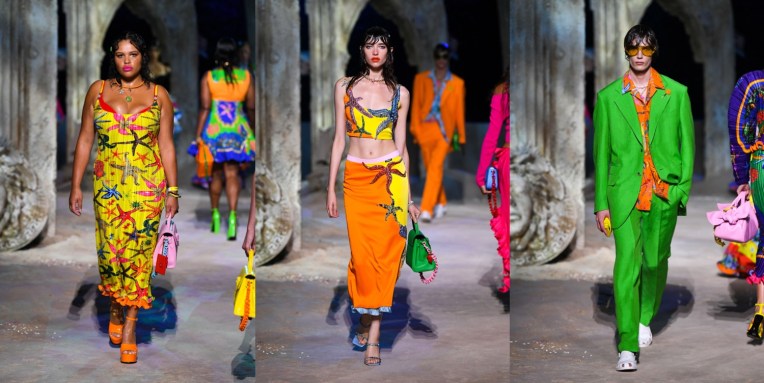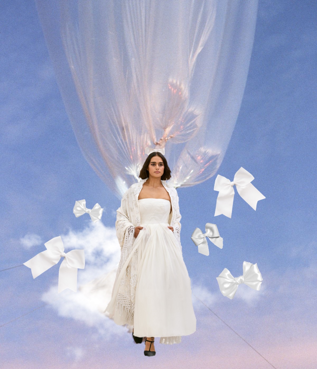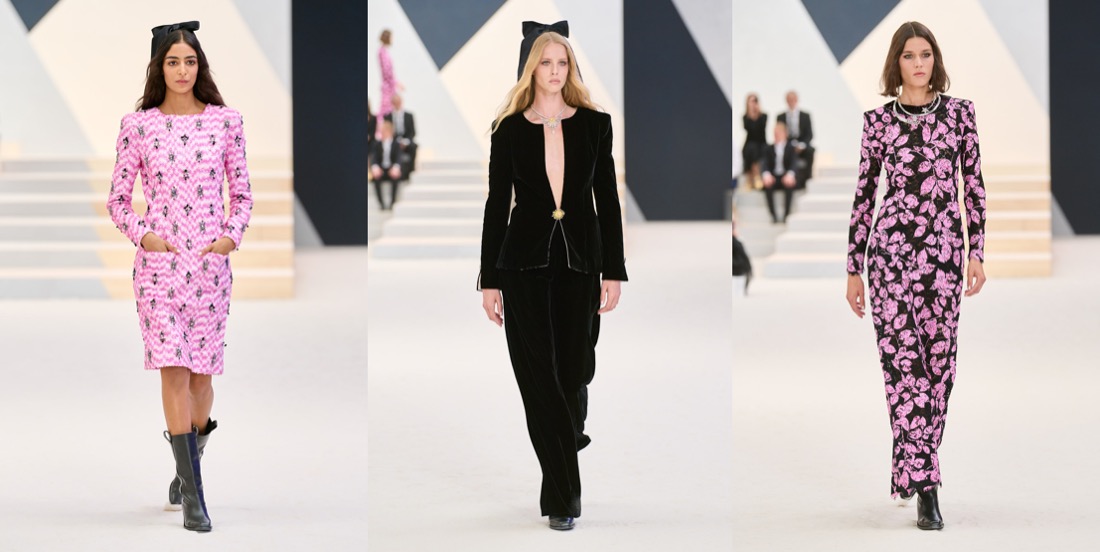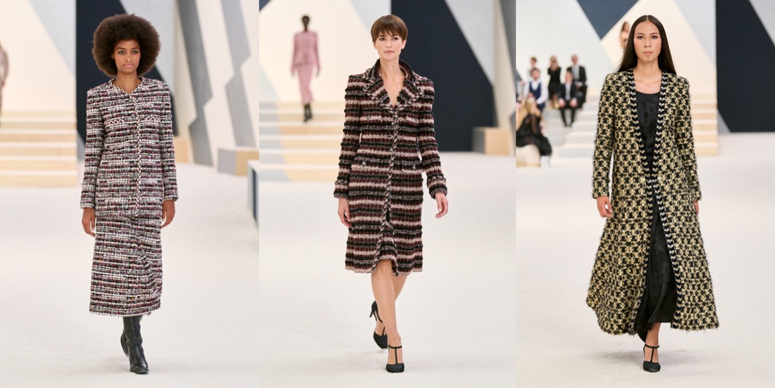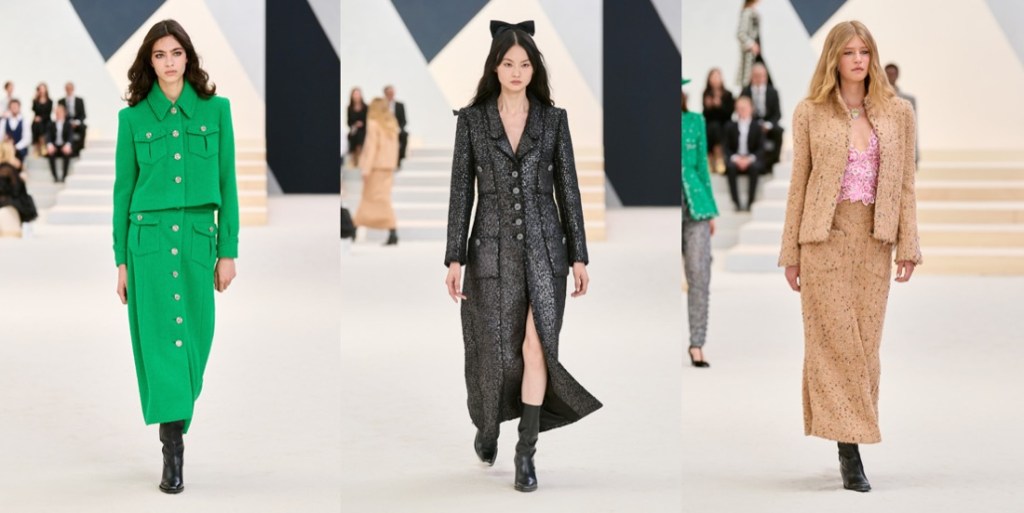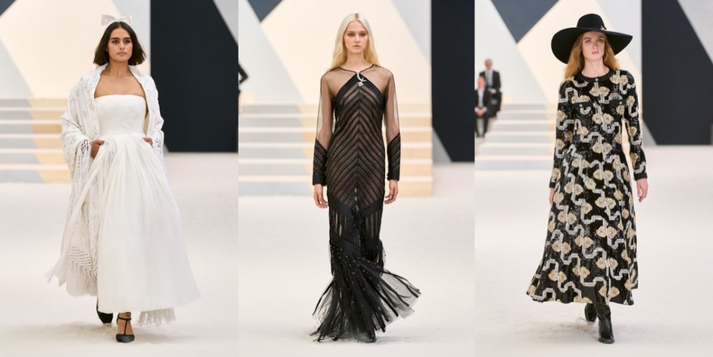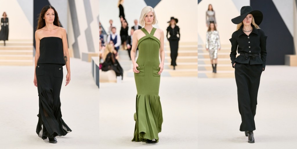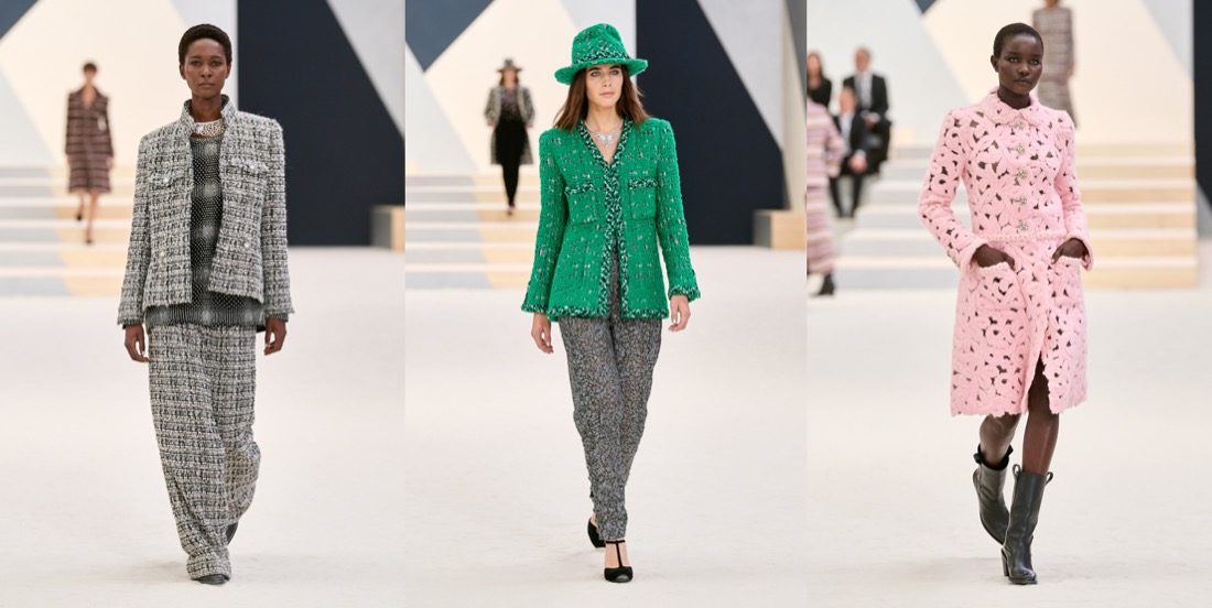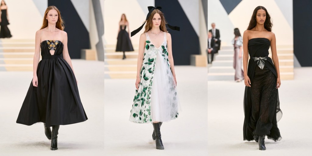 This Chanel haute couture certainly won’t appear in fashion history books, but it did please the eye. For Virginie Viard, her collections reflect the pragmatic needs and desires of the house’s clients and her own eclectic but never fantastical sources of inspiration. Not for Viard the sweeping statements of her mentor Karl Lagerfeld, who might impose a powerful new silhouette on practically every look in a collection, but instead a sense of gentle evolution and a myriad of references and inspiration sparks that might range (as in this collection) from a blinding memory of Inès de Fressange dressed by Lagerfeld in a jacket of bright grass green and shocking pink (for a 1988 Chanel couture show, when Viard first joined the house), to a shot of Fred Astaire in cinematic action, the tails of his white tie evening coat caught flaring out in mid-dance move, to a 19th century shot of a real-life Annie Oakley, to archive Chanel references from slouchy 1920s day suits to slithery 1930s gowns to prim 1960s tailoring, to Lagerfeld’s vividly impressionistic sketches from the 2000s. None of these references, however, are used by Viard literally, but instead serve as starting points for outfits that evolve with the input of the textile designers and makers who weave those extraordinary painterly tweeds, and the dressmakers who understand how to make perfect pleats that “move beautifully,” as guest Sigourney Weaver enthused, “and are just so elegant.” That Astaire flare, for instance, might translate into the kick at the hem of a calf length skirt, the Oakley image into a dirndl skirt with practical pockets that encourage a certain assertive body language, the ’30s house archive references into slinky evening dresses deftly cut to fall straight to the floor when standing still, but that break into swirling movement below the knee when the wearer walks. To set the scene, Viard reached out again to the artist Xavier Veilhan who created a Constructivist set for the spring couture collection. This time, Veilhan built a series of structures that formed a symbolic landscape (arches, bullseye targets, mobiles, cubes of bubblegum pink recycled plastics) in the sandy outdoor stadium of the equestrian L’Étrier de Paris center in the Bois de Boulogne. Guests walked through or around these structures before moving indoors to more sand and a set of kinetic color blocks in black, white, sand yellow, and gray. This gently suggested something of the art deco flavor to the drop-waisted dresses and linear shapes that appeared in some looks in the collection. The symphonic soundtrack, created by Viard’s friend Sébastien Tellier, was set to a video projected on a giant screen as a backdrop to the parade of girls, an impressionistic clip that featured an varied cast including Charlotte Casiraghi and Pharrell Williams. That eclecticism continued with the clothes, showcasing amazing textiles – lace painted in resin; a shower of embroidered leaves on a white tulle trapeze dress, shadowing a print of the same motif underneath; an all-over deco print on a bell-skirted coat dress that on closer inspection turned out have been entirely beaded in sequins by Lesage; or tufts of ostrich plumes painstakingly applied to black chiffon and glimpsed through the openings in a streamlined trench coat of textured black tweed.