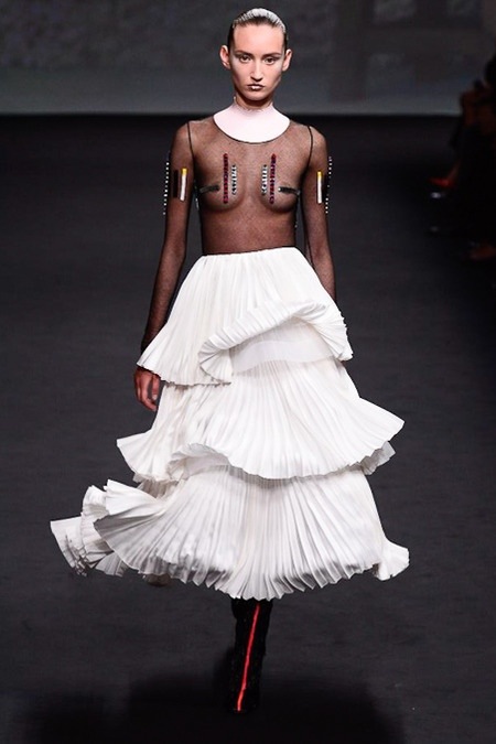 Dior Haute Couture by Raf Simons was in my personal opinion a fail. That was the worst collection by Raf Simons ever. Inspired with women from African tribes and different cultures, this haute couture went totally bad. First of all because… It wasn’t really couture! The AW13 of Dior was more Haute than this. Here you could see simple coats with small scarves worm with it and dresses with stripes and a bit of embroiderment on the tops. Nothing else. And the shoes? The most horrible part! There was also a scandal that Raf Simons is a racist- he never put black women models into his shows. This season that changed with Joan Smalls and others, but still a problem appears about the… Boob size!