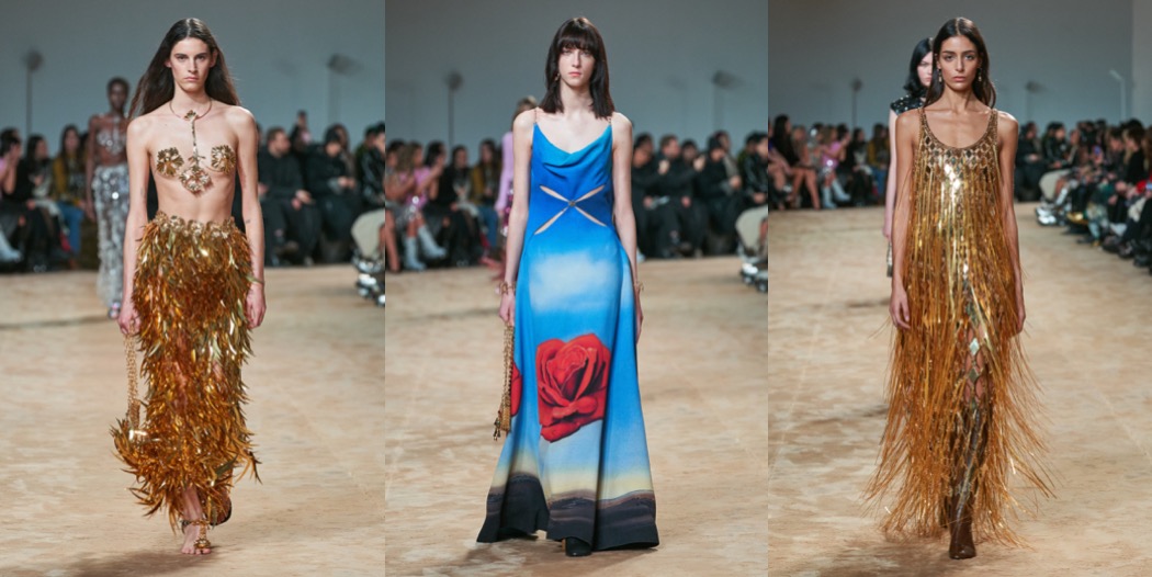Similarly to Dries Van Noten‘s Julian Klausner and the Proenza boys at Loewe, Rabanne’s Julien Dossena was mentally by the beach this season, surrounded by surfers in spirit. His collection, however, felt among the most intriguing – especially in its brilliant menswear. There weren’t many looks, but each one, styled with scuba-diving pants, oversized flip-flops, and vintage Hawaiian-print shirts, exuded an undeniably cool attitude. The metallic flower necklaces – a nod to Paco Rabanne’s conceptual use of metal – added an especially striking touch. The interest in scuba style recalled Nicolas Ghesquière’s now-cult-classic Balenciaga collection from 2003. Dossena, who worked with Ghesquière for years, had the Louis Vuitton creative director cheering him on from the front row. As for womenswear, Julien played with 1950s pin-up references, making skirts fuller, florals bolder, and colors flashier. His use of exaggerated belt buckles gave the collection a tongue-in-cheek energy.
