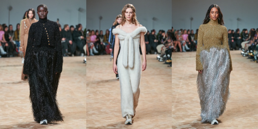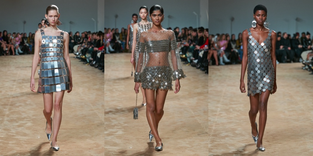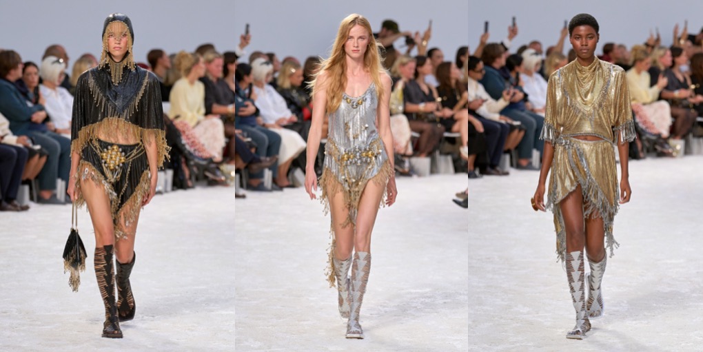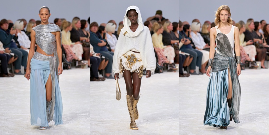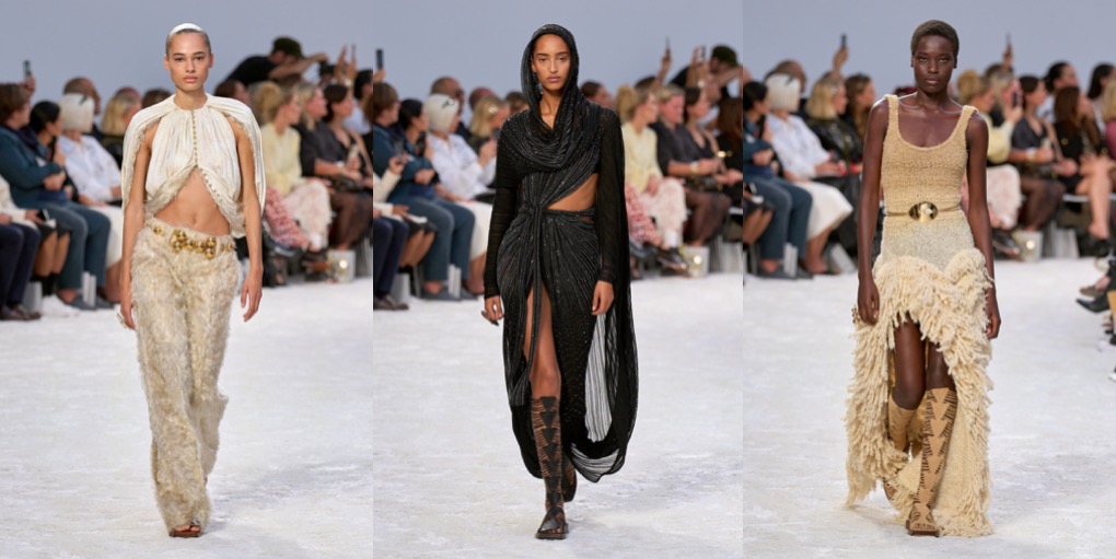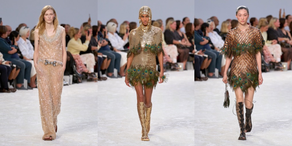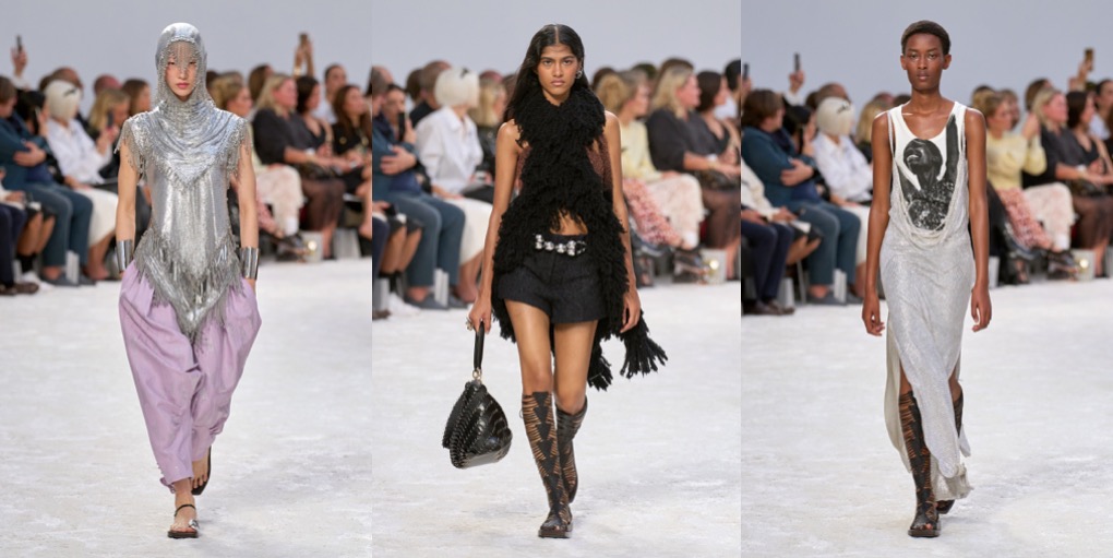 At Rabanne (no longer Paco), Julien Dossena had a mesmerizing collection featuring nomadic warrior women in chainmail armours (occasionally weaved with peacock feathers) and gilded textures. “I’ve never been that interested in the bourgeoisie,” the designer quipped backstage. “I can play on the codes but it’s about exploration for me.” Going by the pictures Jean Clemmer shot for Paco Rabanne in the 1970s, Dossena imagined a kind of warrior beach woman whose wardrobe was founded in ancient constructions. “It’s a woman by the sea, black and white, in the sun with a little loincloth and a jewel. It’s an exalting sensuality. It was a strength I wanted to work on,” he explained. As a meta inspiration element, he printed the pictures on tank tops. The look materialised in hooded mini chainmail dresses, sarouel trousers – “the original first clothes we ever wore: a square with two tubes” – and rustic, organic textures Dossena attributed to the work of the artist Sheila Hicks. “Like a carpet you’ve made a dress [out] of,” as he put it. “I wanted everything to be handcrafted: the feeling that someone touches it; sensual; destroying the fabric; threads.” It made for an ancient sensibility that felt kind of sci-fi. Dossena’s time-travelling looks gave off everything from Athena to Amazon to gladiator to Joan of Arc. “Tender and strong,” he said. “It’s a kind of community: a tribe, a gang of women who express their own sensibility and sensuality.”