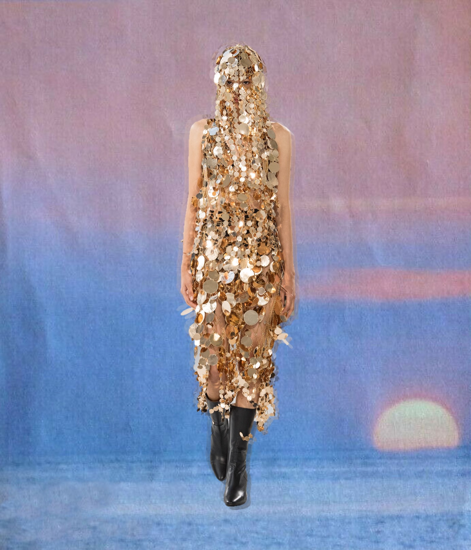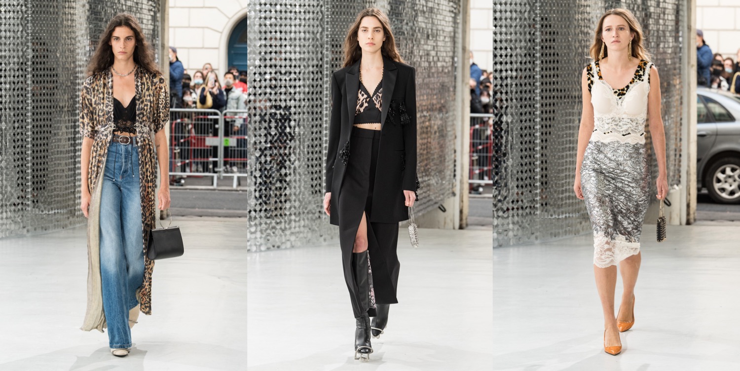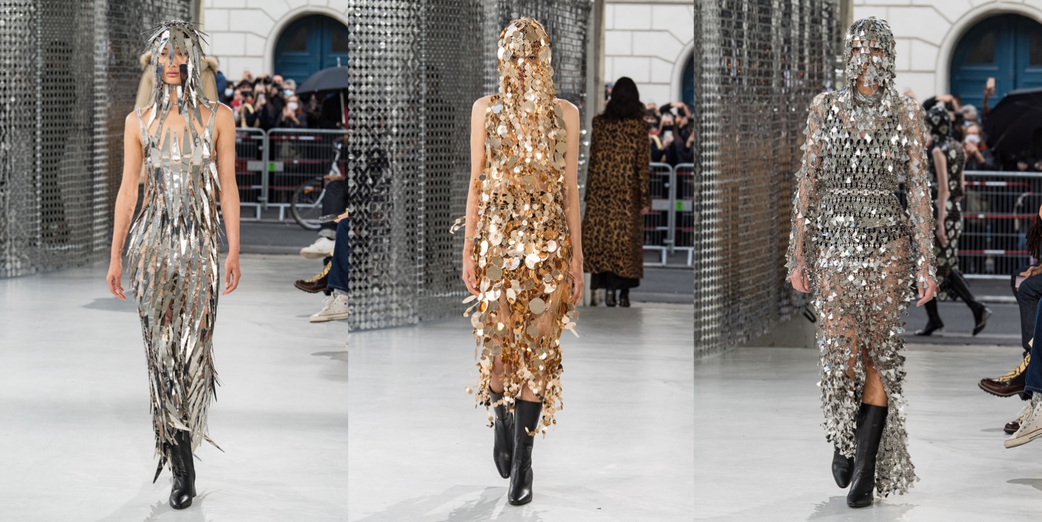 Like many designers this season, Paco Rabanne‘s Julien Dossena focused on his signatures. Spring-summer 2021 show was an impressive vocabulary of the designer’s distinct takeaways he came up with for the brand – and it ranges from clothes you would see on the streets in Paris to chain-mail craftsmanship which equals to couture. And, as a matter of fact, the runway started on an actual street. The venue had a wide-open entrance in the background – the glimpse of the street was an intentional part of Dossena’s love letter to the girls of his neighborhood, not just the need of keeping Espace Commines safely aerated for the occasion. “I realized how much I’ve been missing being in the streets, passing people, looking at their style,” he said. “I’ve always lived just near here, between the Third and the 11th arrondissements. It’s a really diverse area, with people coming from everywhere, and expressing their individuality. I wanted to work some local realness. It’s what I’ve been really happy to get back to after confinement.” Recent controversies in France have made Dossena all the more convinced that he wants to stick up for young women’s rights to dress as they please: “I wanted to show a generous, affirmative sensuality. I was really noticing women in the street who were brave enough to embrace their femininity. Wearing super-short skirts, décolleté, and being proud of it.” Without even knowing what informed that underlying subtext some of the contrasts between last season, which was staged in the grand surroundings of the medieval Conciergerie, and this one, are refreshingly apparent. There’s the new emphasis on long-line jackets and midiskirts, a mix-up of sequins and stripes, lace and lingerie tops, and the suggestion that, actually, the glittery glamour of Paco Rabanne can go just as well with jeans. “And a kind of ironic flea market feeling,” he added. Many of the women walking in his show were friends: actresses, writers, interns, junior designers, students. Most definitely, everyone who was French in the house would have been conscious of the relevance of Dossena’s crop tops and the fact that he’d very visibly implanted bra cups into his complicated lace slip dresses. Since schools returned in September, a national row broke out when teenage girls were turned away from schools for wearing cropped tops and short skirts. The girls – protesting against being gaslighted for indecency and provoking boys – started a hashtag calling for all high school students to turn up to school on September 14 wearing something provocative. “It’s just so old-fashioned, these attitudes in France,” Dossena says. “These girls were really rioting. I’m so impressed by them.” Most definitely in the grown-up and otherworldly zone was the procession of all over pailletted, helmeted women who ended Dossena’s show – feminist guardian warriors, if you will. “If you look, some of the triangle paillettes are like knives, like a weapon. It’s quite a tough realness,” Dossena smiled. “We are definitely not about doing comfy bourgeois collections here.”