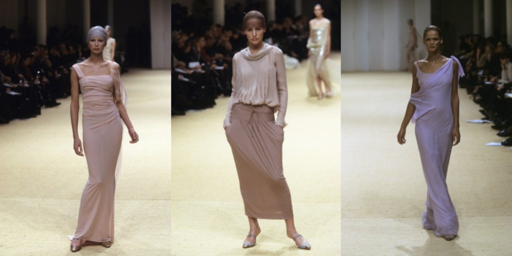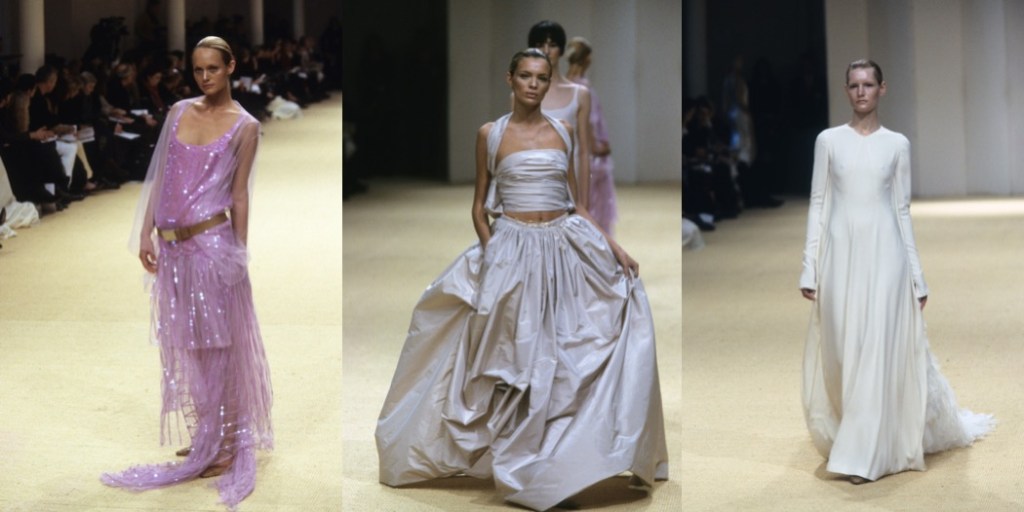 Lightness is the quality that made Karl Lagerfeld’s late 1990s and early 2000s haute couture collections sing. He gave the concept a literal spin for spring-summer 1999 by abolishing black from this collection entirely. There was a quietness to this line-up that the neutral and pastel palette contributed to. Floating tulle and organza captured the collection’s dreamy mood in a truly delightful way. Maisons de couture have workrooms dedicated to flou (draping) and tailoring. Lagerfeld didn’t ignore the latter, but there wasn’t an ounce of stiffness in the soft, almost sporty, haberdashery he sent out that season. Bold accessories offered a contrast to the suppleness of the collection. Small, sculpted gold bags and earrings that were abstract falls of silver hoops inserted a sort of tech-y vibe into the goings-on and seemed to signal that as the fin de siècle loomed, Lagerfeld was looking forward, not back. The relative scarcity of Cocoisms meant there was more room for a bit of playfulness, like the triple scoop of sherbet-colored taffeta looks that appeared near the end of the show, worn by Devon Aoki (raspberry), Colette Pechekhonova (blueberry), and Esther Cañadas (lemon). They proved so utterly irresistible that Uma Thurman wore Cañadas’s dress to the Oscars that year.