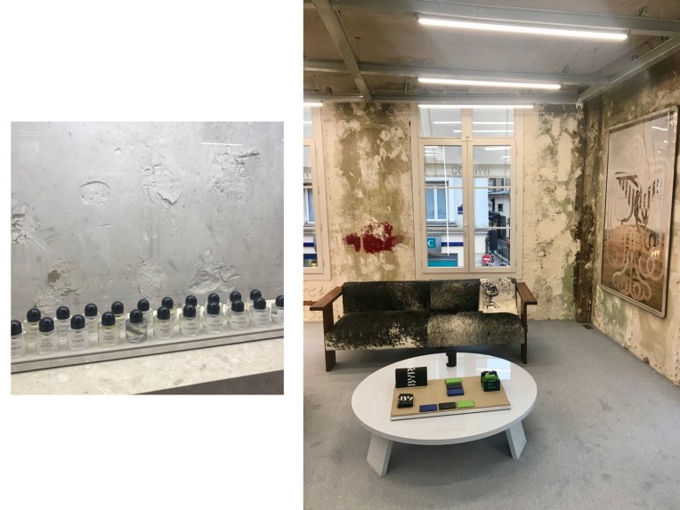 Situated on Rue St.-Honoré, just a few doors away from Colette’s former location, Byredo’s boutique occupies the ground and second floors of a 1990s building. Here, creative director Ben Gorham has opted for a refreshingly different aesthetic for his French outpost. The backdrop is raw, thanks to the pairing of an exposed ceiling and walls with plentiful of wall scribblings created by M/M (Paris), a Paris-based design agency with which Gorham collaborates on all brand visuals. Further boosting the artsy vibe are the agency’s large-sized posters of Sarah Morris‘ films, wall-mounted in plexiglass frames. Here you will find the entire Byredo fragrance and beauty line, as well as a selection of their bags, leather accessories and blankets.