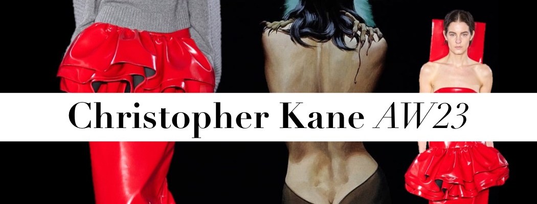 Sexuality is the focus point behind every Christopher Kane collection, and he manages to always approach it in a strikingly different, intriguing way. This time, the notion of it was amplified as a recording of a cat purring in the show’s soundtrack, a sensual metaphor for female pleasure. Animal instincts, biology, his working class Glaswegian school days, and, lately, artificial intelligence are all wrapped up in the matrix of Kane’s imagination. At a moment when it feels as if fashion ought to be going towards something cleaner and sharper, there he was, cutting plain gray school uniform shifts, but with stiff geometric upstanding collars that he later alarmingly called “chopping boards.” Then, his grappling with nature wasn’t all it seemed, either. There were pretty micro-flowers and solitary daisy embroideries he attributed to his championing of ordinary urban plants that “grow through concrete,” of the sort he saw growing up in a working class conurbation outside Glasgow. And then, there were his animal prints – overlapping hyper-real images of chicks, piglets, and rats (a TW moment for me) – on stretch jersey body-con dresses. It turned out, when quizzed backstage, that Kane had designed them with AI. “What you do is speak to it, give very specific descriptions, and then it comes up with it.”There are always some things in Christopher Kane’s work which feel a bit covertly disturbing or off – it wouldn’t have its weird originality if it didn’t. What’s for sure, he’s never someone who concocts things for the sake of instant public notoriety and clickbait. What he’s really about is being a designer of hot clothes that give women the chance to have a really great time with fashion.