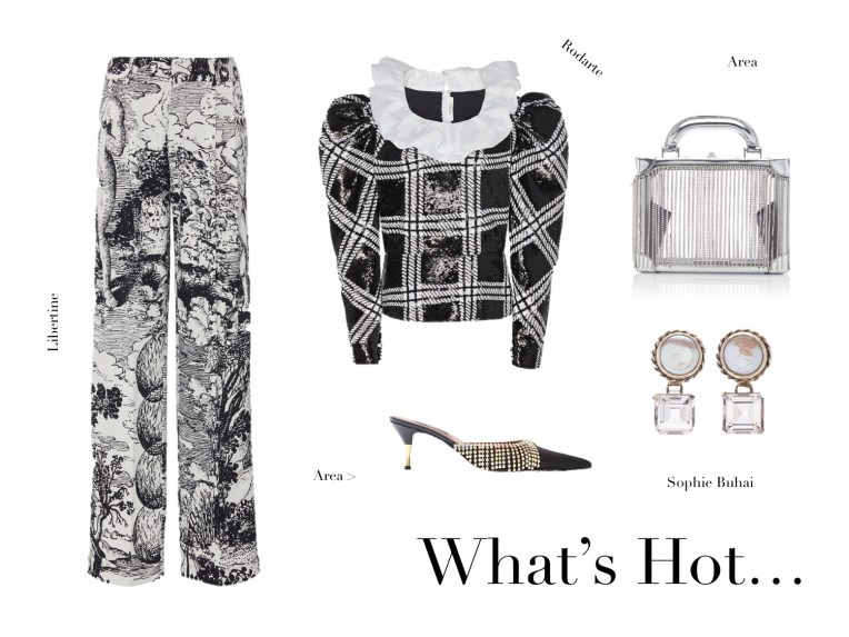 Simone Rocha crystal flower earrings, Khaite ruffled chiffon and satin, Christopher John Rogers gradient evening skirt