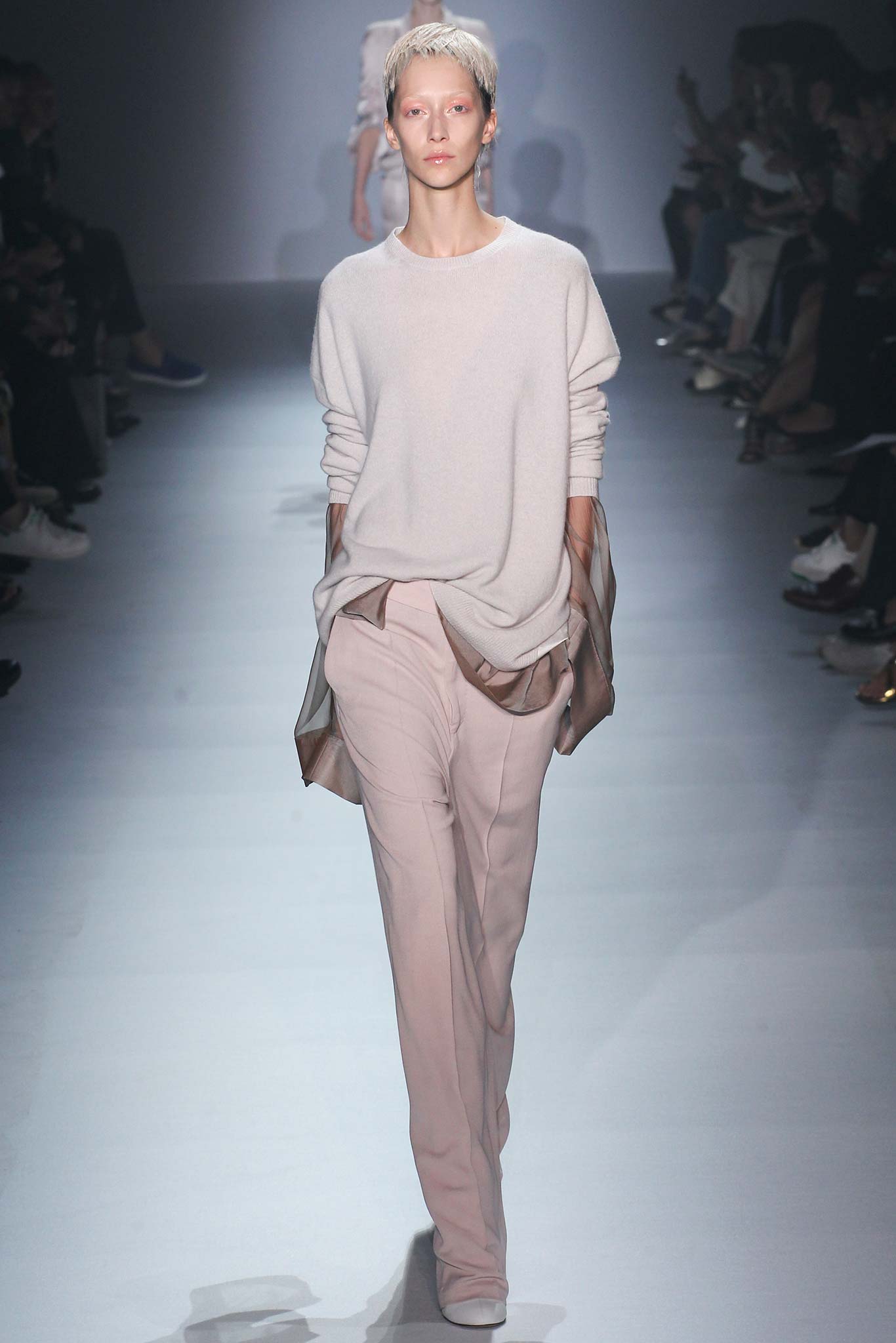 As usual, Haider. You steal the spotlight of Parisian Fashion Week, without having a lot of effort. The summer created by Haider Ackermann is all about flesh-tone silks, backless knitwear and come-undone tailorings. Over-sized sweaters, cool vests, beautiful, blush pink trousers and magical, lilac capes- it all felt like a delicate, breezy summer in Paris. Stiff glossy leather belts orbited skin-tone satin tops and sharp, shoulder-skimming playsuits, while gathered chiffon blouses – slashed to the navel, were loosely tucked into low-slung trousers complete with sporty, racing stripes. Fans of the label’s more androgynous cuts will no doubt be inspired by the sleeveless crepe jackets, floor-length trench-coats and waistcoat tops. Haider Ackermann always ends up on my Parisian favourites. And this dreamy, ethereal surely classifies as one of the most wearable creations yet bt Ackermann. In love with the master-layering as much as in the whole collection. J’adore!
