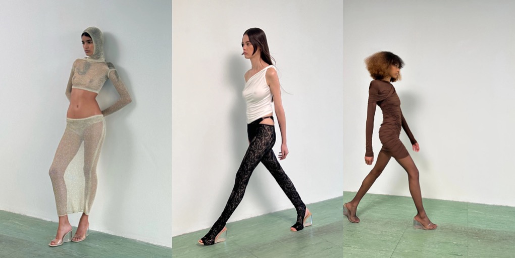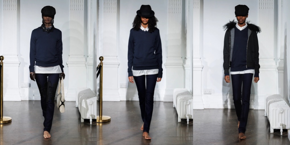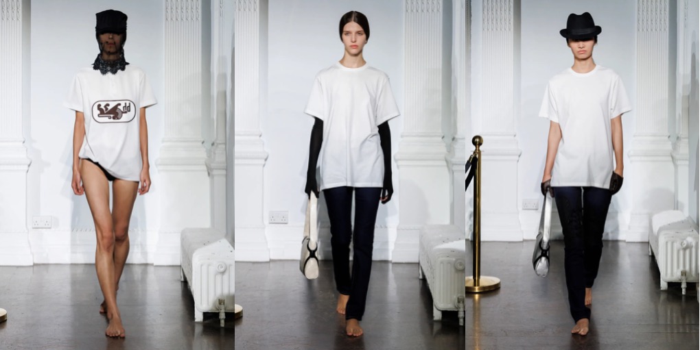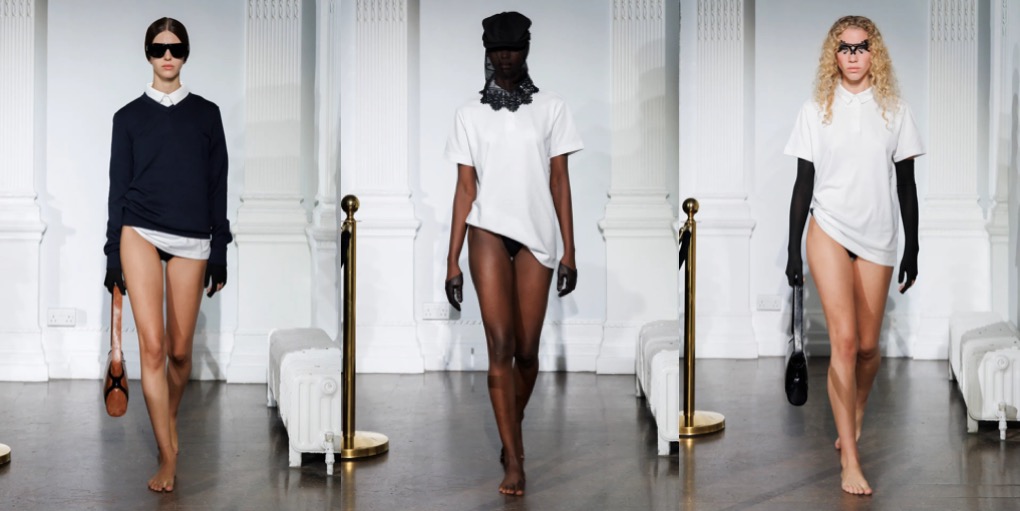 Puppets & Puppets‘ Carly Mark left New York – a rather hostile city for emerging brands – for London, a place that’s resilient and way more supporting for creatives that think outside the box. There’s also an element of strangeness about Mark’s fashion (and accessories). The feeling of unexpectedness was delivered by the deliberately blunt clothes that were just… clothes. Boxy t-shirts, navy crewneck sweaters, skinny black jeans, plain lingerie sets and faux-fur trimmed hoodies. All that was styled with indie-sleazy fedoras (very girlfriend of an Arctic Monkeys member in the late 2000s), big sunglasses and gloves. Was Mark’s intention here an elaborate trolling exercise? Not quite.