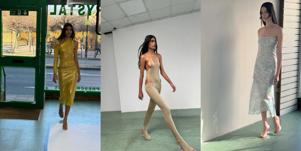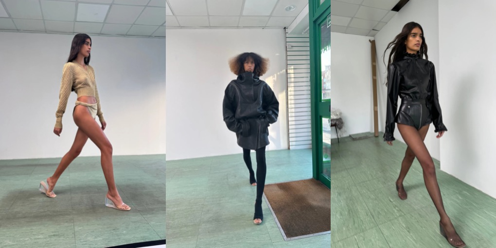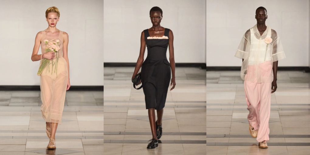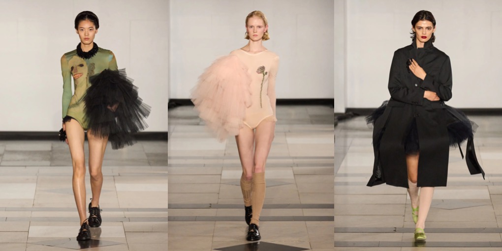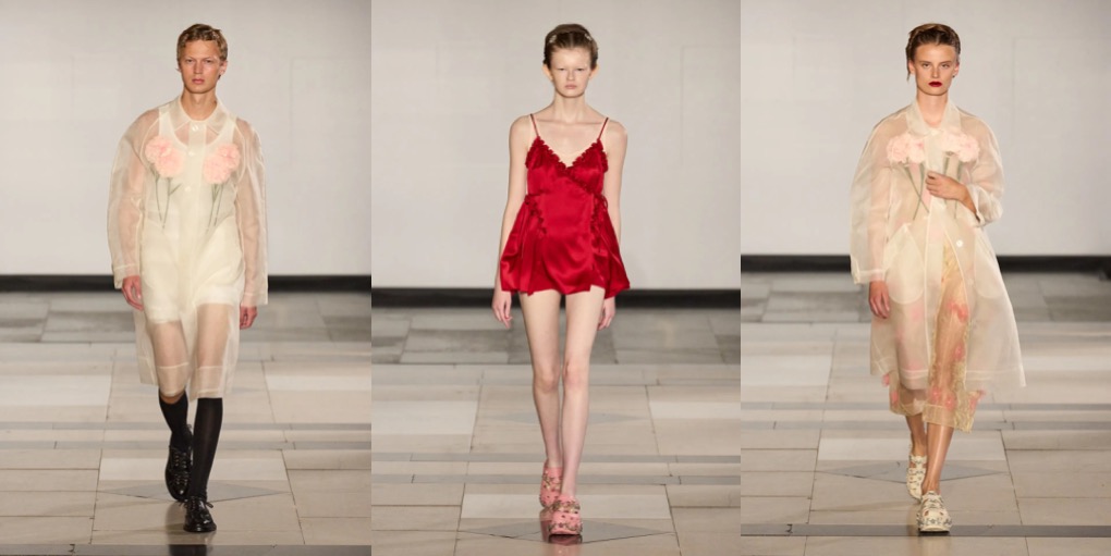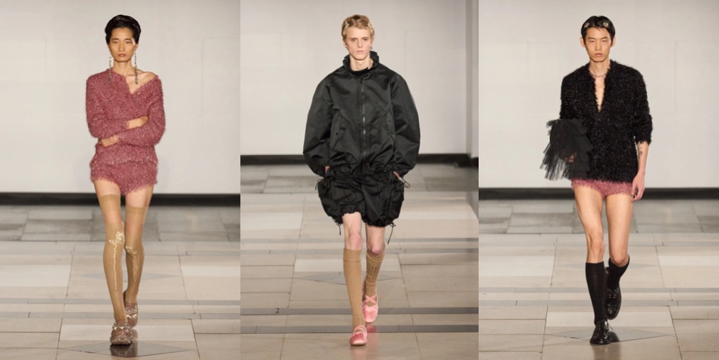 Puppets & Puppets‘ Carly Mark left New York – a rather hostile city for emerging brands – for London, a place that’s resilient and way more supporting for creatives that think outside the box. There’s also an element of strangeness about Mark’s fashion (and accessories). The feeling of unexpectedness was delivered by the deliberately blunt clothes that were just… clothes. Boxy t-shirts, navy crewneck sweaters, skinny black jeans, plain lingerie sets and faux-fur trimmed hoodies. All that was styled with indie-sleazy fedoras (very girlfriend of an Arctic Monkeys member in the late 2000s), big sunglasses and gloves. Was Mark’s intention here an elaborate trolling exercise? Not quite.