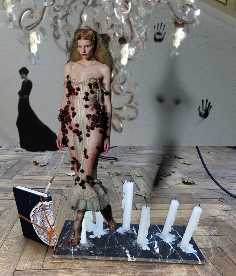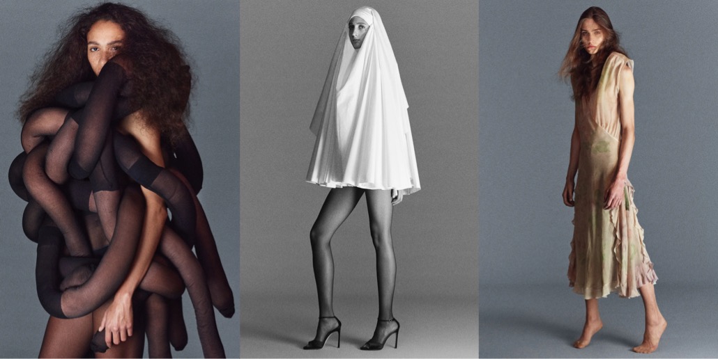 The opening looks were white, draped over corsetry: innocent at first glance, yet carrying troubling undercurrents of tension, even pain. Limbs and faces were streaked with dirt. The models appeared in trance-like states, disturbed, dressed in fragments of collapsing lace lingerie, their faces obscured by metal jewelry sourced by Dilara in Istanbul. One carried an open handbag, its contents threatening to spill out. A woman on the verge of a breakdown? No – a woman ready to cast off societal norms and make her voice heard, loud and clear.