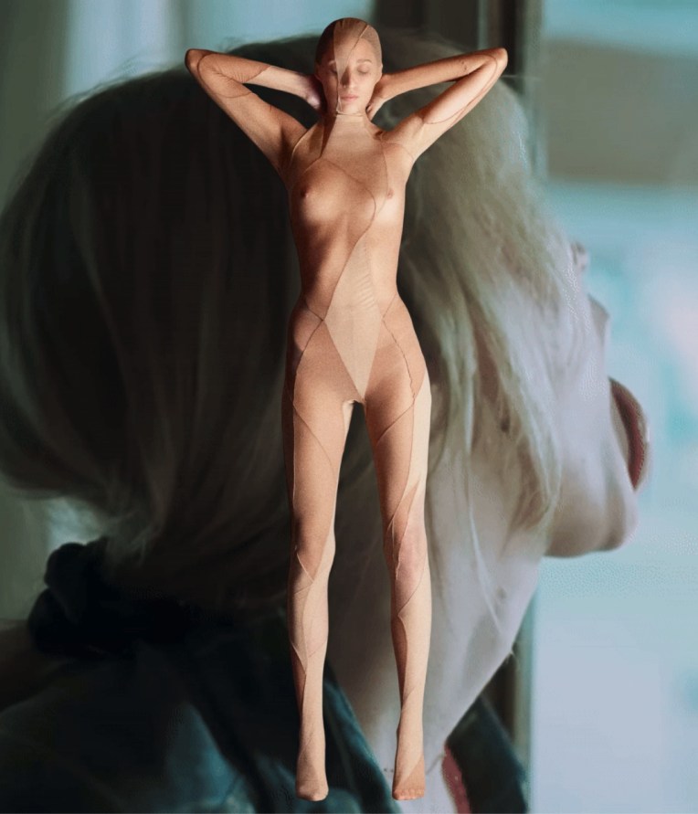 What makes Ponte one of the most exciting projects today – or, as Pontefract himself puts it, neither fashion nor art, but “its own kind of beast” – is the staggering range of techniques he employs, defying easy classification. His work exists somewhere between the orbits of haute couture and arte povera – painstaking yet brutal, innovative yet honest. One of the spring–summer 2026 suits, for instance, was colored in pencil for hours on end, then hand-burnished with a spoon to blend the layers into one another. Another look features a dress made of wire filaments – “finer than hair,” according to the designer – cut by a hairdresser and brushed with magnets. The “second-skin” bodysuits, composed of diamond-shaped pieces of hosiery, have an eerily chilling effect. I have goose-bumps.