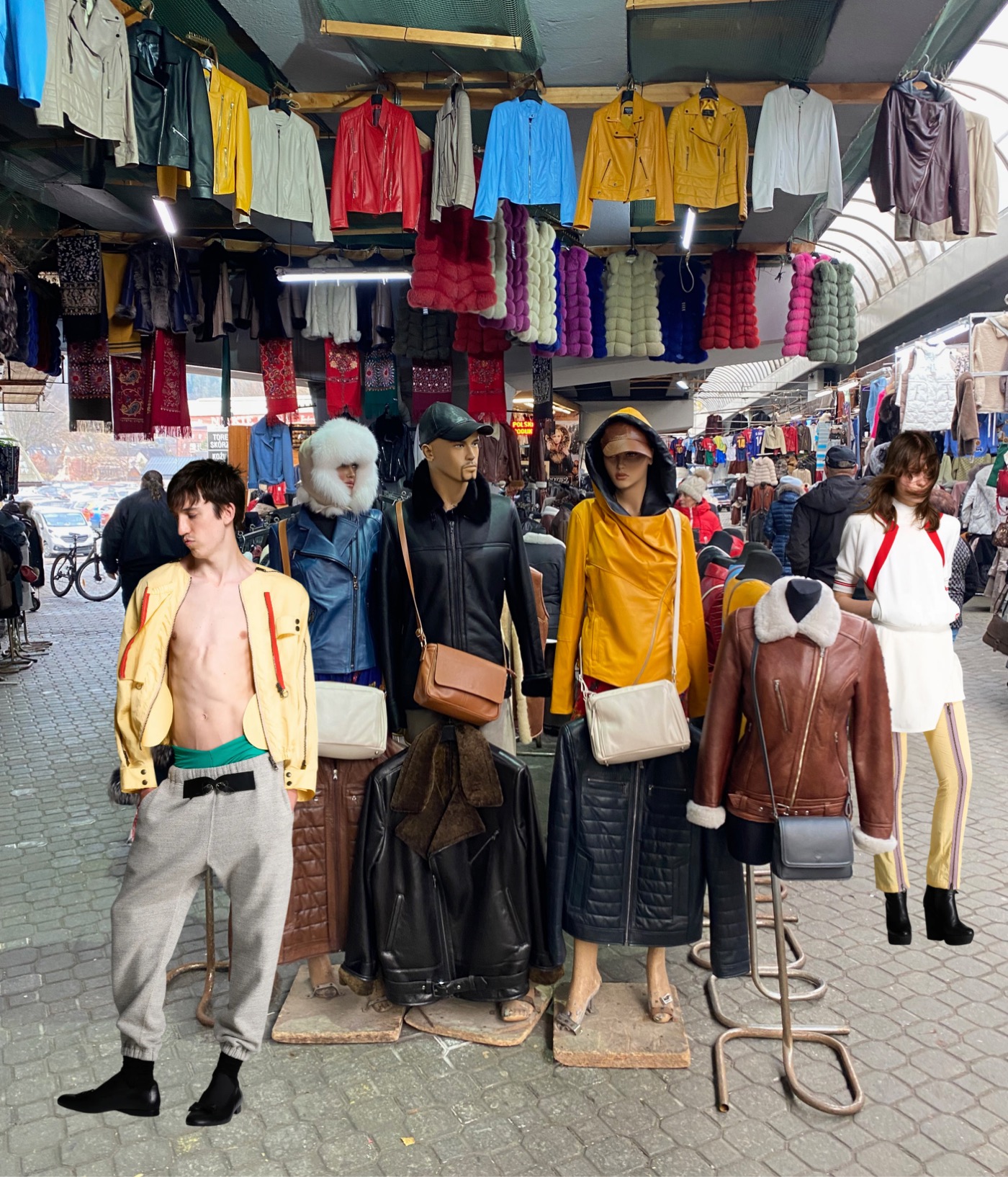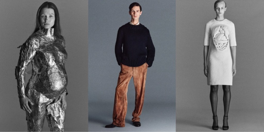 There are also the striking, Sarah Lucas–like experiments: worm-like tubes wrapping the body, or a felted wool dress sculpted to resemble organs erupting from within. And then there’s the mini-dress that, upon closer inspection, is constructed from all kinds of debris – leftover textiles, wires, paper bags, even a tiny putto figurine poking out of its sleeve. It’s stunning – and devastating at the same time.