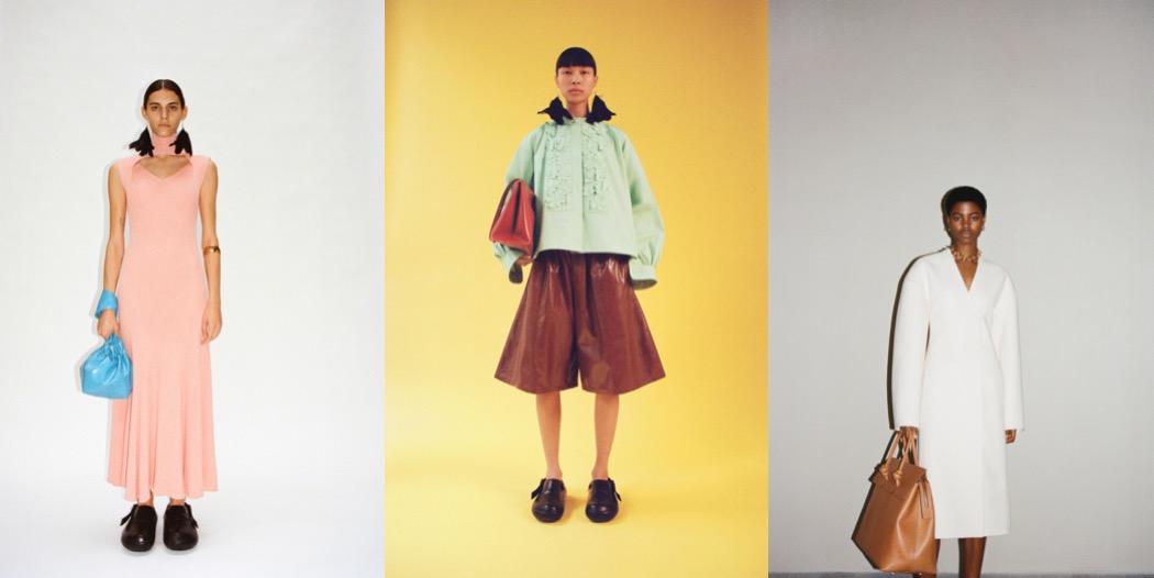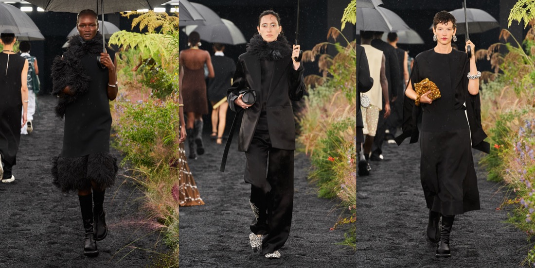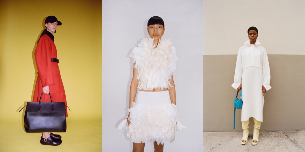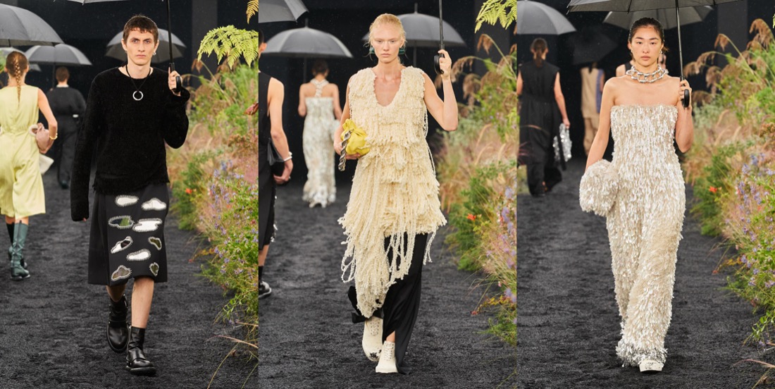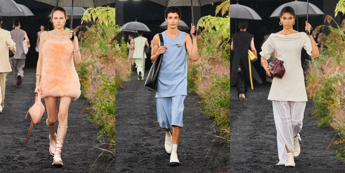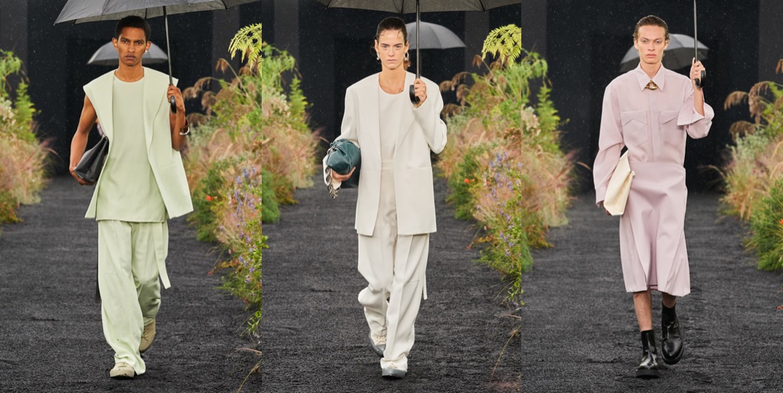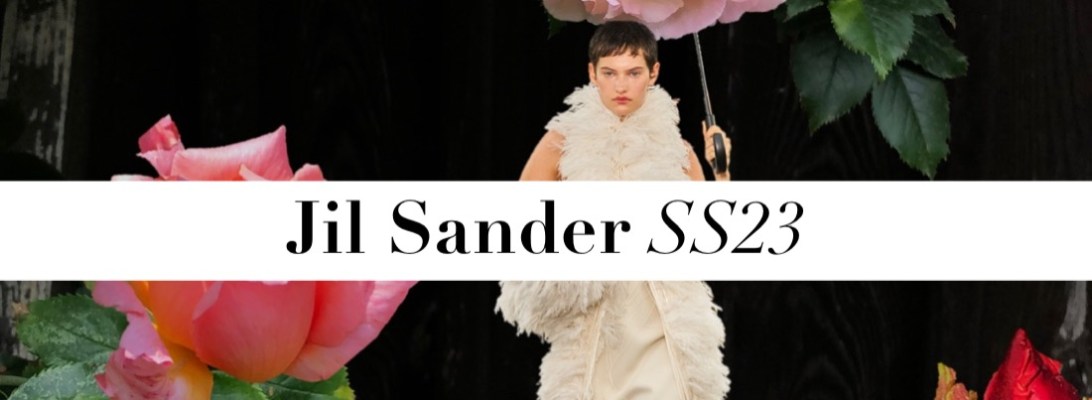 The mood Luke and Lucie Meier were after for Jil Sander‘s pre-fall 2023 was that of “couture mixed with a sportier feel.We like the attitude of elevated functionality, without compromising on interesting volumes and high-quality fabrics and execution.” A clear message indeed, one which they explored in their rainy spring show. The Meiers are inquisitive, soul-searching designers, and questioning their practice is part of the equation. Highlighting the ‘opposites attract’ tension intrinsic to their aesthetic, they asked, “how do you make things that feel very immediate, fresh-feeling, and modern but also have this inherent couture rigor of technique and shape?” The dynamic between precision and glamour, or utility and sensuality played out throughout the collection, with silhouettes alternating between the voluminous and airy, and the slender and close to the body. Classic couture volumes like the cape, the balloon dress, and the opera coat were given a sporty twist and a comforting feel of ease through the counterintuitive use of high-end fabrics. A cape dress was made in thick jersey; a poufy floral-printed and pleated-plastron minidress was cut from papery recycled polyester. At the opposite end of the spectrum, a slender silhouette conveyed a more athletic, agile language in long silk ribbed knit dresses with racerback tops. Remarkable examples of their obsession with the hand-feel of materials were in evidence throughout. A fringed backless top in hand-knitted open-stitch with geometric motifs looked rather striking, as did both a sinuous ivory slip dress with embroidered ajour details and an asymmetrical floral-patterned guipure skirt. On a similar note, four different fabrics were cut into petal-shaped feathers, and then applied decoratively over a miniskirt and a sleeveless top. The effect was both light and luxurious. “Precious in a simple way,” was how the designers’ summarized the allure of the collection.