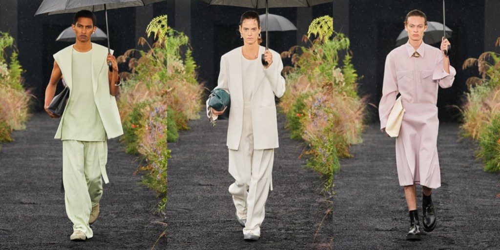 Jil Sander – the designer – is a minimalist, but Jil Sander – the contemporary brand – is minimalist no more. Backstage of their eclectic spring-summer 2024 fashion show in Milan, Lucie and Luke Meier explained that their collection was a study of shapes. The two knit dresses were examples of that with their clingy ribbed bodices blossoming below the waist into fuller skirts. Rhinestone necklaces signaled that the brand is open to a bit of opulent bling. Experiments with shapes were further translated in tailoring: the designers cut jackets as boxy as squares and paired them with sailor-collar shirts and shorts to accentuate the silhouette. Or else they elongated their lines, showing duster coats on the guys and extending the men’s jackets nearly to the knees while raising the waistband of baggy shorts well past the navel. There was a looseness to their approach to tailoring; it suggested that they feel freer to play than they did in their earlier days at the label. That freer sensibility held true of other categories too. Button-down shirts were accessorized with metal discs on their collar points, like built-in jewelry, and vests came with twin portholes on the upper chest outlined in the same polished chrome. The portholes were a little on the large side, but you appreciated the instinct. No quibbles with the giant cat face prints on a couple of tunic dresses.