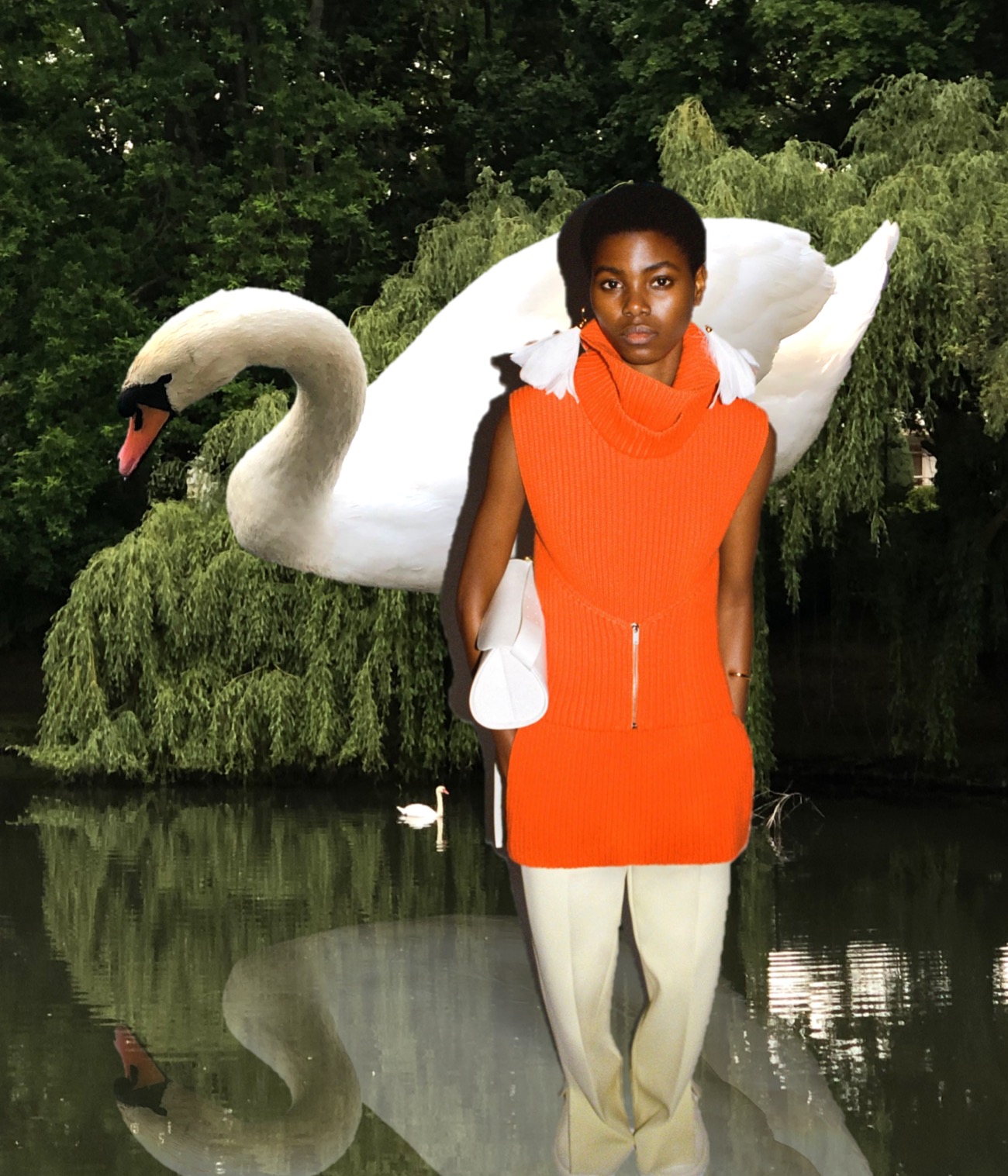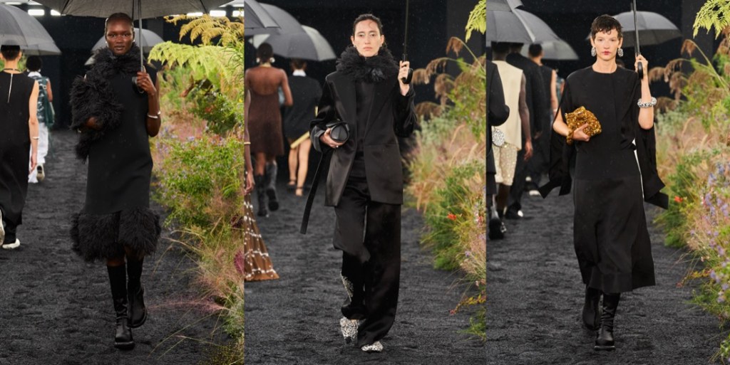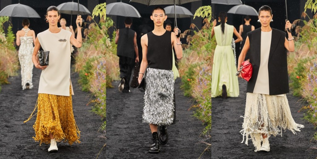 “We asked ourselves what feels modern,” Lucie Meier said, while discussing her and Luke Meier‘s spring-summer 2023 collection for Jil Sander. All of Milan has gone sexy, but the Meiers have a different take on modernity. “We looked at clashing glamour into very simple workwear, our fundamental very simple pattern cutting and then doing things that are more eccentric,” Luke added. That might mean something as straightforward as cutting cargo pants in silk satin or as extravagant as pairing a strapless confetti sequined evening dress with sneakers. The Meiers have always incorporated craft into their work, but whereas in the past macramé and crochet gave their clothes an earthy sensibility, this collection had a shiny gloss – the glam factor. A tank top and midi-kilt were embellished with cloud-shaped mirrors, and the lineup’s single print was lifted from the L.A. street grid after dark, the turned-on lights making a graphic pattern. A knit dress was made using thick yarn with baked-in sequins, and there were feathers galore: peeking from the hem of a sleeveless cotton dress, wrapped around the neck, decorating the large clutch that was one of their bags of the season. Most luscious was the group of finale looks, whose excesses of sequined knit fringe bounced like jellyfish as the models padded down the gravel runway that was actually a chic garden. The only thing that didn’t feel right was the abrupt rain.
