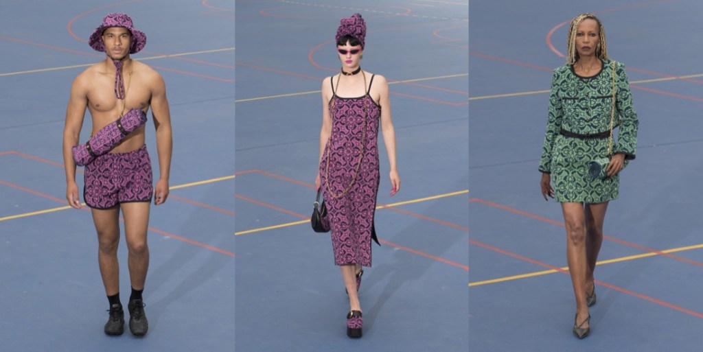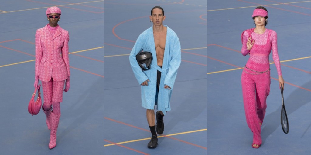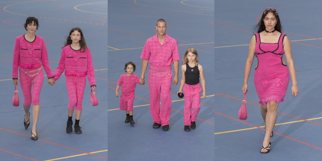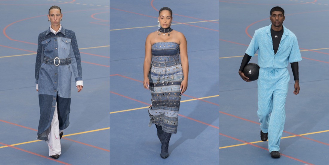 “It’s about being present. Putting down your phone. Being with your friends and people you love. Seeing the sun go down and feeling the wind and having a party. Not just a 10-minute show. With all these people coming, I just wanted to give them a good time and to feel like a community – and honestly I think that was really here. So this is what State of Soul means.” This is how Marine Serre explained her show title and concept shortly after that show had ended. The sun was indeed setting, and hundreds of guests, almost a thousand in fact, who had scored public tickets for the show were streaming into a party area where dancing would continue long into the night. When fashion designers elect to hold late night shows on the edge of Paris it is often borne of a wearisome creative insecurity – they wish to make the audience suffer for their art in order to feel reassured they have clout. This was entirely different. Serre was trying to reshape the fashion show in sync with the values transmitted by her brand; inclusive, ethical, positive, human. The show acted as opening ceremony for this gathering of the Serre community, upcycling the concept from sporting jamborees like the Olympics. The models, both professional and amateur, included athletes, families, friends, and a smattering of celebrities including Jorja Smith and Lourdes Leon. The idea of this being in theory a menswear event seemed laughably irrelevant, merely the result of Serre’s canny decision to choose the balmiest fashion week of Paris’s calendar to try this experiment in. The models walked the 400 meter circuit around us in groups that reflected the phases of the collection. The swimwear, made from recycled fibers, had been on offer for a while, the designer said, but never before in a show. Patched denim looks featuring Serre’s crescent moon mark segued into a section of bodycon pieces crafted from shaved pink terry, which on a mother and daughter were worn against two Chanel-esque jackets. This made you wonder whether Serre had even knocked on the door of Paris’s couture fashion week, given the huge amount of handicraft here. That was perhaps most exemplified by the piped dresses made of upcycled towels in green and pink. The fit was so excellent that I wondered if the fabrics had been treated in some way to add stiffness. These were followed by patched dresses made from upcycled T-shirts and a series of witchily alluring silk looks, some featuring prints of the upcycled jewelry pieces that were also part of the collection. Shoes included Serre’s own sneakers and molded sole pumps. “I always try to break the boundary of what the system is wanting you to do. It was the same with the upcycling. Everyone was telling me it was not going to work. I said ‘OK, but let’s try.’ The thing is, if no-one is trying to change the rules then they will never change… In the industry we tend to forget that.”